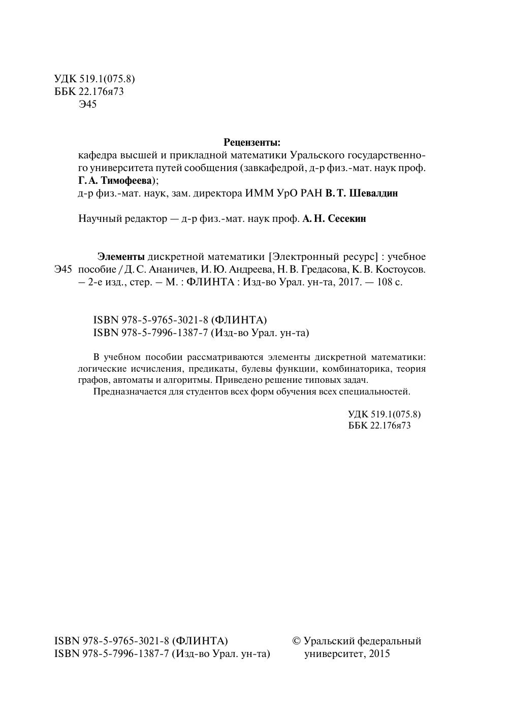 В учебном пособии рассматриваются элементы дискретной математики: логические исчисления, предикаты, булевы функции, комбинаторика, теория графов, автоматы и алгоритмы. Приведено решение типовых задач. Предназначается для студентов всех форм обучения всех специальностей.