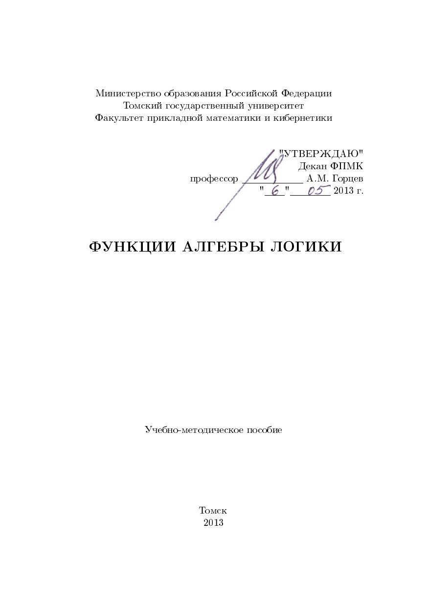 Данное учебно-методическое пособие предназначено для поддержки курса «Дискретная математика», читаемого на факультете прикладной математики и кибернетики Томского государственного университета. В пособии рассмотрены основные понятия теории булевых функций и функциональной полноты систем булевых функций. Каждый из разделов пособия сопровождается примерами и упражнениями. Учебное пособие предназначено для студентов физико-математических специальностей.