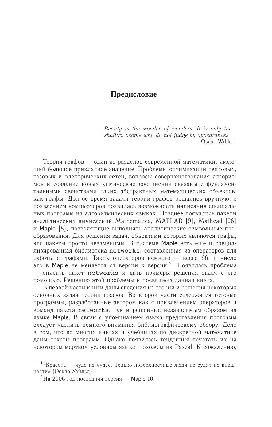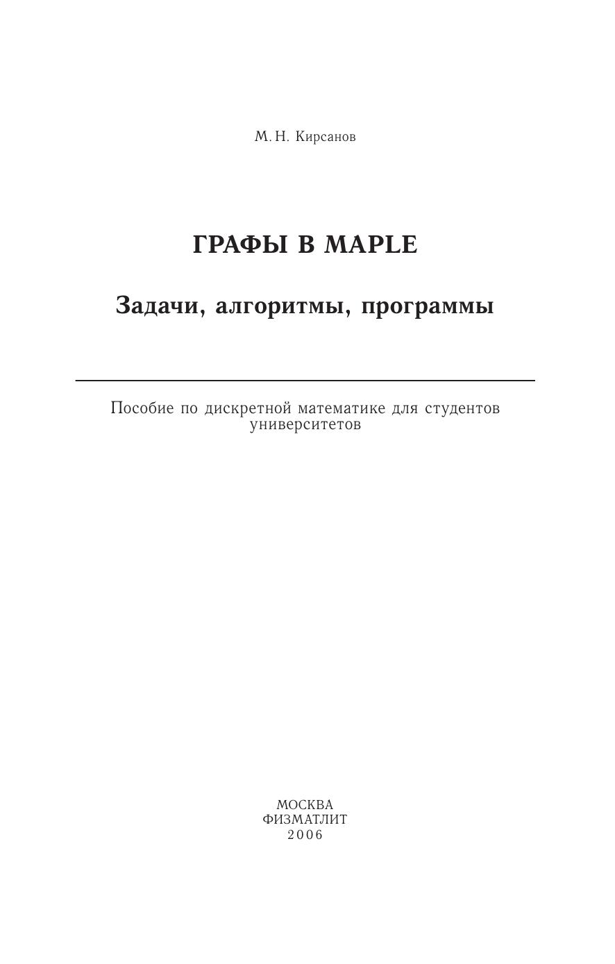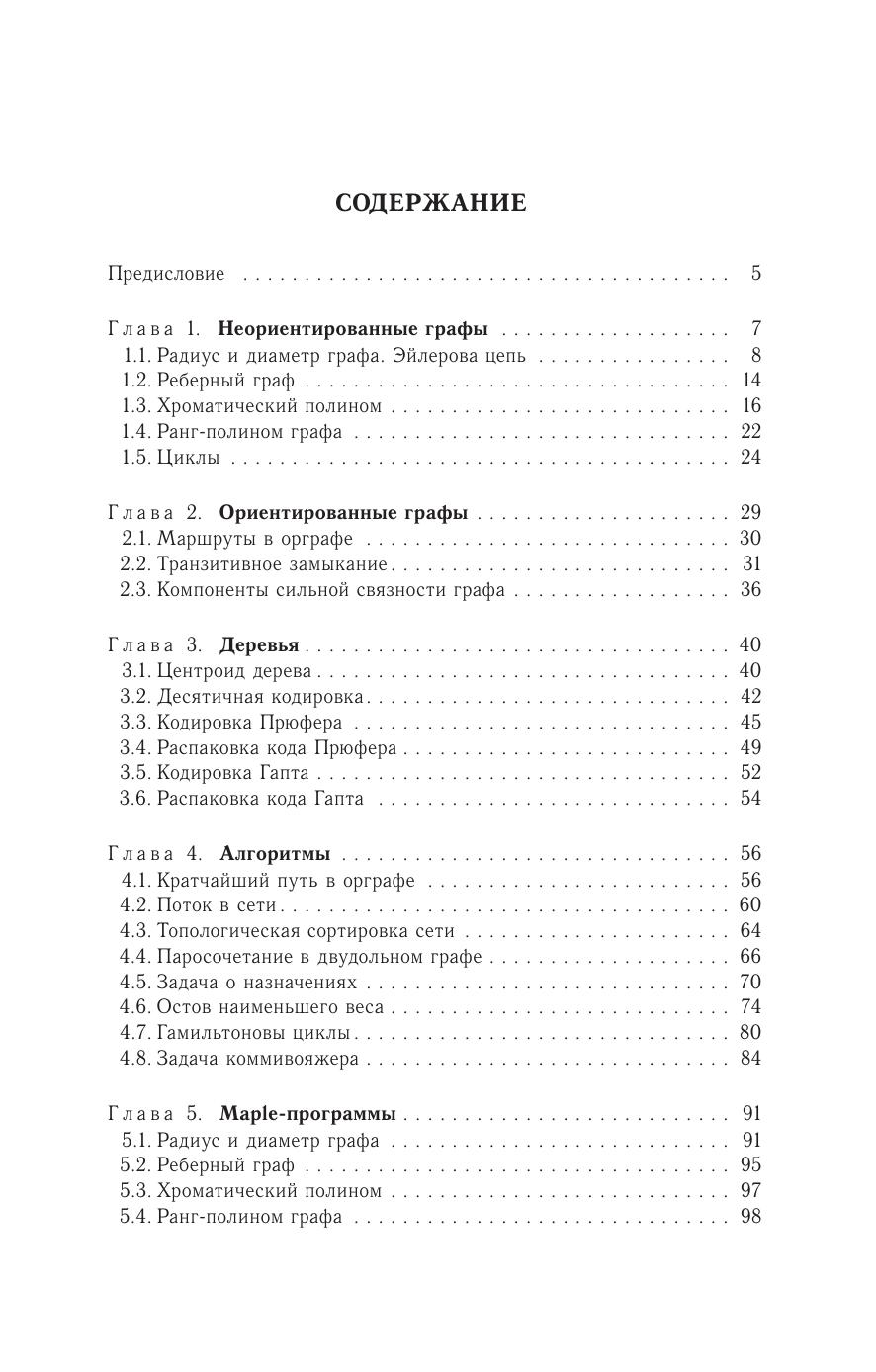 Изложены решения задач теории графов. Даны описания основных алгоритмов на графах и тексты более 30 программ. Приведены алгоритмы теории искусственного интеллекта (муравьиный алгоритм и метод отжига) для решения задачи коммивояжера. Предметно-именной указатель на 500 терминов и имен может служить справочником по теории графов и командам Maple. Книга предназначена как для очного, так и для дистанционного обучения. Для студентов и преподавателей университетов и технических вузов.