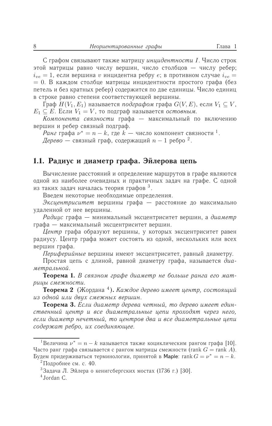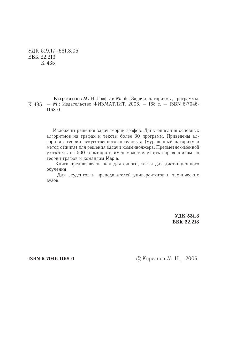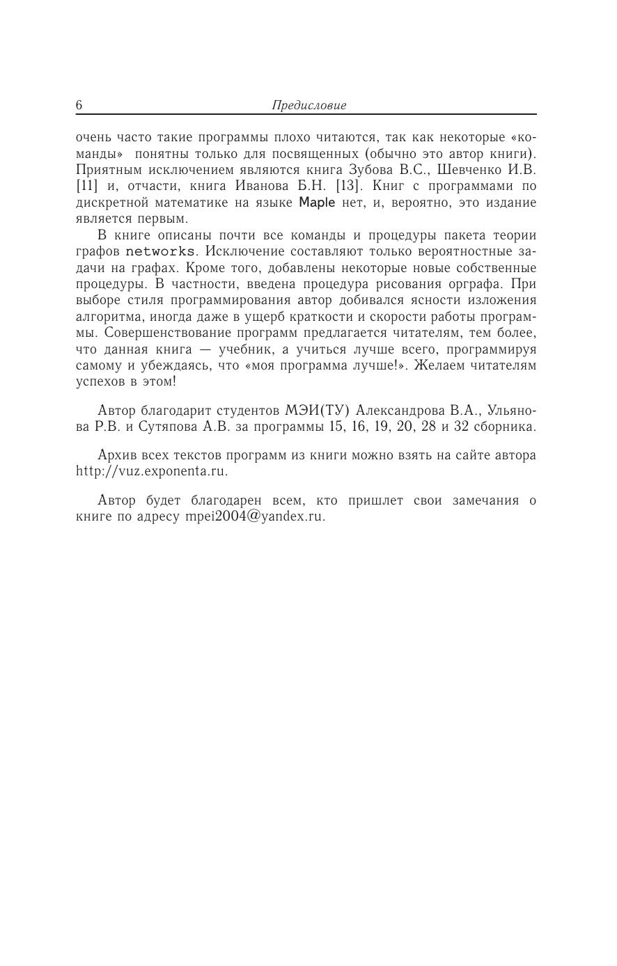 Изложены решения задач теории графов. Даны описания основных алгоритмов на графах и тексты более 30 программ. Приведены алгоритмы теории искусственного интеллекта (муравьиный алгоритм и метод отжига) для решения задачи коммивояжера. Предметно-именной указатель на 500 терминов и имен может служить справочником по теории графов и командам Maple. Книга предназначена как для очного, так и для дистанционного обучения. Для студентов и преподавателей университетов и технических вузов.