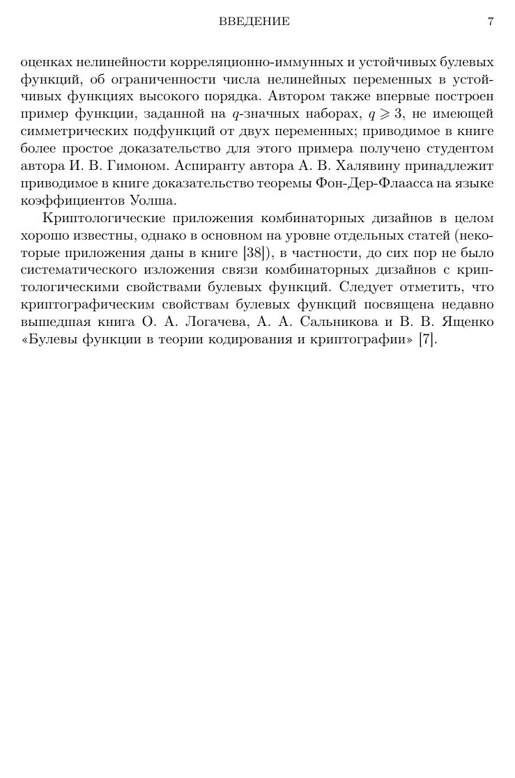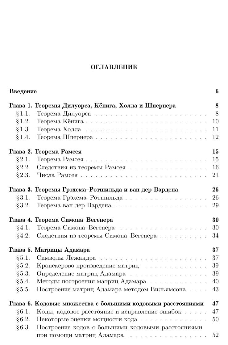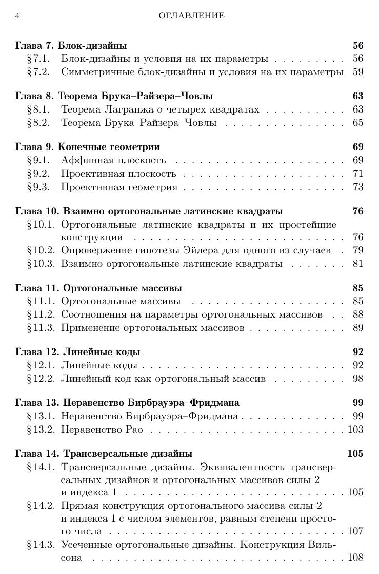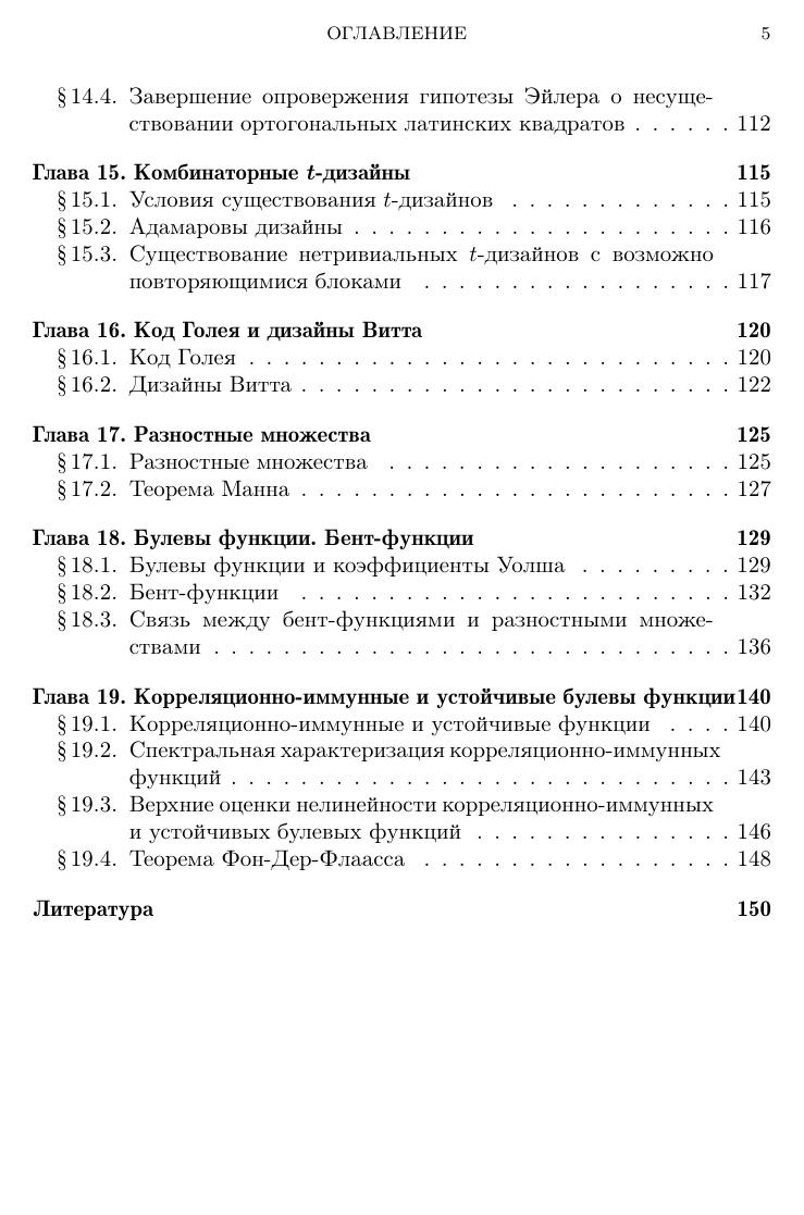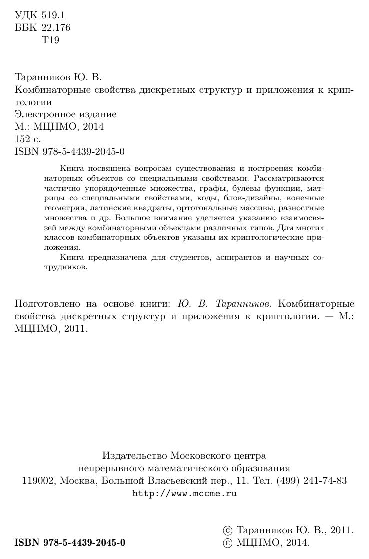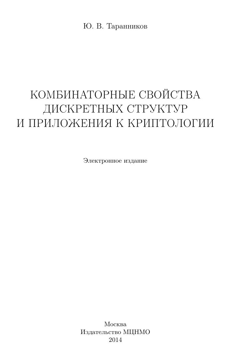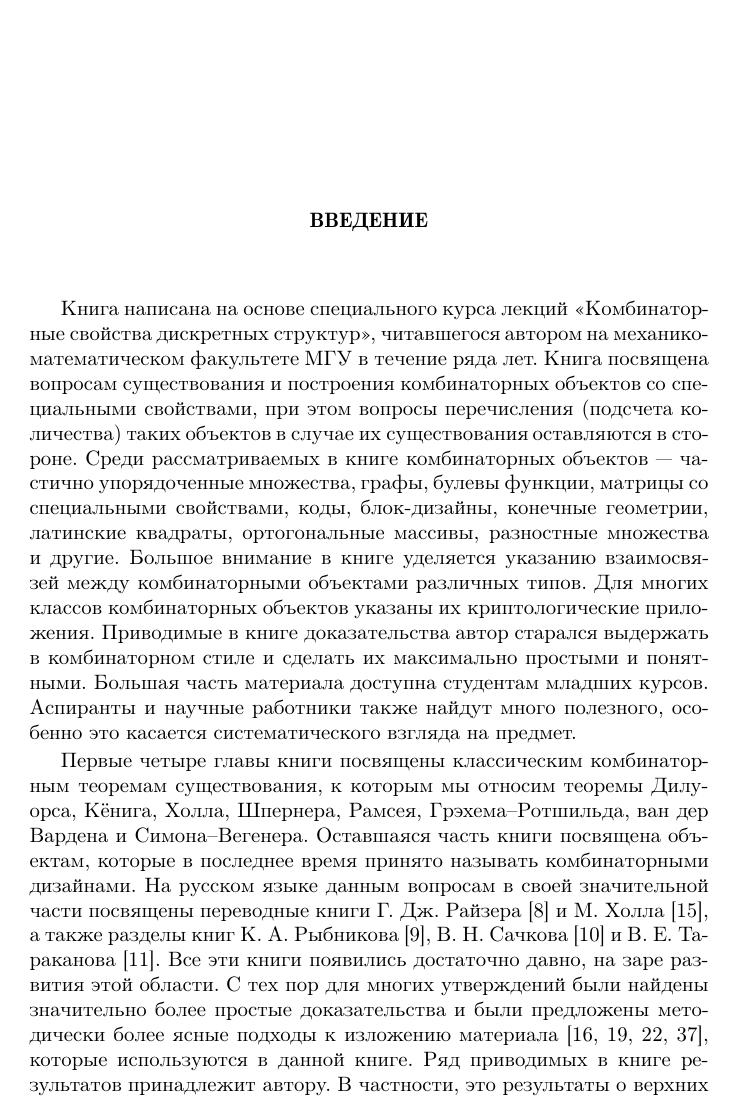 Книга посвящена вопросам существования и построения комбинаторных объектов со специальными свойствами. Рассматриваются частично упорядоченные множества, графы, булевы функции, матрицы со специальными свойствами, коды, блок-дизайны, конечные геометрии, латинские квадраты, ортогональные массивы, разностные множества и др. Большое внимание уделяется указанию взаимосвязей между комбинаторными объектами различных типов. Для многих классов комбинаторных объектов указаны их криптологические приложения. Книга предназначена для студентов, аспирантов и научных сотрудников.