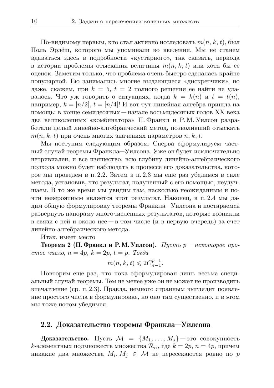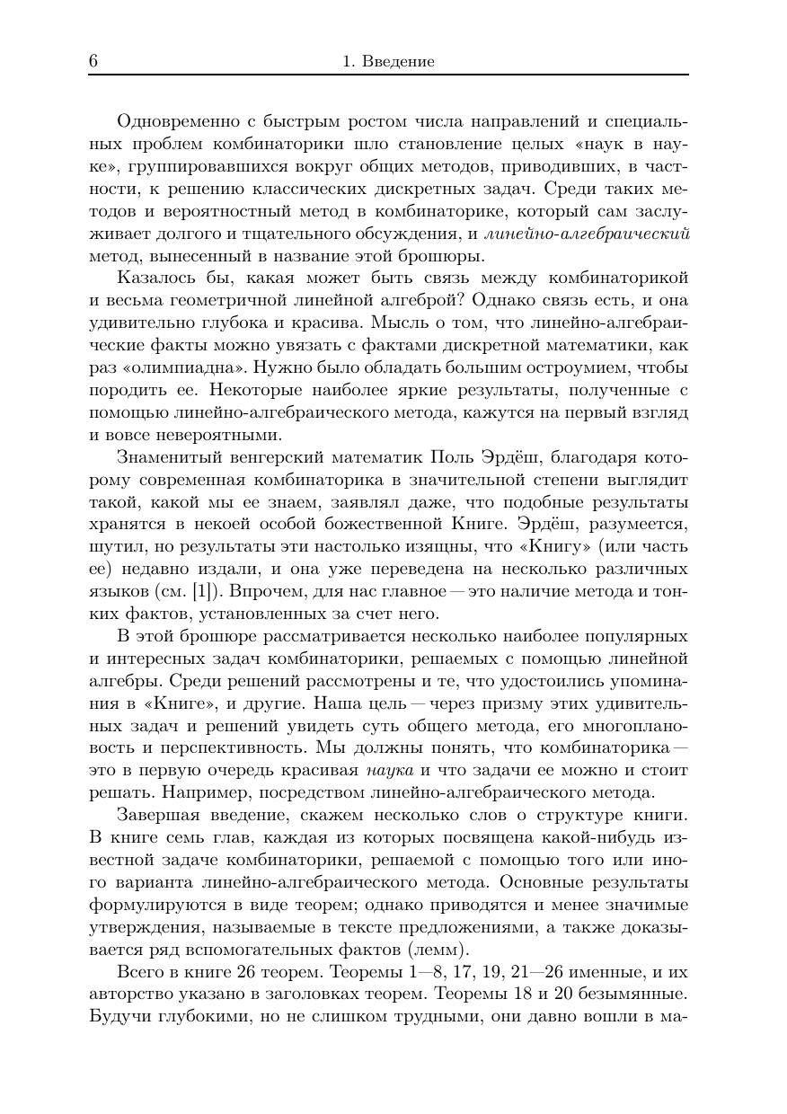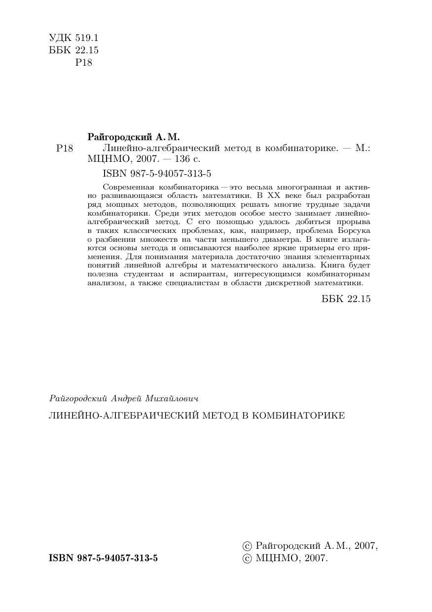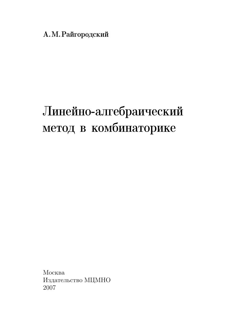 Современная комбинаторика — это весьма многогранная и активно развивающаяся область математики. В XX веке был разработан ряд мощных методов, позволяющих решать многие трудные задачи комбинаторики. Среди этих методов особое место занимает линейно-алгебраический метод. С его помощью удалось добиться прорыва в таких классических проблемах, как, например, проблема Борсука о разбиении множеств на части меньшего диаметра. В книге излагаются основы метода и описываются наиболее яркие примеры его применения. Для понимания материала достаточно знания элементарных понятий линейной алгебры и математического анализа. Книга будет полезна студентам и аспирантам, интересующимся комбинаторным анализом, а также специалистам в области дискретной математики.