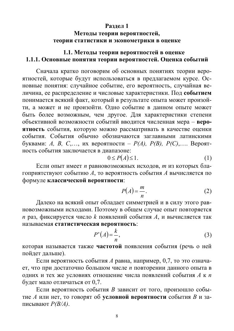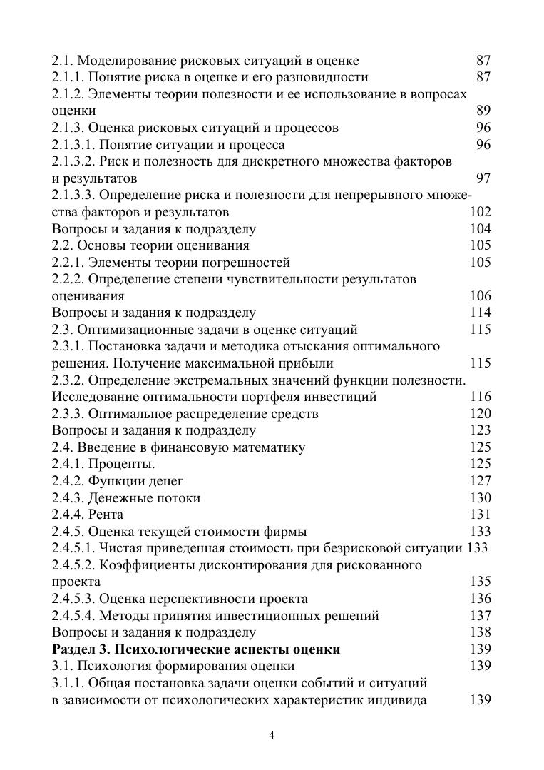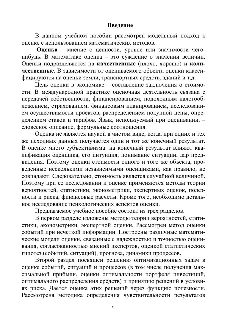 В учебном пособии представлена база моделей, методик и алгоритмов по оценке стоимости, риска, полезности, ущерба, прибыли, текущей стоимости фирмы, перспективности проекта, по решению инвестиционных задач, задач страхования, согласования результатов экспертизы, динамики процессов, защиты процедуры оценивания. Используется аппарат теории вероятностей, статистики, эконометрики, экспертных оценок, некоторых разделов исследования операций и финансовой математики. Рассмотрена оценка в условиях риска и нечеткой информации. Приведены исследования психологических аспектов оценки. Изложенный материал представляет собой систематизацию имеющихся и разработанных лично автором моделей и методов.