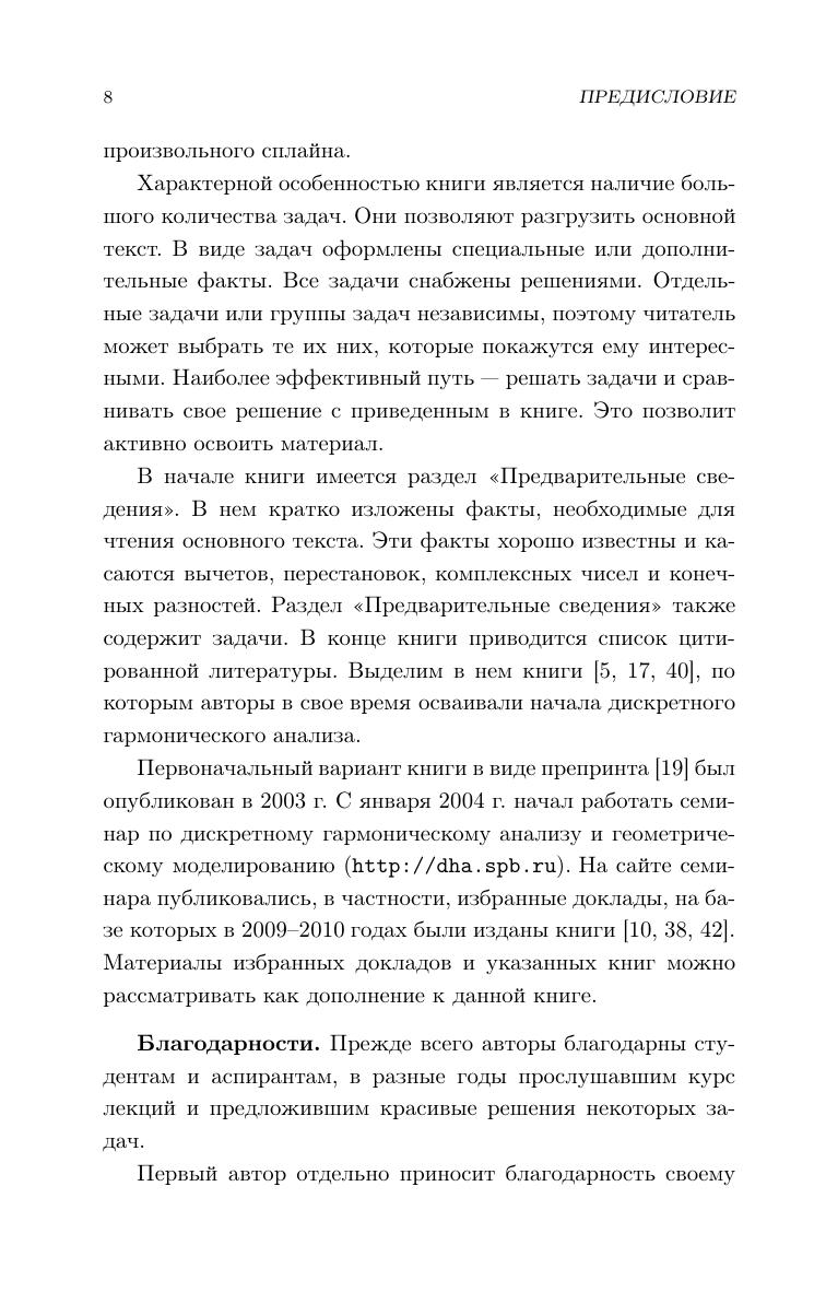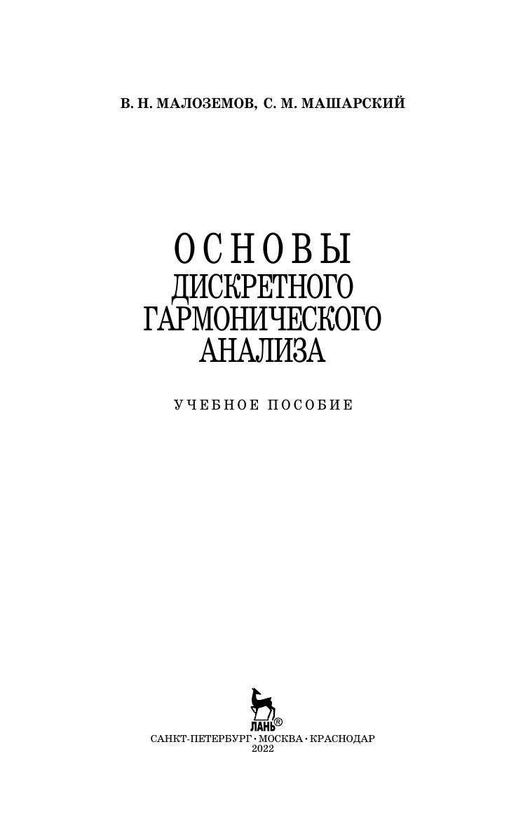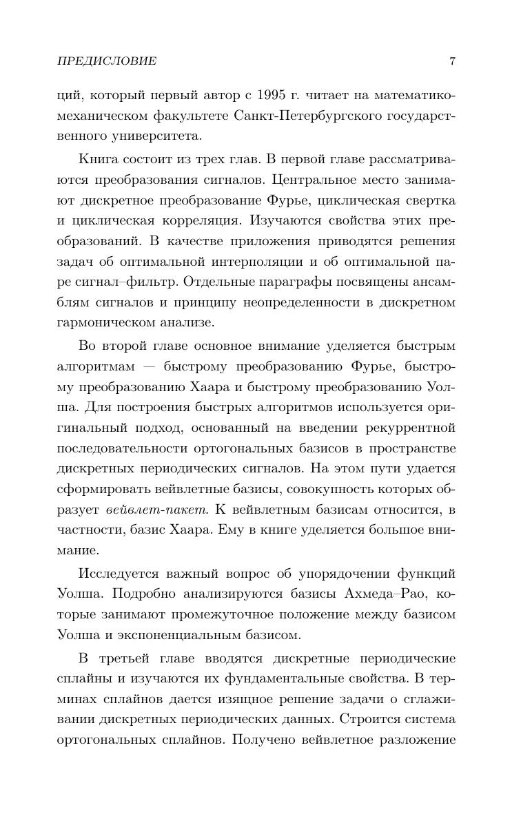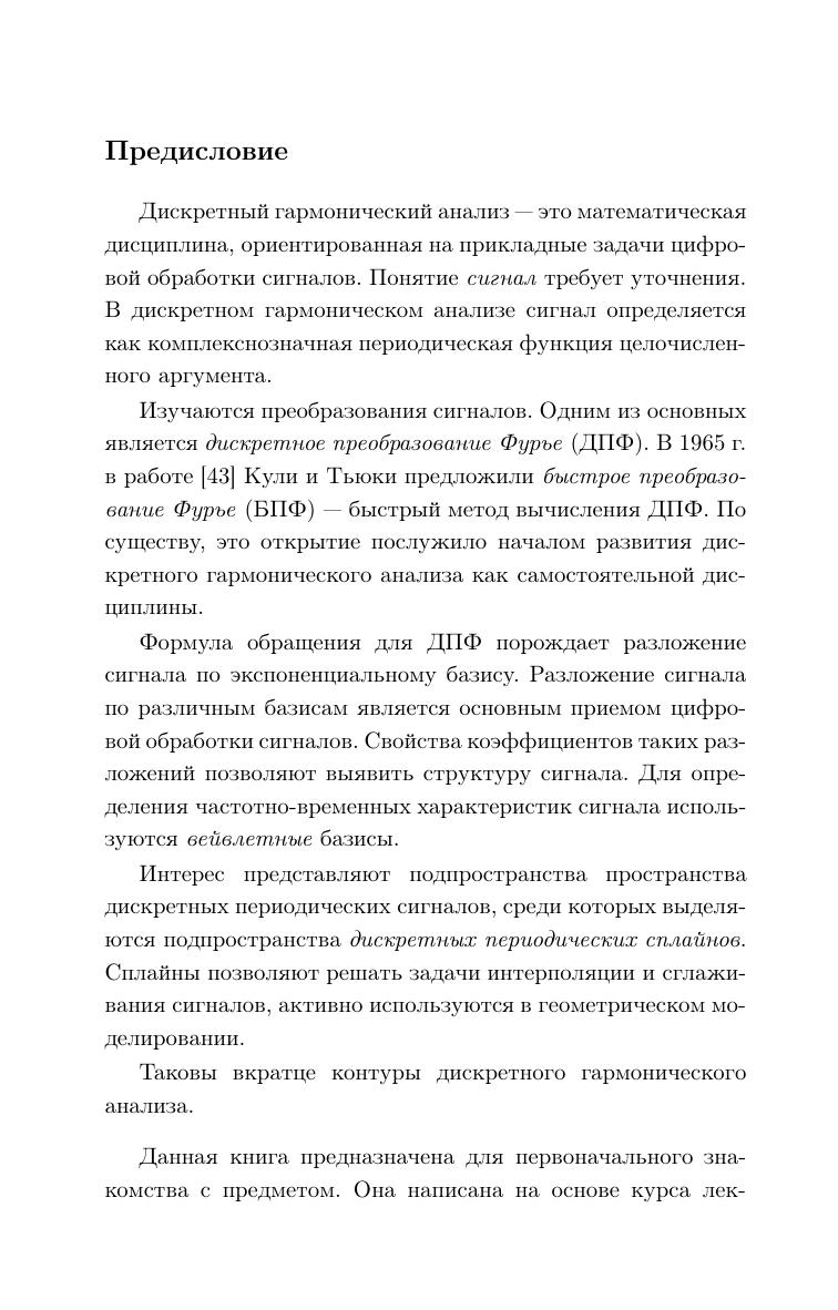 Дискретный гармонический анализ это математическая дисциплина, ориентированная на прикладные задачи цифровой обработки сигналов. Основным приемом цифровой обработки сигналов является разложение сигнала по различным базисам и анализ свойств коэффициентов таких разложений. Данная книга предназначена для первоначального знакомства с предметом. В ней изучаются быстрое преобразование Фурье, быстрое преобразование Уолша, быстрое преобразование Хаара, базисы Ахмеда–Рао, вейвлетные базисы. Отдельная глава посвящена дискретным периодическим сплайнам и их применению к оптимальной интерполяции и сглаживанию сигналов. Книга содержит большое количество дополнительных задач (с решениями), которые помогут активно освоить материал. Для студентов математических специальностей и специалистов в области цифровой обработки сигналов.