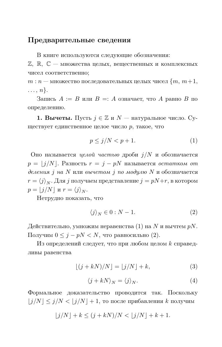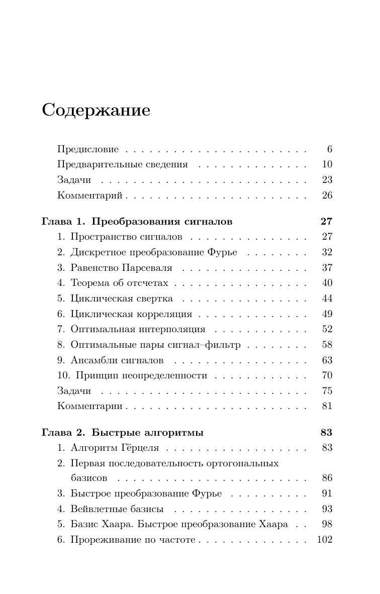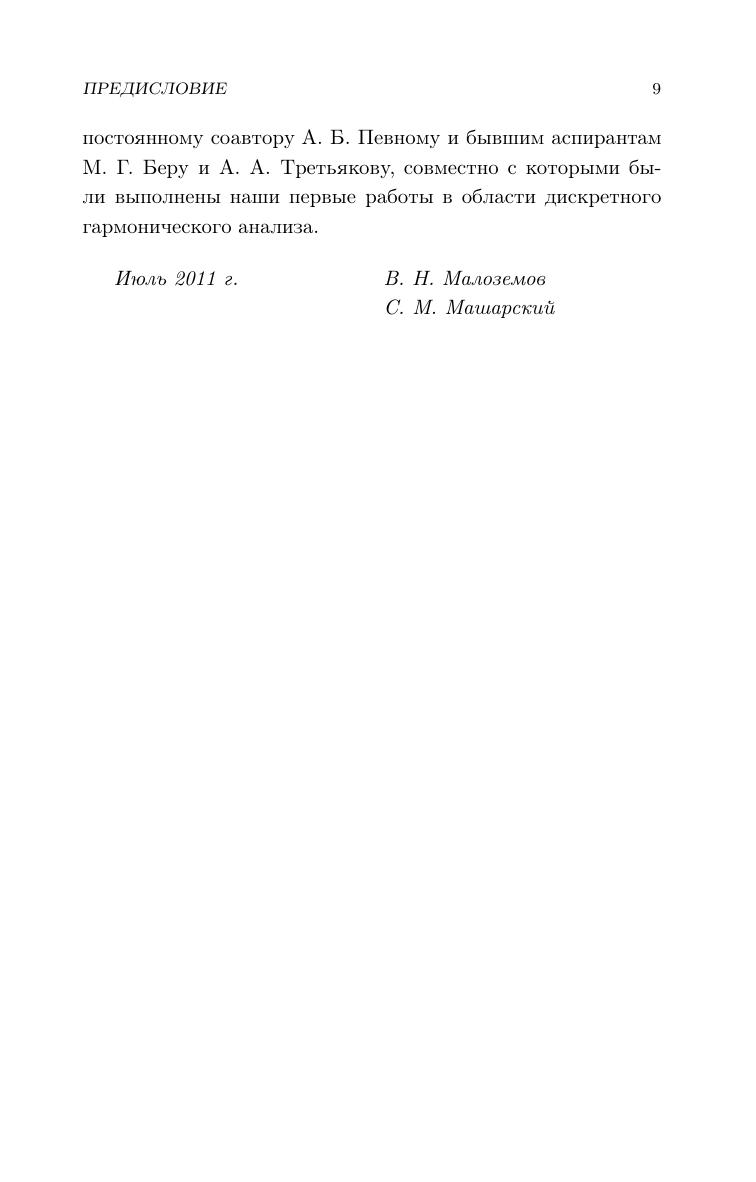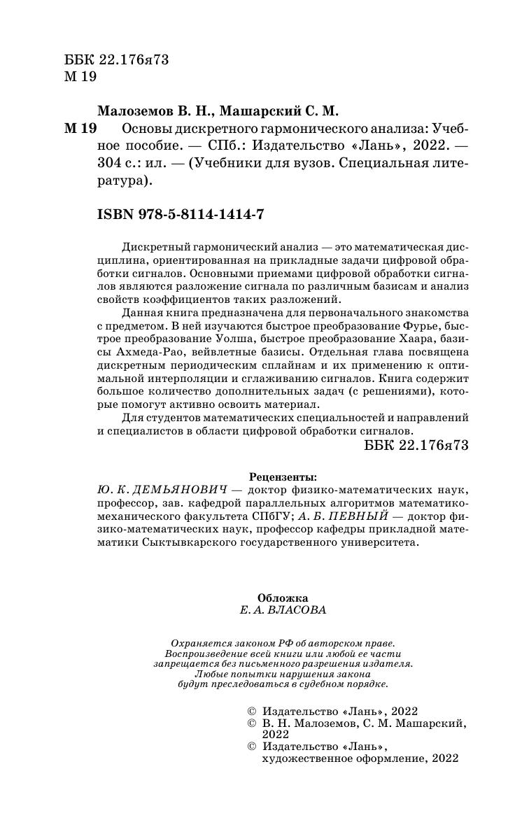 Дискретный гармонический анализ это математическая дисциплина, ориентированная на прикладные задачи цифровой обработки сигналов. Основным приемом цифровой обработки сигналов является разложение сигнала по различным базисам и анализ свойств коэффициентов таких разложений. Данная книга предназначена для первоначального знакомства с предметом. В ней изучаются быстрое преобразование Фурье, быстрое преобразование Уолша, быстрое преобразование Хаара, базисы Ахмеда–Рао, вейвлетные базисы. Отдельная глава посвящена дискретным периодическим сплайнам и их применению к оптимальной интерполяции и сглаживанию сигналов. Книга содержит большое количество дополнительных задач (с решениями), которые помогут активно освоить материал. Для студентов математических специальностей и специалистов в области цифровой обработки сигналов.