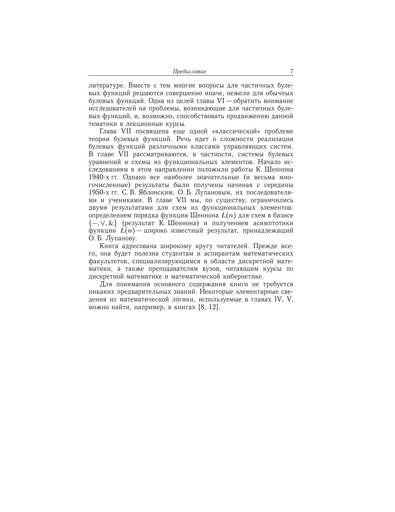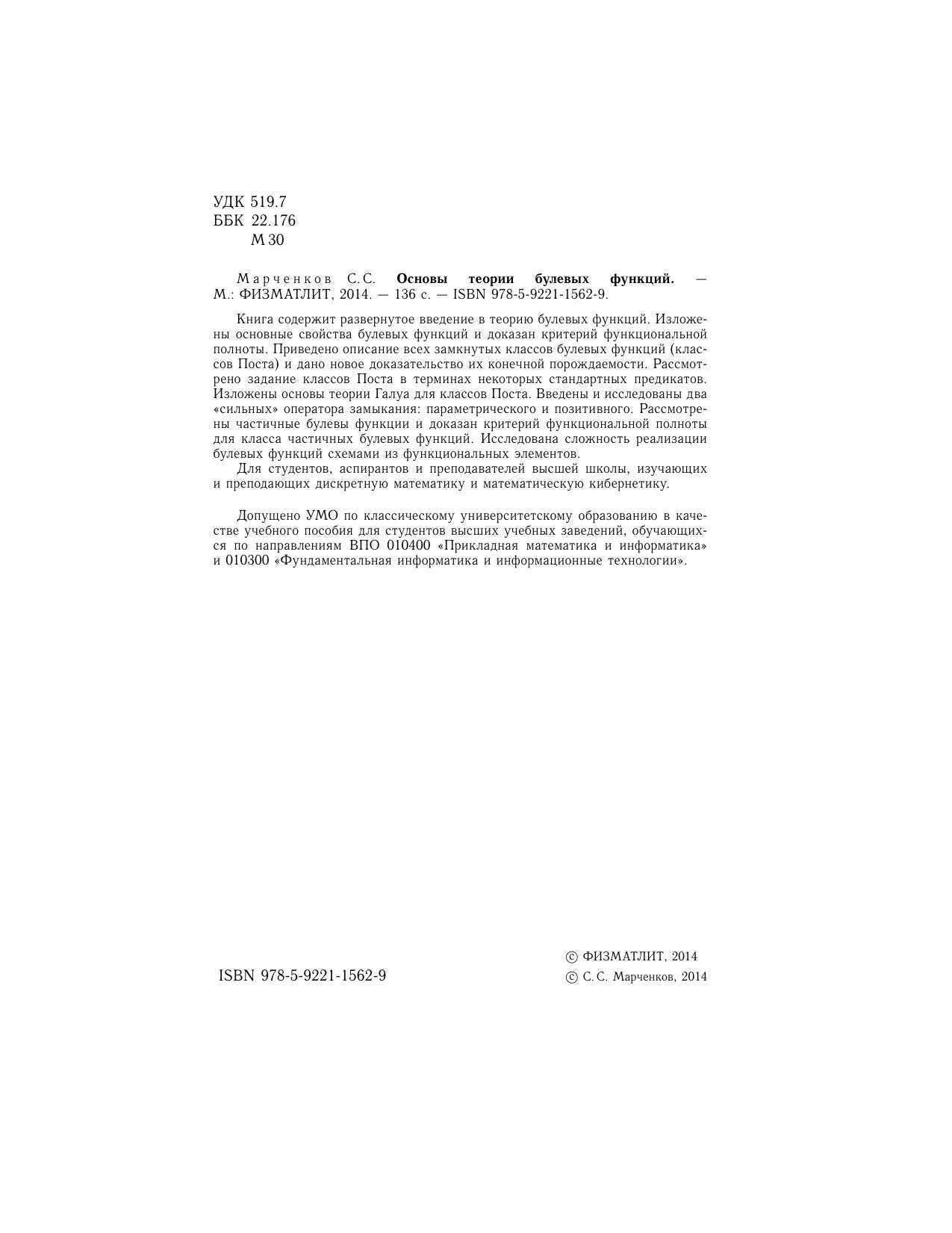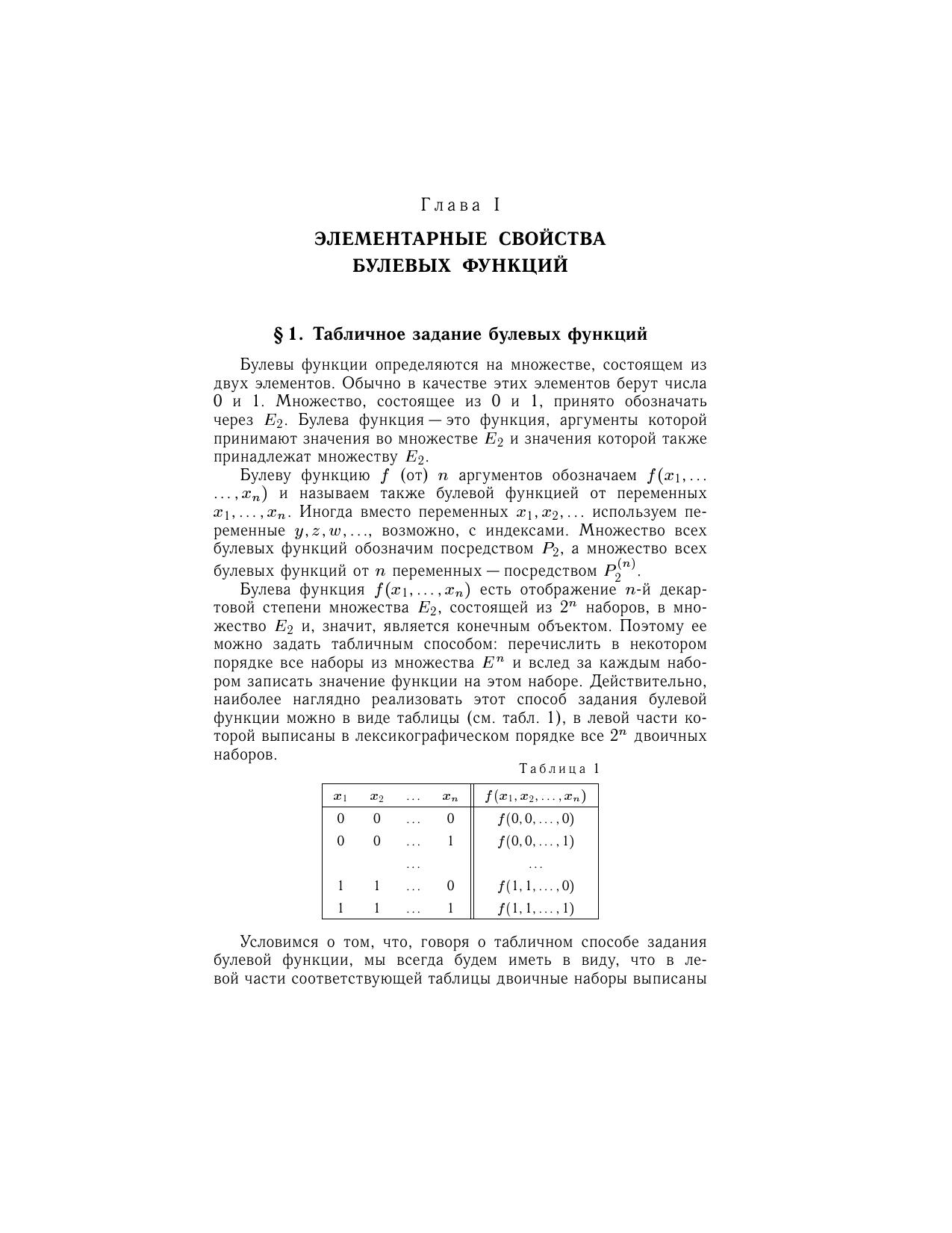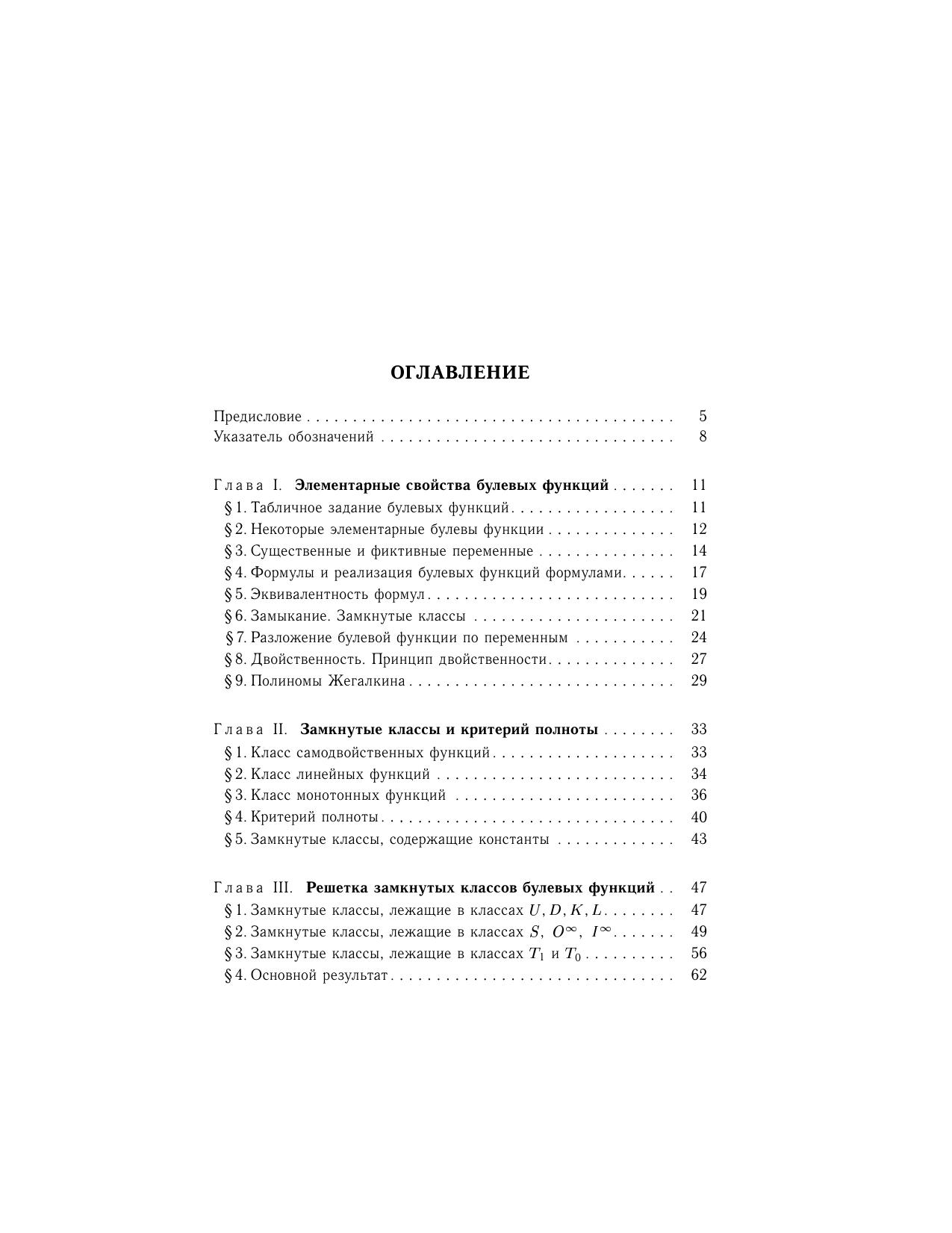 Книга содержит развернутое введение в теорию булевых функций. Изложе-ны основные свойства булевых функций и доказан критерий функциональнойполноты. Приведено описание всех замкнутых классов булевых функций (клас-сов Поста) и дано новое доказательство их конечной порождаемости. Рассмот-рено задание классов Поста в терминах некоторых стандартных предикатов. Изложены основы теории Галуа для классов Поста. Введены и исследованы два «сильных» оператора замыкания: параметрического и позитивного. Рассмотрены частичные булевы функции и доказан критерий функциональной полноты для класса частичных булевых функций. Исследована сложность реализации булевых функций схемами из функциональных элементов. Для студентов, аспирантов и преподавателей высшей школы, изучающих и преподающих дискретную математику и математическую кибернетику.