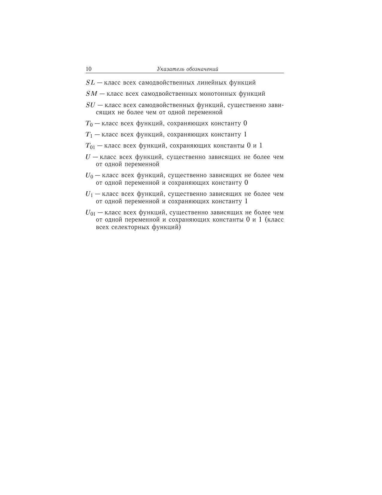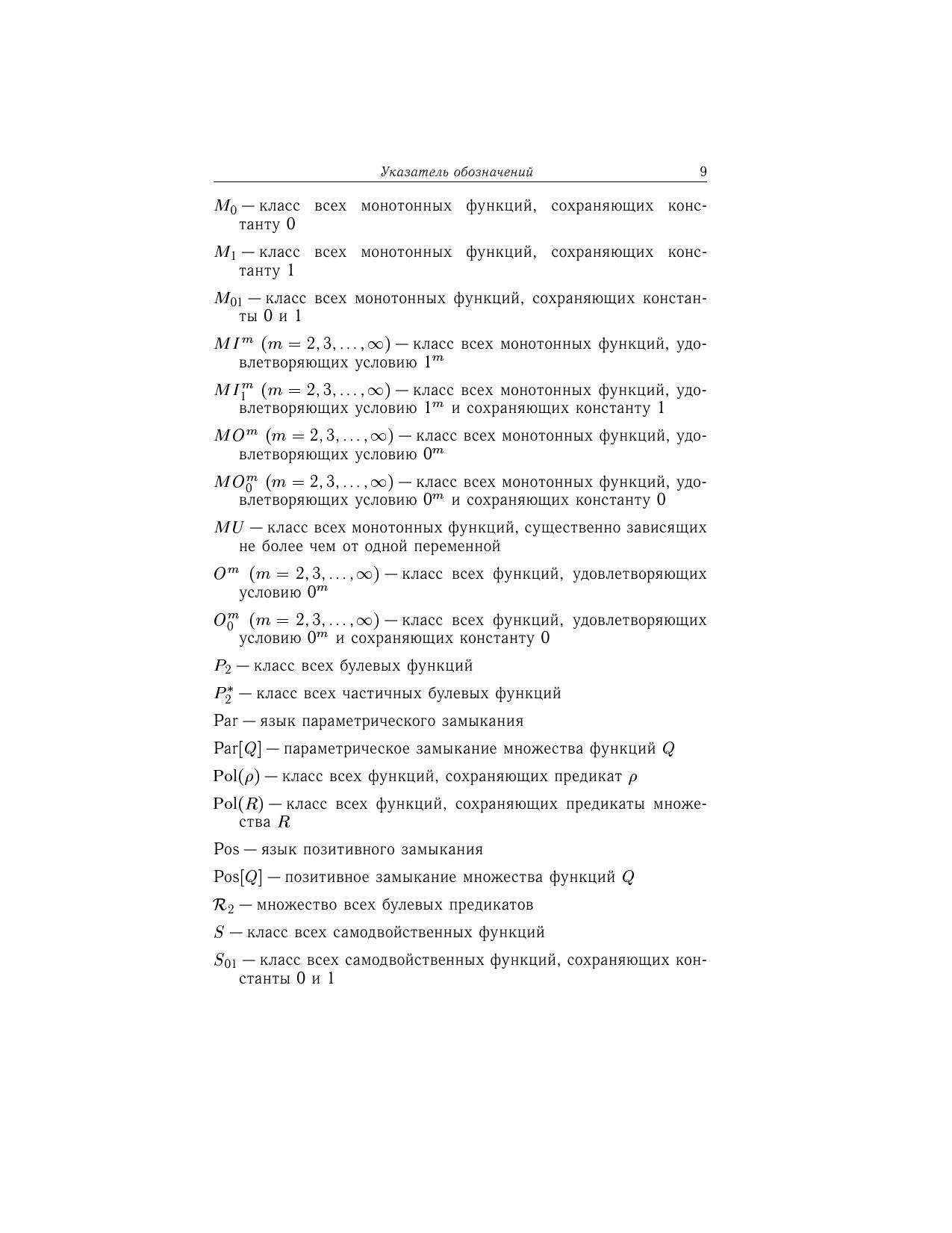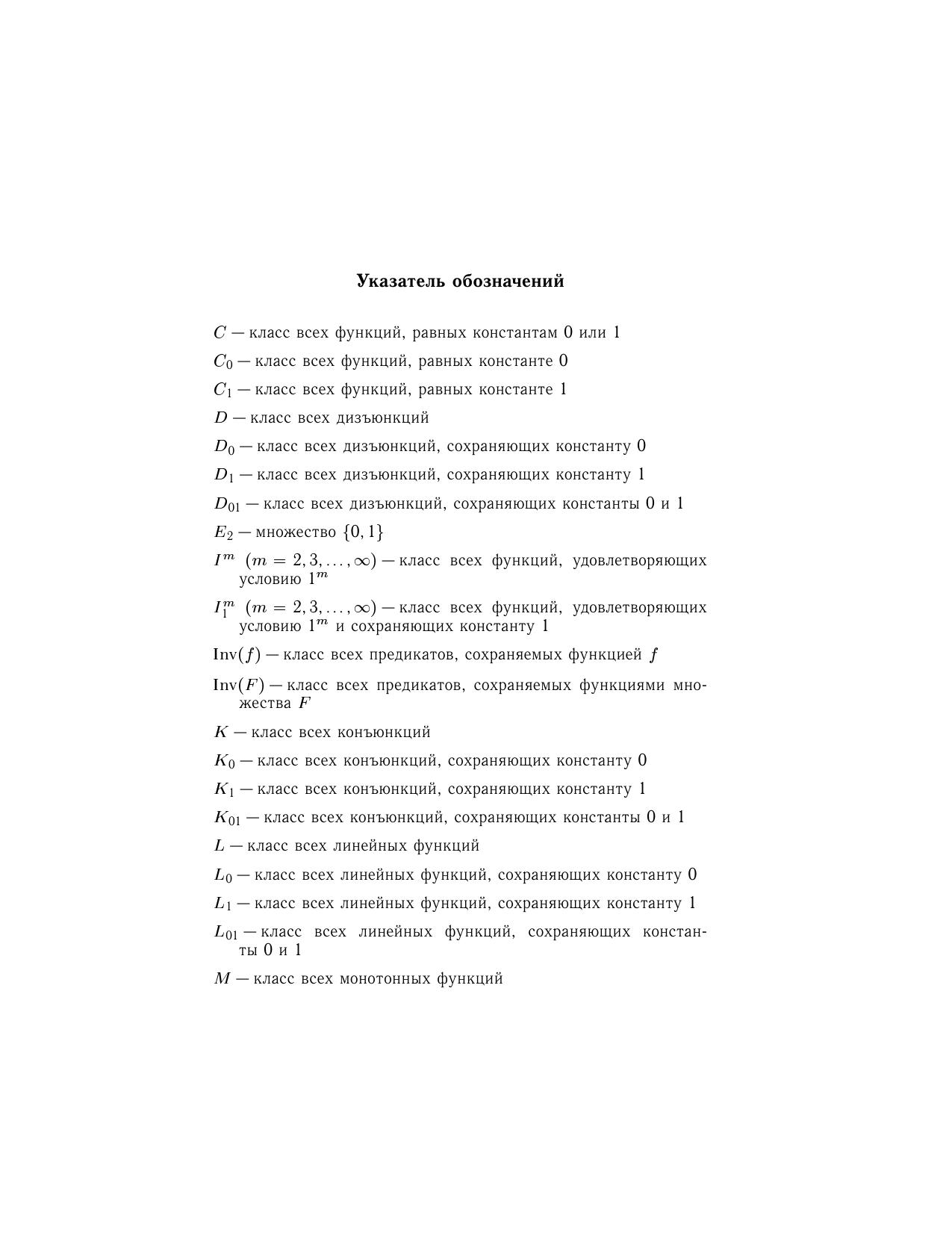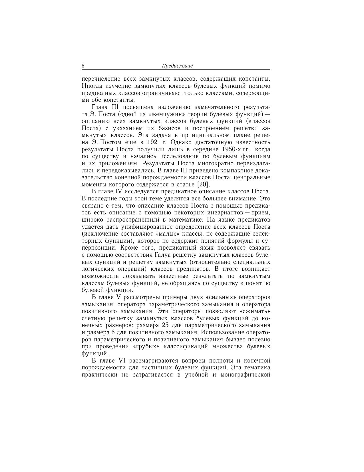Книга содержит развернутое введение в теорию булевых функций. Изложе-ны основные свойства булевых функций и доказан критерий функциональнойполноты. Приведено описание всех замкнутых классов булевых функций (клас-сов Поста) и дано новое доказательство их конечной порождаемости. Рассмот-рено задание классов Поста в терминах некоторых стандартных предикатов. Изложены основы теории Галуа для классов Поста. Введены и исследованы два «сильных» оператора замыкания: параметрического и позитивного. Рассмотрены частичные булевы функции и доказан критерий функциональной полноты для класса частичных булевых функций. Исследована сложность реализации булевых функций схемами из функциональных элементов. Для студентов, аспирантов и преподавателей высшей школы, изучающих и преподающих дискретную математику и математическую кибернетику.