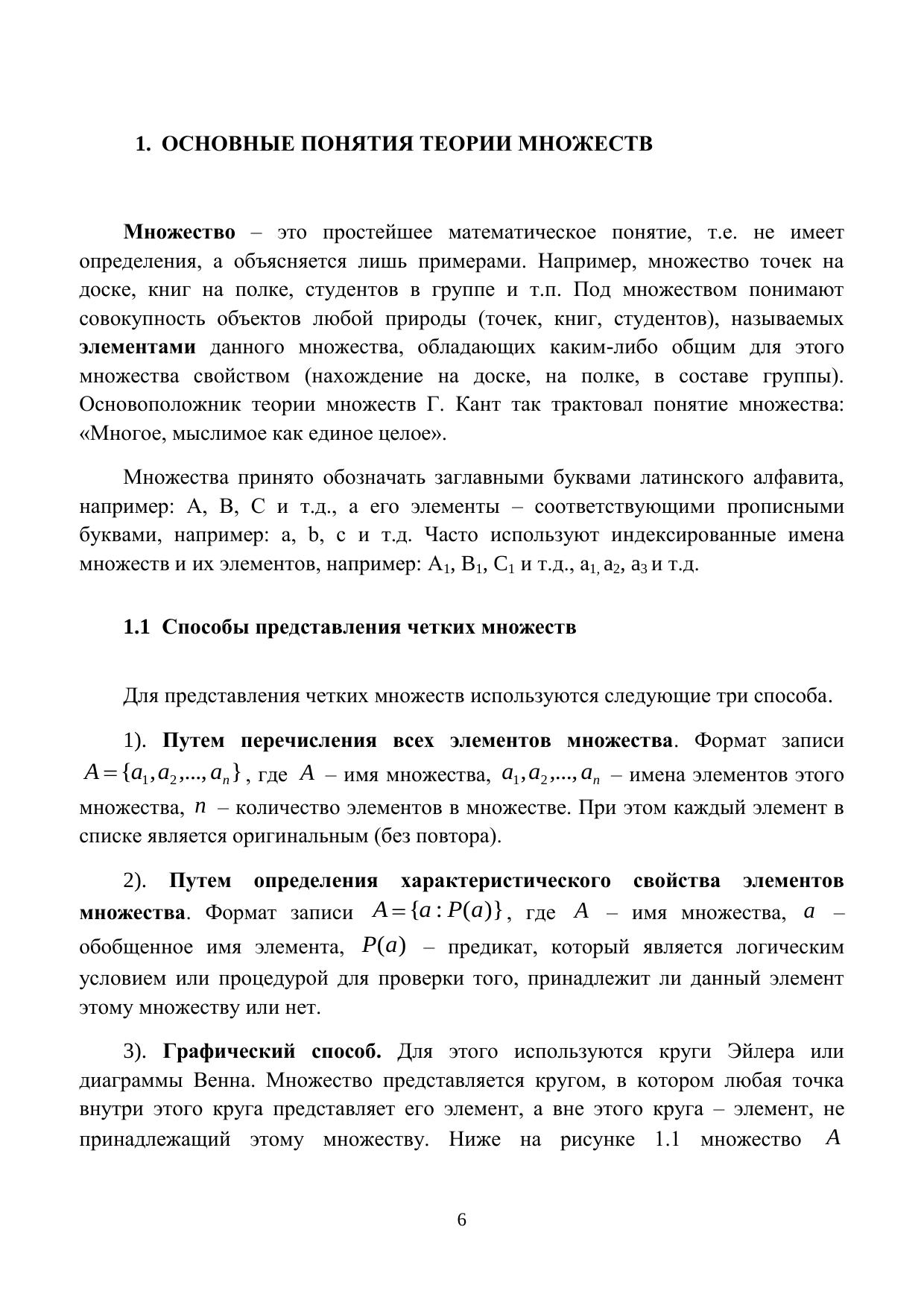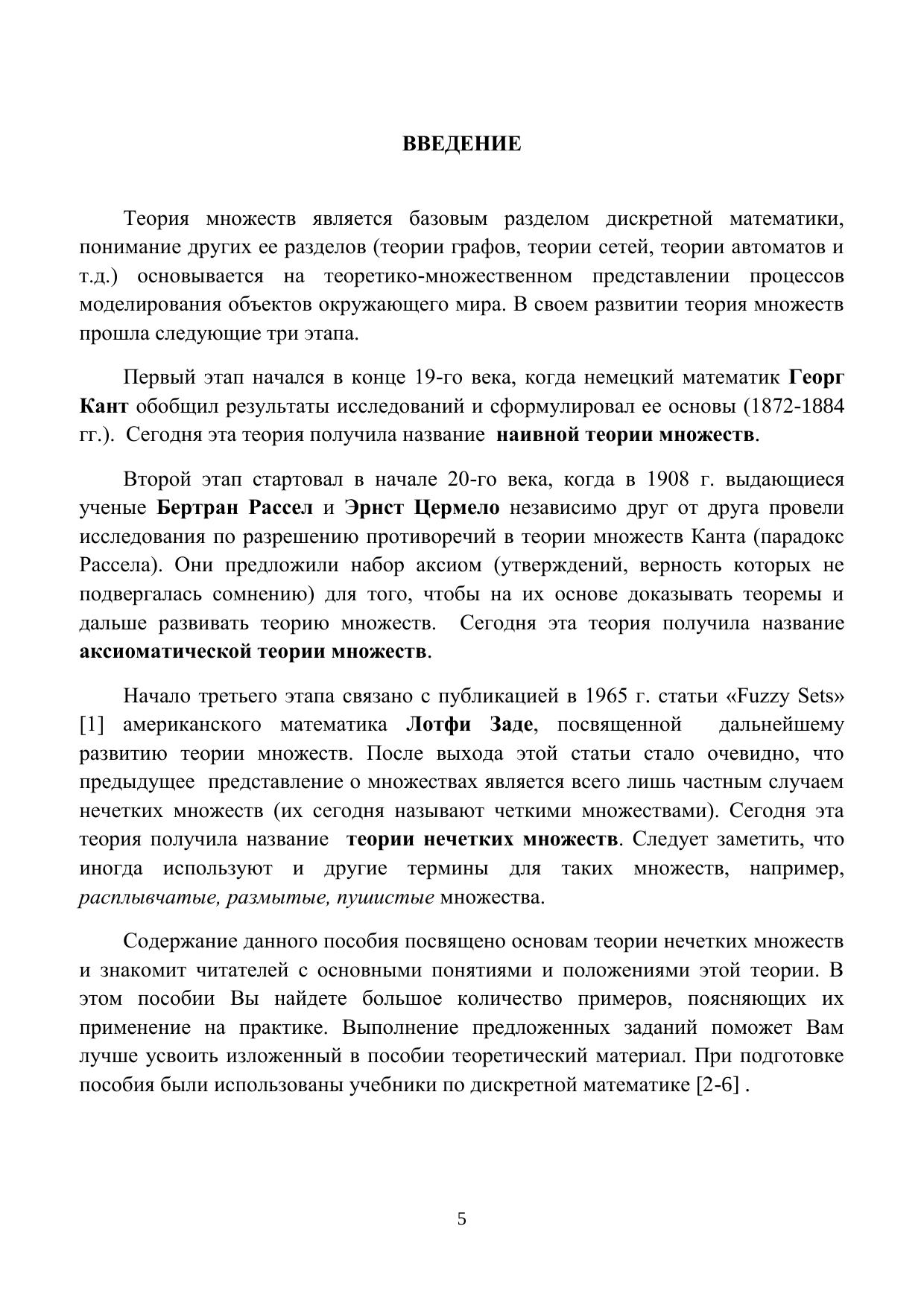 Пособие содержит теоретический материал по основам современной теории множеств (теории нечетких множеств по Заде), проиллюстрированный многочисленными примерами. Пособие служит дополнительным материалом к лекциям по дискретной математике и предназначено для закрепления знаний и умений на практике. Пособие содержит вопросы и задания для самостоятельной работы студентов, выполнение которых поможет подготовиться к текущему и рубежному контролю в 1-ом модуле дисциплины "Дискретная математика" (решение практических задач, компьютерный тест, контрольная работа).