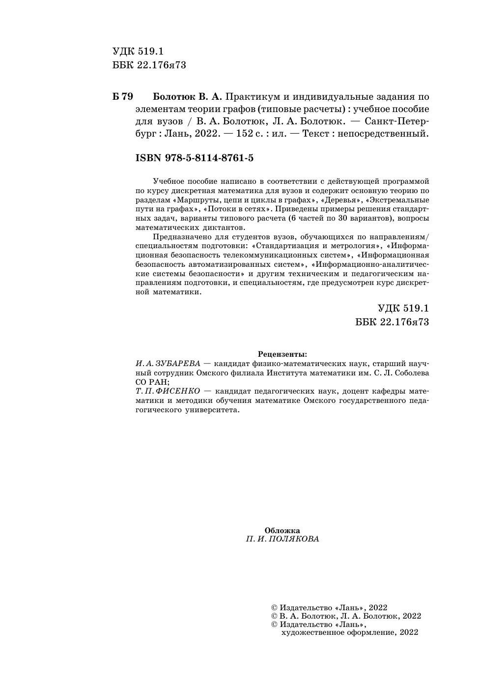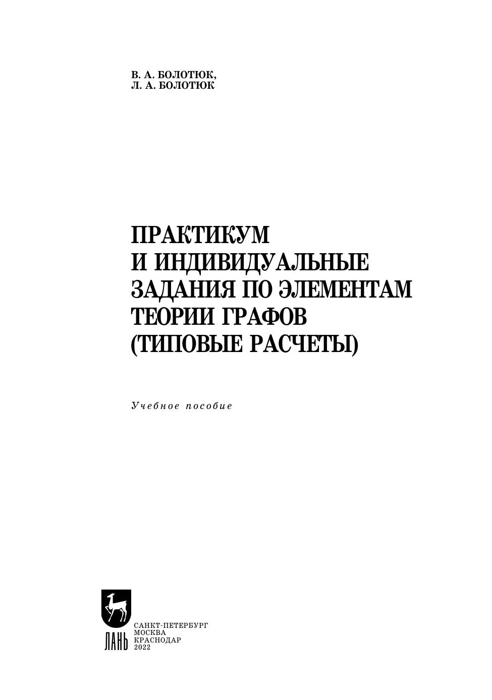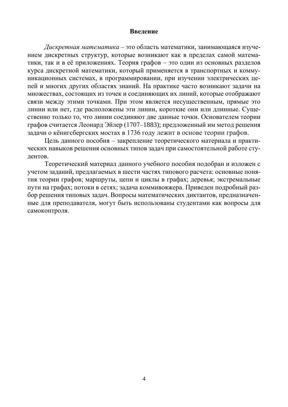 Учебное пособие написано в соответствии с действующей программой по курсу дискретная математика для вузов и содержит основную теорию по разделам «Маршруты, цепи и циклы в графах», «Деревья», «Экстремальные пути на графах», «Потоки в сетях». Приведены примеры решения стандарт-ных задач, варианты типового расчета (6 частей по 30 вариантов), вопросы математических диктантов.