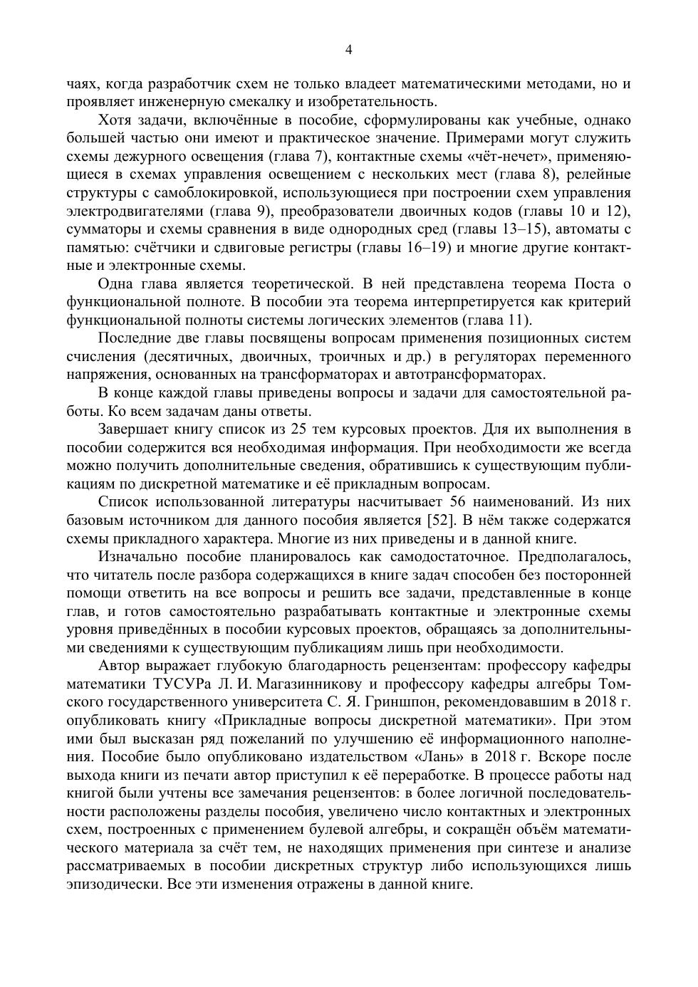 В пособии 22 раздела. Из них первые четыре посвящены математическим темам: комбинаторике, булевой алгебре и булеву дифференциальному исчислению. В двух разделах представлены необходимые сведения о реле, тумблерах, трансформаторах, электродвигателях, транзисторах, резисторах, конденсаторах, диодах и др., составляющих основу технической среды, в которой применяется дискретная математика. Пять разделов посвящены контактным структурам, десять — электронным. В них рассматриваются методы логического синтеза контактных структур, комбинационных схем и автоматов с памятью. Некоторое внимание уделено синтезу однородных сред ленточного типа: управление освещением с многих мест, схемы «чёт-нечёт», схемы сравнения и др. В последнем разделе приведён список тем курсовых проектов.