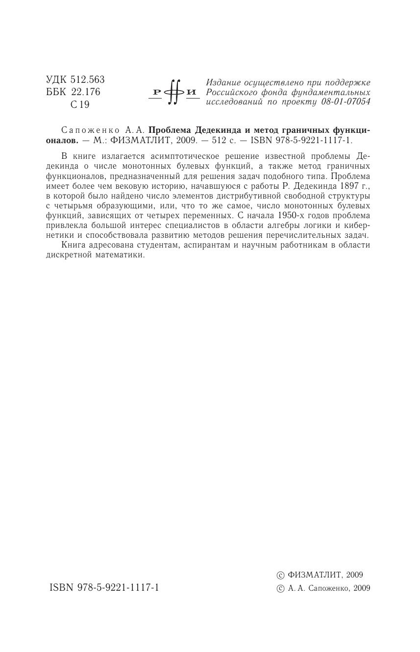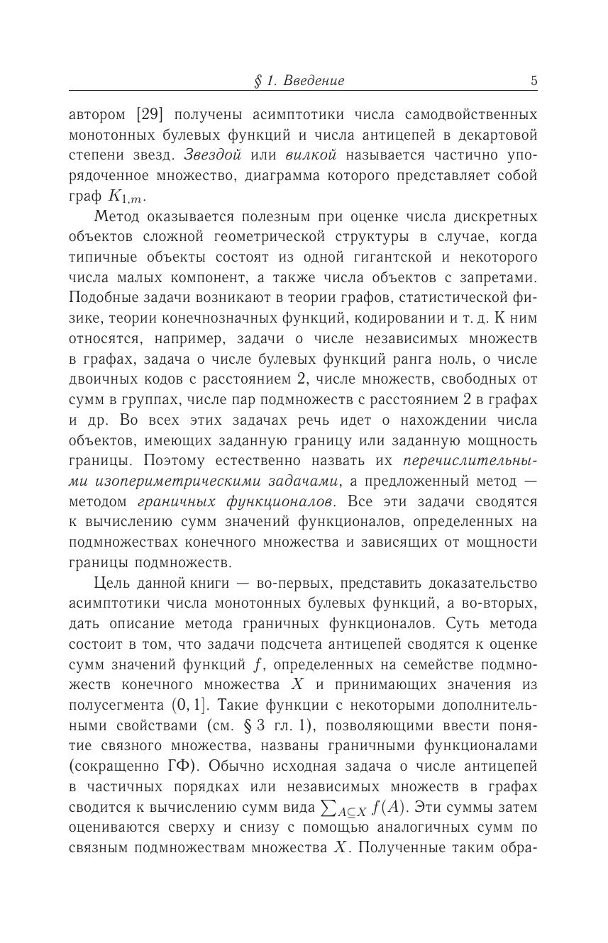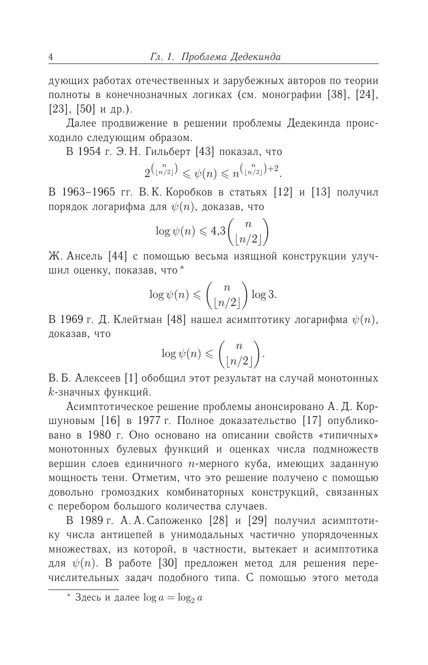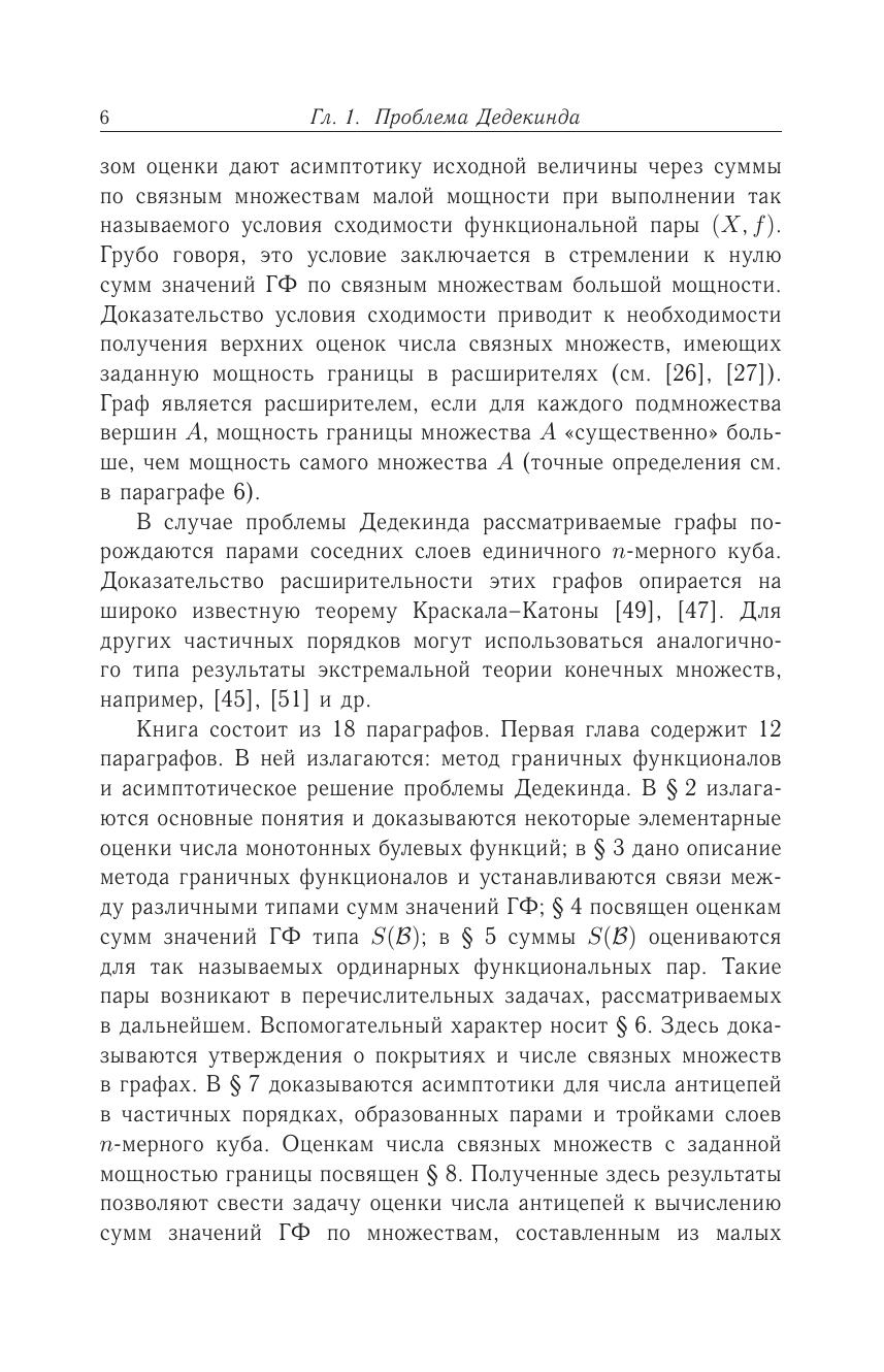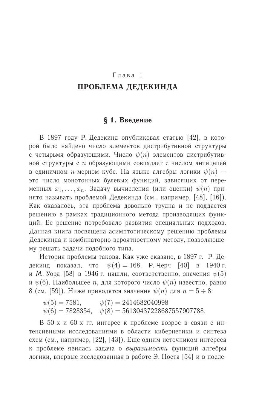 В книге излагается асимптотическое решение известной проблемы Дедекинда о числе монотонных булевых функций, а также метод граничных функционалов, предназначенный для решения задач подобного типа. Проблема имеет более чем вековую историю, начавшуюся с работы Р. Дедекинда 1897 г., в которой было найдено число элементов дистрибутивной свободной структуры с четырьмя образующими, или, что то же самое, число монотонных булевых функций, зависящих от четырех переменных. С начала 1950-х годов проблема привлекла большой интерес специалистов в области алгебры логики и кибернетики и способствовала развитию методов решения перечислительных задач.Книга адресована студентам, аспирантам и научным работникам в области дискретной математики.