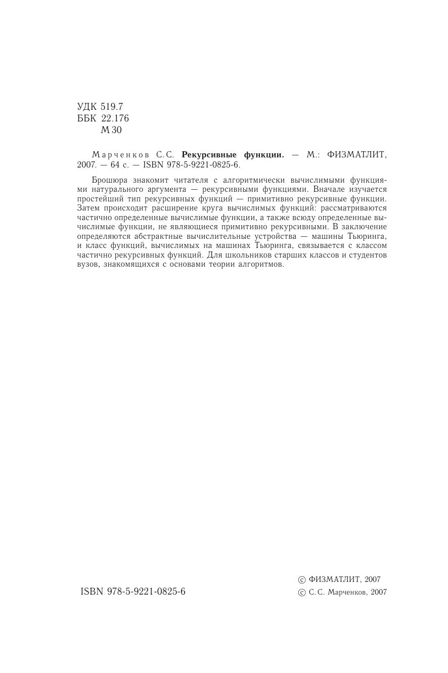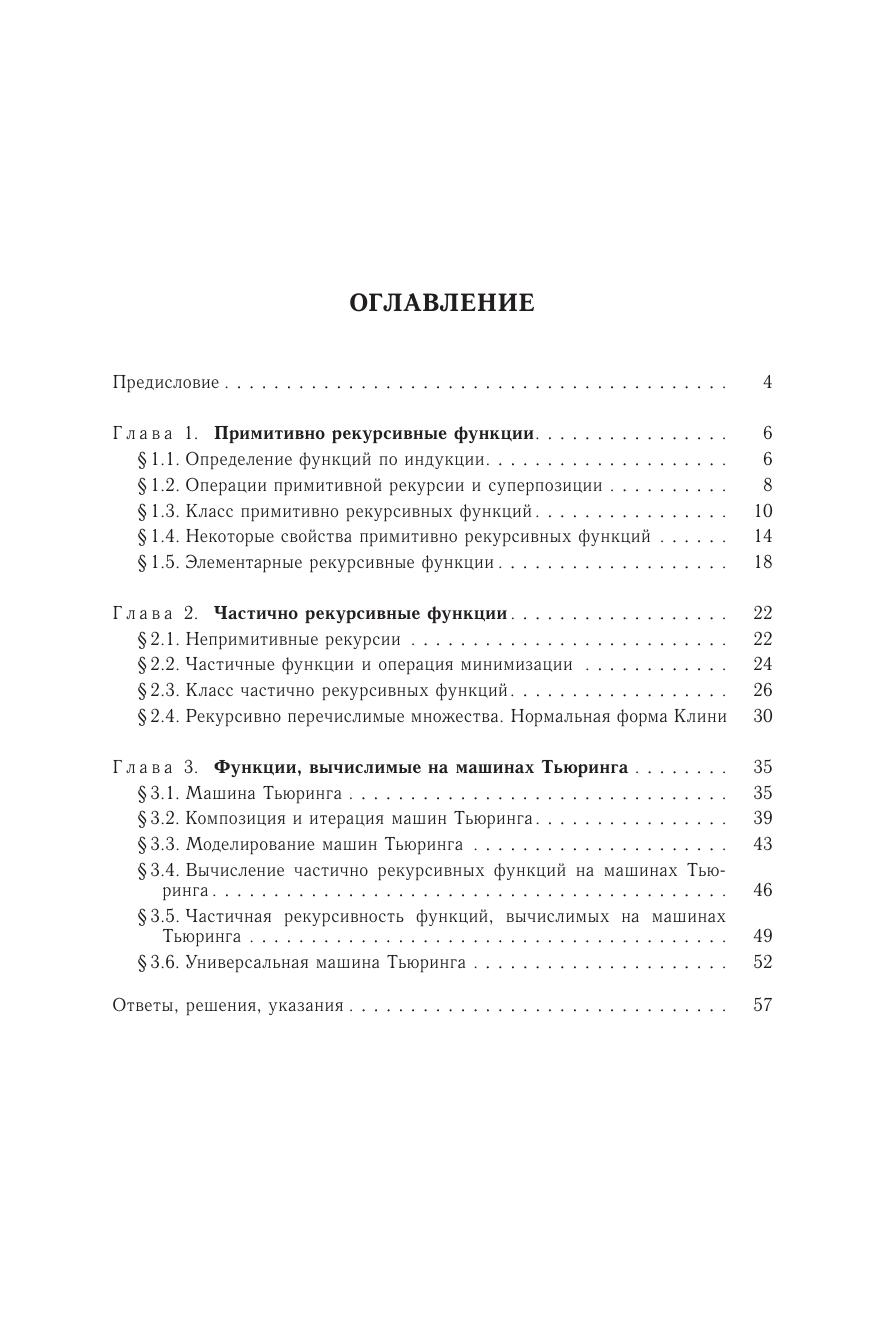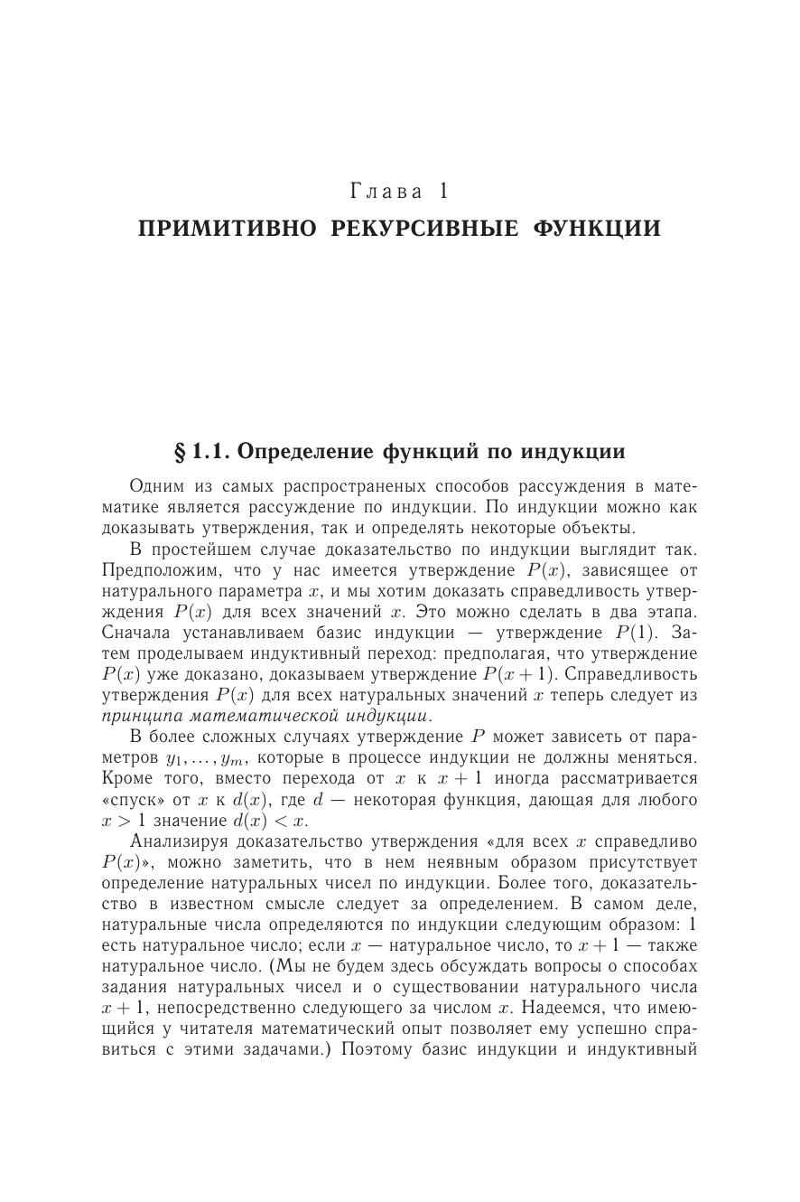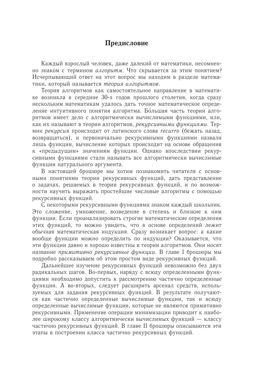 Брошюра знакомит читателя с алгоритмически вычислимыми функциями натурального аргумента — рекурсивными функциями. Вначале изучается простейший тип рекурсивных функций — примитивно рекурсивные функции. Затем происходит расширение круга вычислимых функций: рассматриваются частично определенные вычислимые функции, а также всюду пределенные вычислимые функции, не являющиеся примитивно рекурсивными. В заключение определяются абстрактные вычислительные устройства — машины Тьюринга, и класс функций, вычислимых на машинах Тьюринга, связывается с классом частично рекурсивных функций. Для школьников старших классов и студентов вузов, знакомящихся с основами теории алгоритмов.
