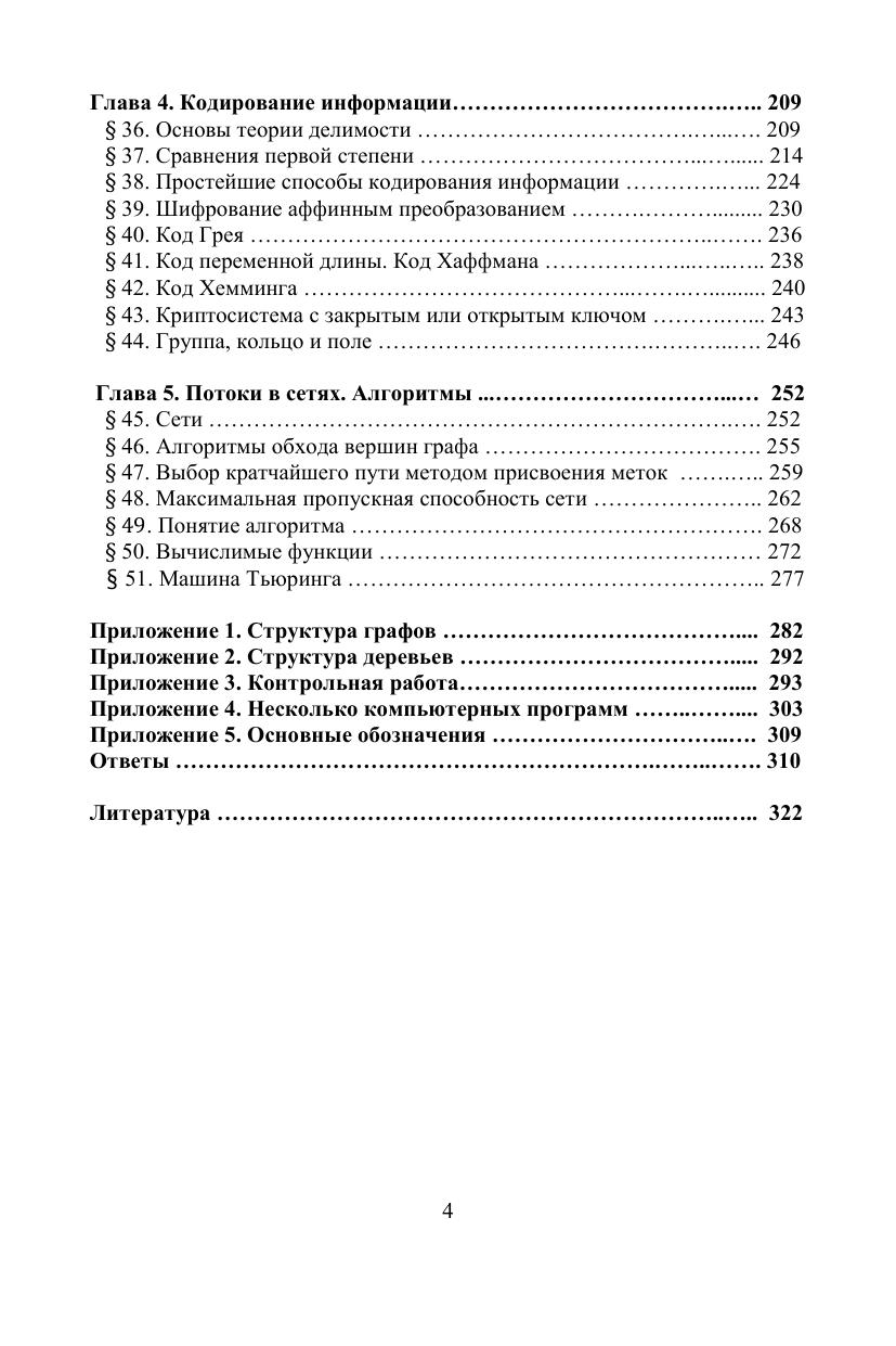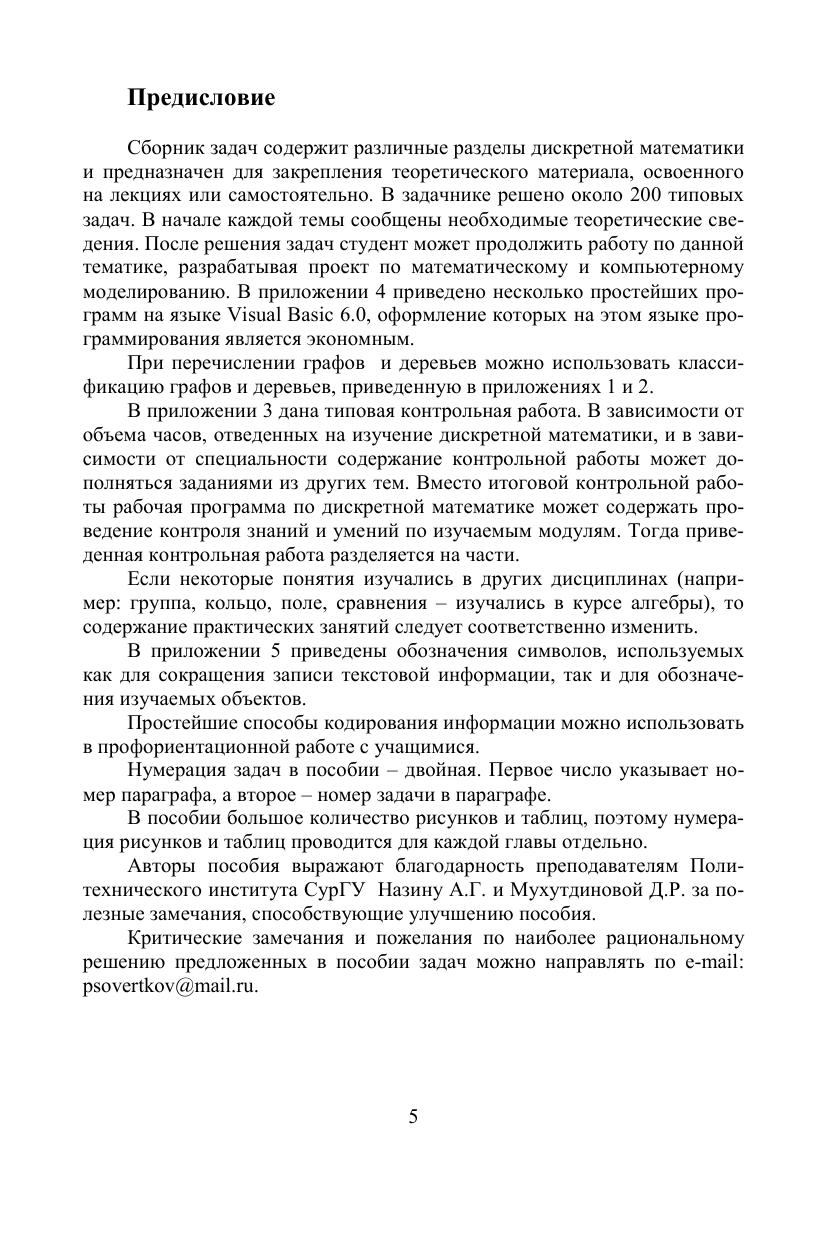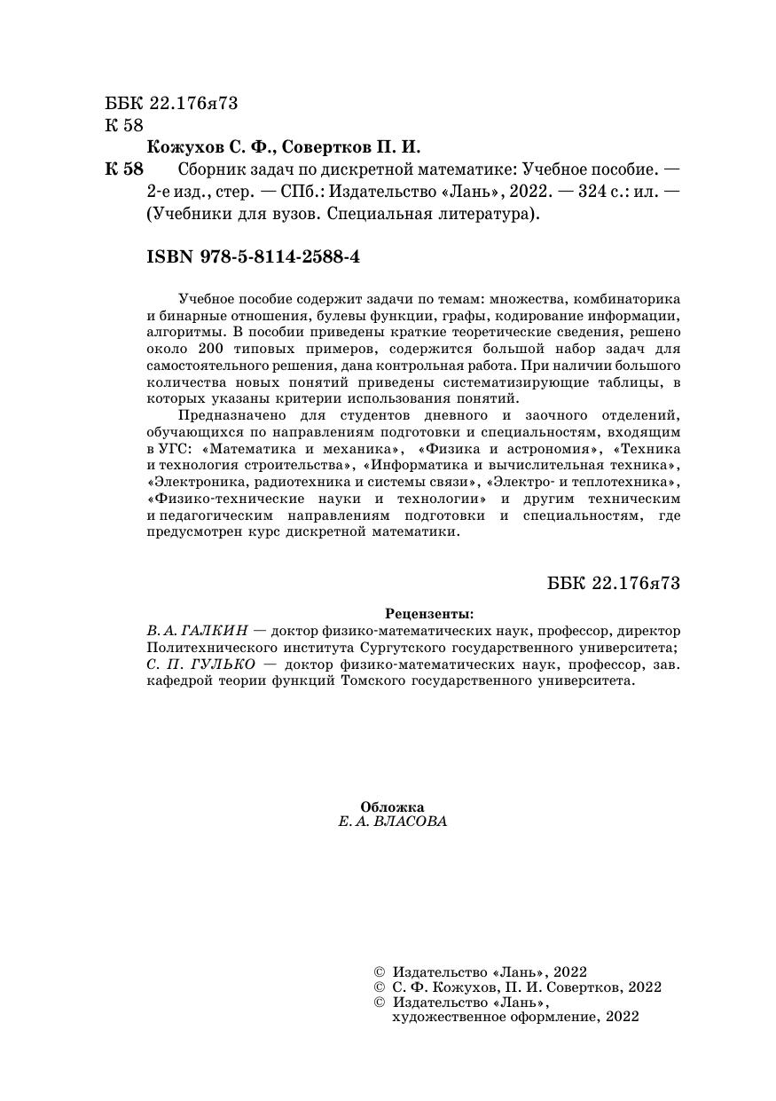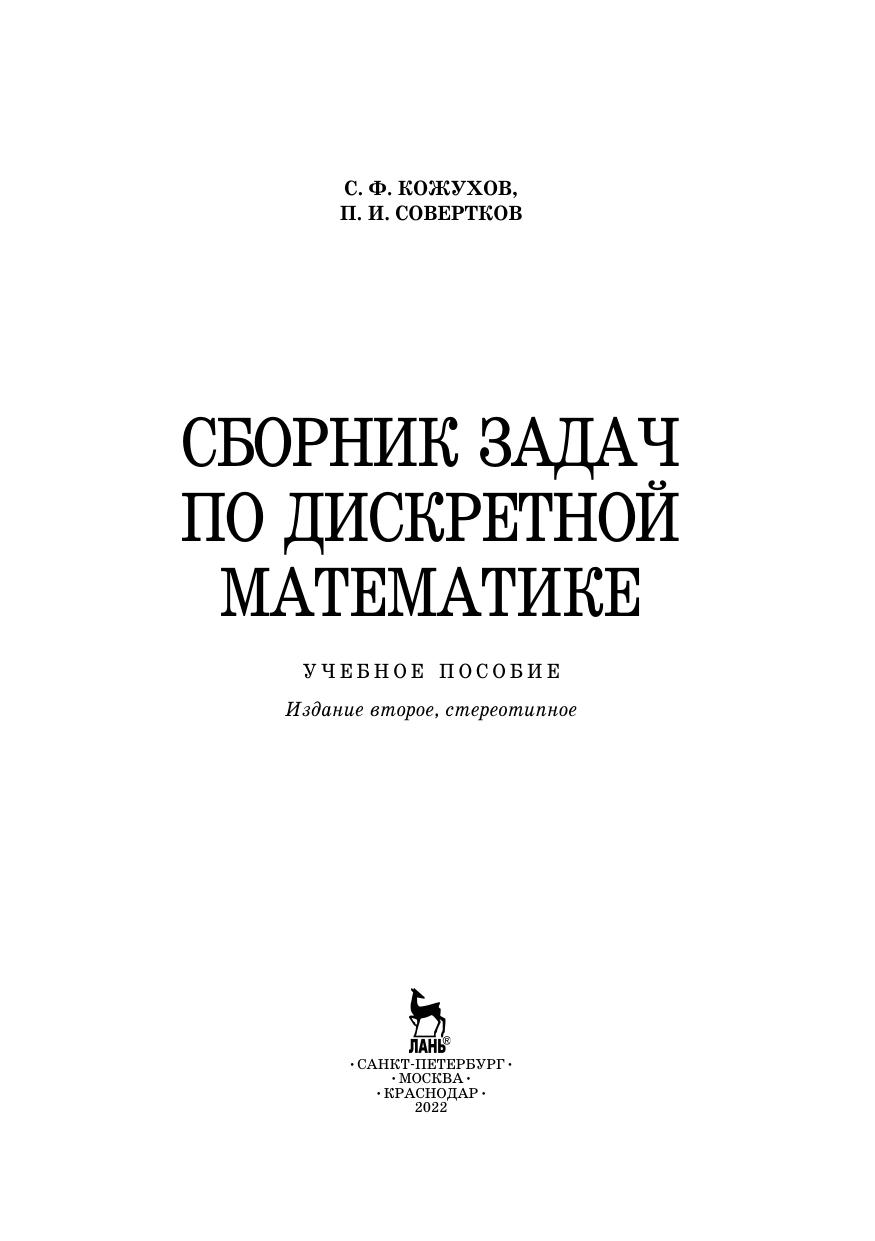 Учебное пособие содержит задачи по темам: множества, комбинаторика и бинарные отношения, булевы функции, графы, кодирование информации, алгоритмы. В пособии приведены краткие теоретические сведения, решено около 200 типовых примеров, содержится большой набор задач для самостоятельного решения, дана контрольная работа. При наличии большого количества новых понятий приведены систематизирующие таблицы, в которых указаны критерии использования понятий. Предназначено для студентов дневного и заочного отделений, обучающихся по направлениям подготовки и специальностям, входящим в УГС: «Математика и механика», «Физика и астрономия», «Техника и технология строительства», «Информатика и вычислительная техника», «Электроника, радиотехника и системы связи», «Электро- и теплотехника», «Физико-технические науки и технологии» и другим техническим и педагогическим направлениям подготовки и специальностям, где предусмотрен курс дискретной математики.