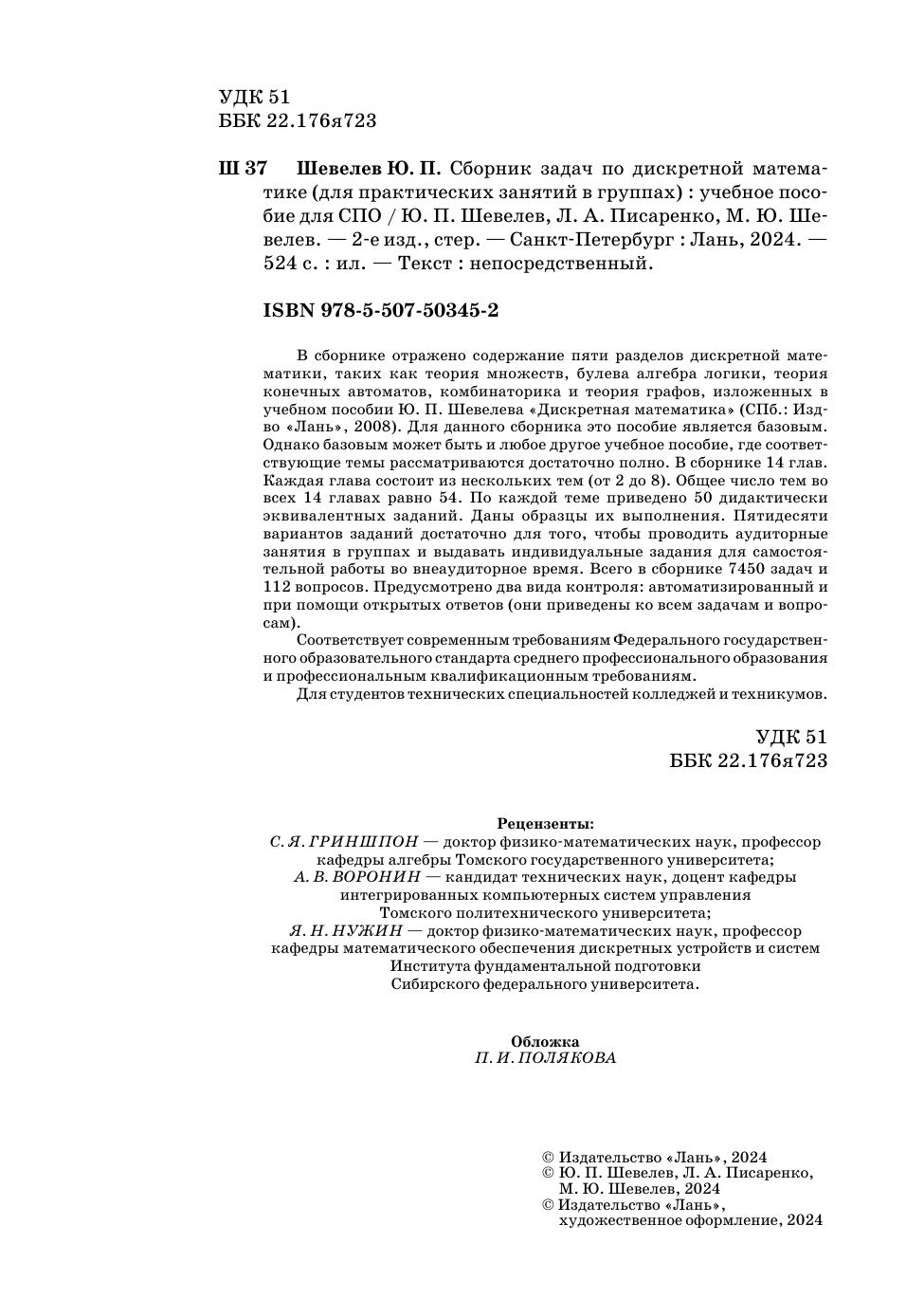 В сборнике отражено содержание пяти разделов дискретной математики, таких как теория множеств, булева алгебра логики, теория конечных автоматов, комбинаторика и теория графов, изложенных в учебном пособии Ю. П. Шевелева «Дискретная математика» (СПб.: Изд-во «Лань», 2008). Для данного сборника это пособие является базовым. Однако базовым может быть и любое другое учебное пособие, где соответствующие темы рассматриваются достаточно полно. В сборнике 14 глав. Каждая глава состоит из нескольких тем (от 2 до 8). Общее число тем во всех 14 главах равно 54. По каждой теме приведено 50 дидактически эквивалентных заданий. Даны образцы их выполнения. Пятидесяти вариантов заданий достаточно для того, чтобы проводить аудиторные занятия в группах и выдавать индивидуальные задания для самостоятельной работы во внеаудиторное время. Всего в сборнике 7450 задач и 112 вопросов. Предусмотрено два вида контроля: автоматизированный и при помощи открытых ответов (они приведены ко всем задачам и вопросам). Соответствует современным требованиям Федерального государственного образовательного стандарта среднего профессионального образования и профессиональным квалификационным требованиям. Для студентов технических специальностей колледжей и техникумов.