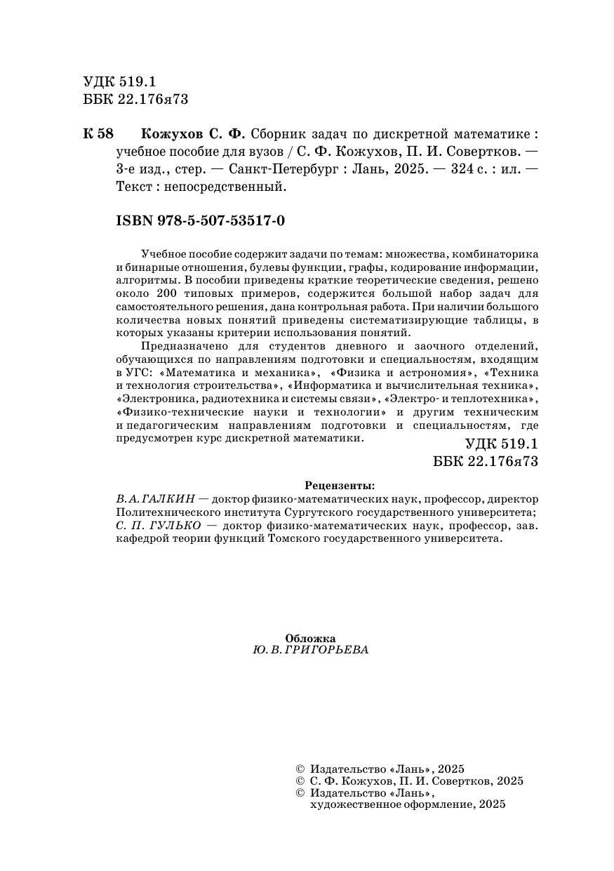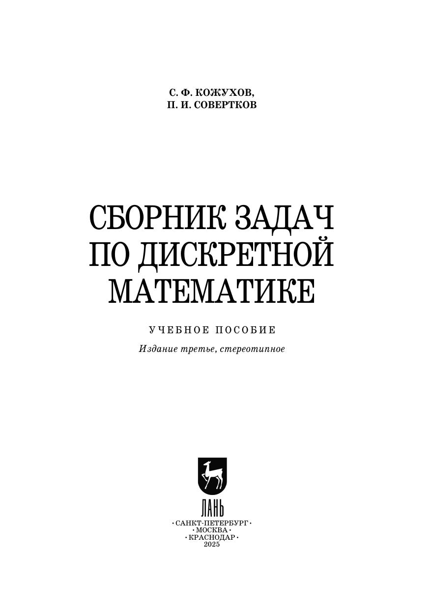Учебное пособие содержит задачи по темам: множества, комбинаторика и бинарные отношения, булевы функции, графы, кодирование информации, алгоритмы. В пособии приведены краткие теоретические сведения, решено около 200 типовых примеров, содержится большой набор задач для самостоятельного решения, дана контрольная работа. При наличии большого количества новых понятий приведены систематизирующие таблицы, в которых указаны критерии использования понятий. Предназначено для студентов дневного и заочного отделений, обучающихся по направлениям подготовки и специальностям, входящим в УГС: «Математика и механика», «Физика и астрономия», «Техника и технология строительства», «Информатика и вычислительная техника», «Электроника, радиотехника и системы связи», «Электро- и теплотехника», «Физико-технические науки и технологии» и другим техническим и педагогическим направлениям подготовки и специальностям, где предусмотрен курс дискретной математики.