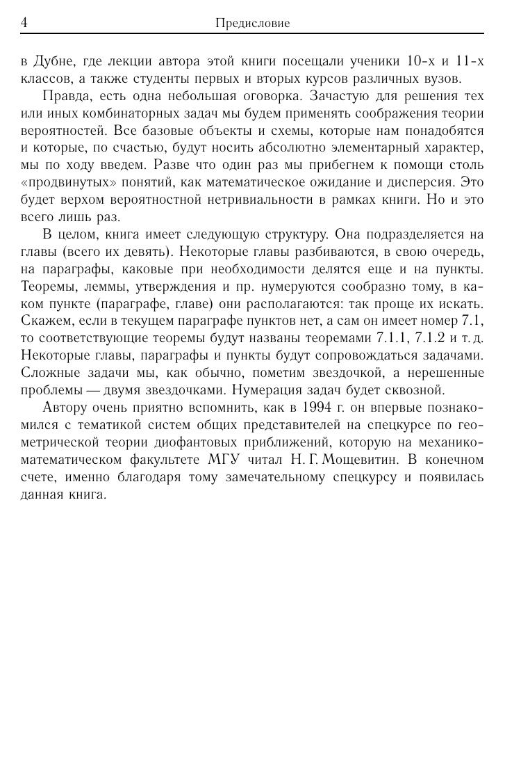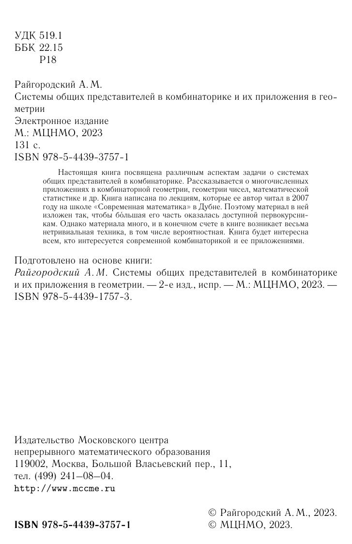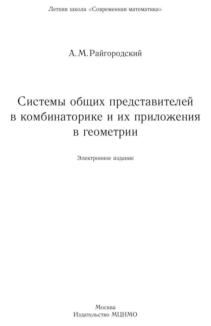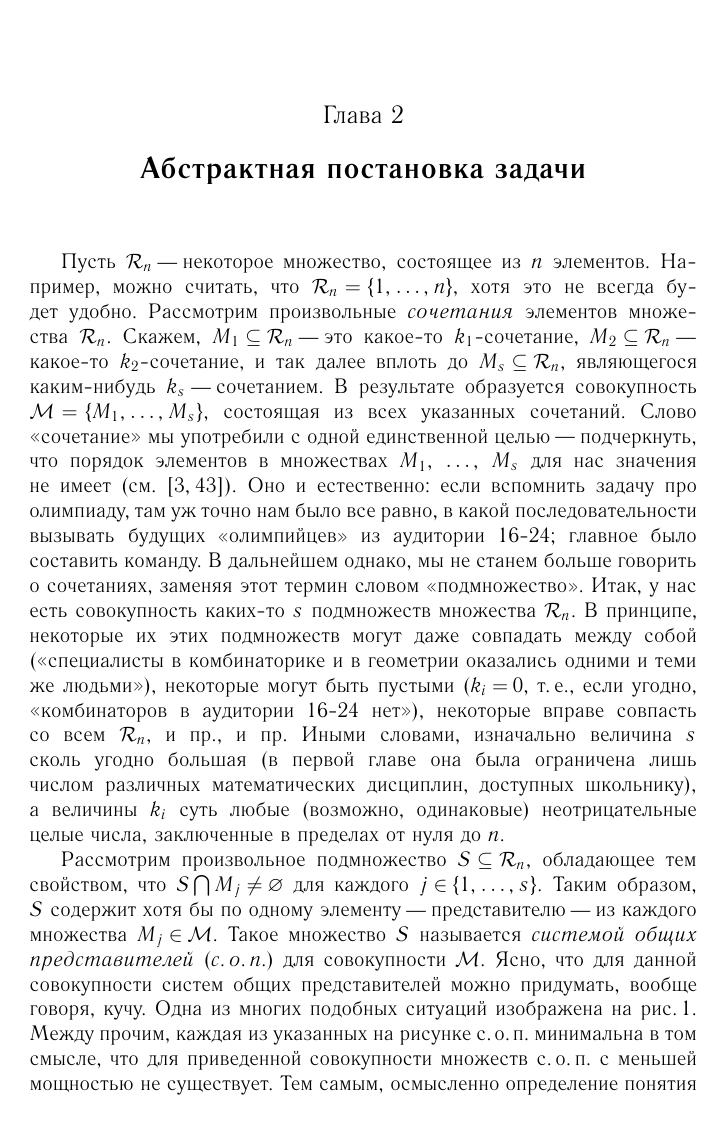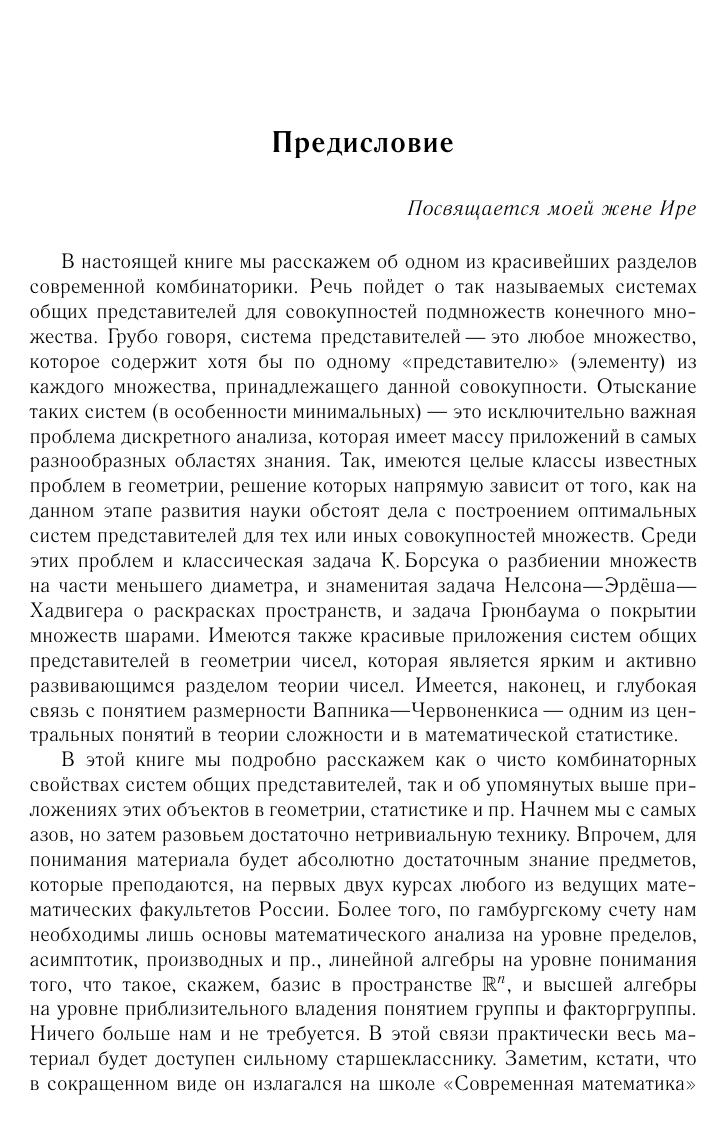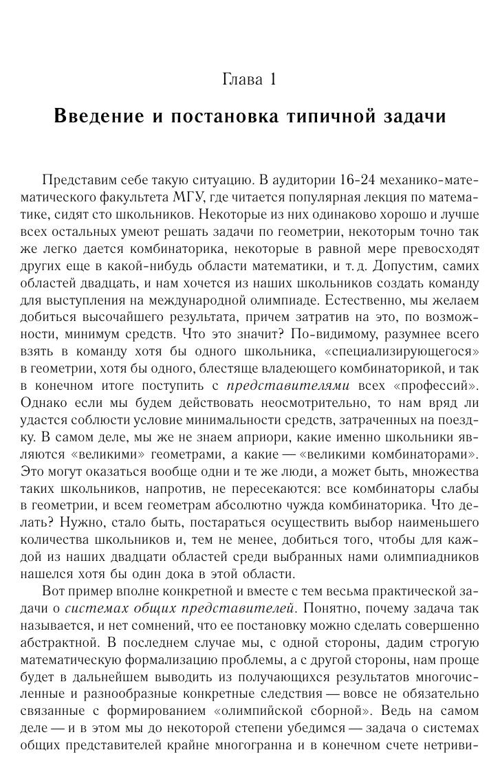 Настоящая книга посвящена различным аспектам задачи о системах общих представителей в комбинаторике. Рассказывается о многочисленных приложениях в комбинаторной геометрии, геометрии чисел, математической статистике и др. Книга написана по лекциям, которые ее автор читал в 2007 году на школе «Современная математика» в Дубне. Поэтому материал в ней изложен так, чтобы большая его часть оказалась доступной первокурсникам. Однако материала много, и в конечном счете в книге возникает весьма нетривиальная техника, в том числе вероятностная. Книга будет интересна всем, кто интересуется современной комбинаторикой и ее приложениями.