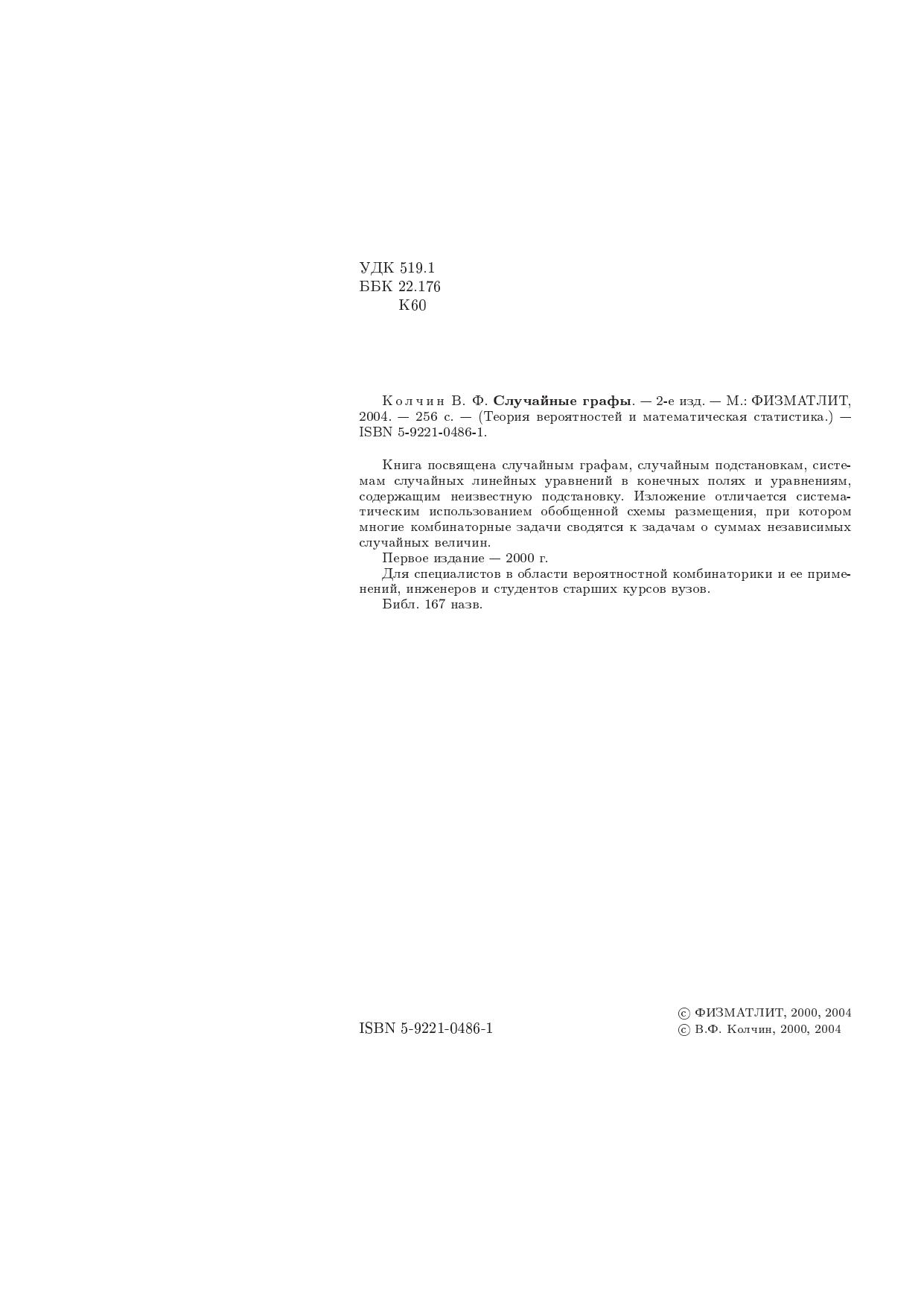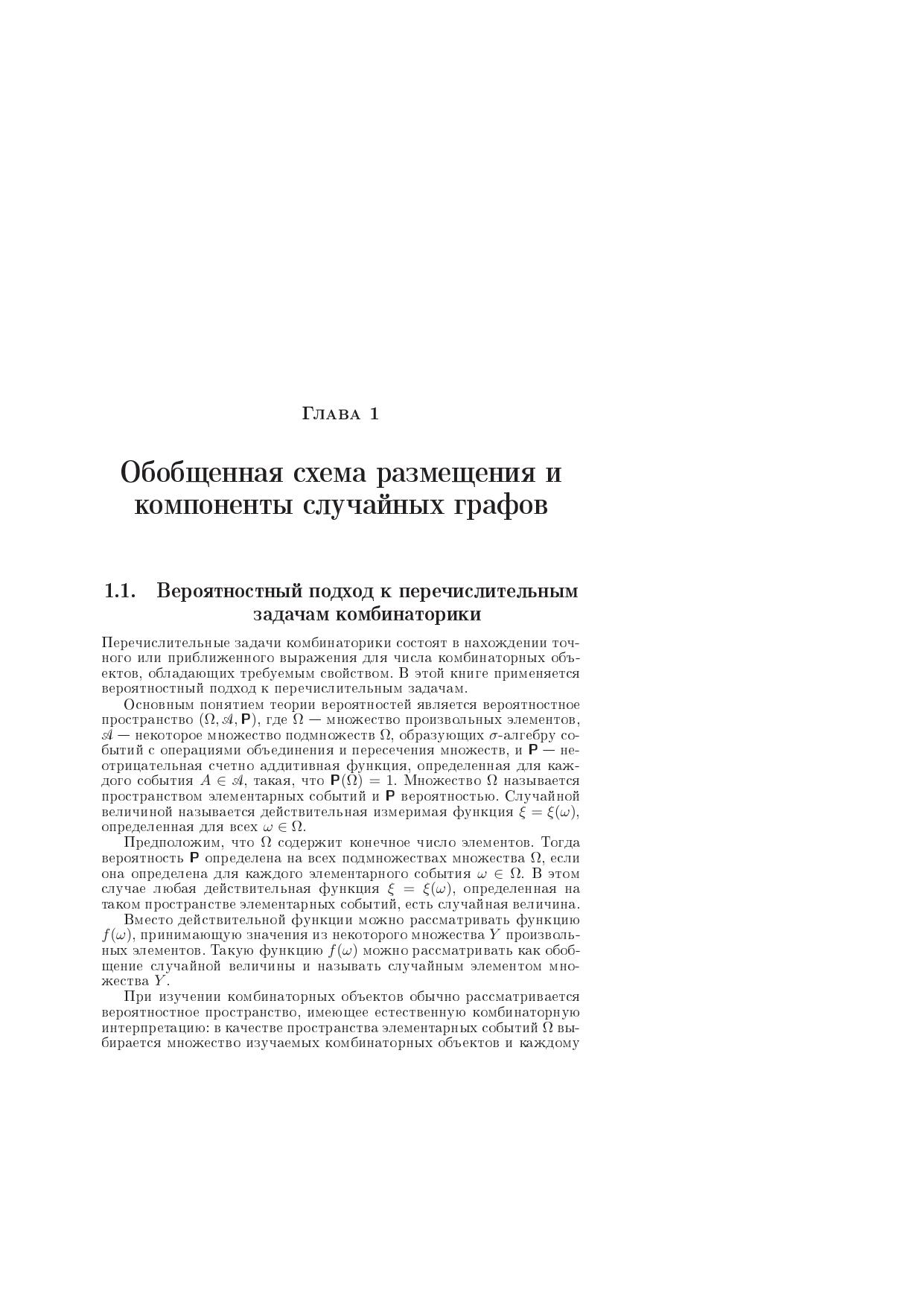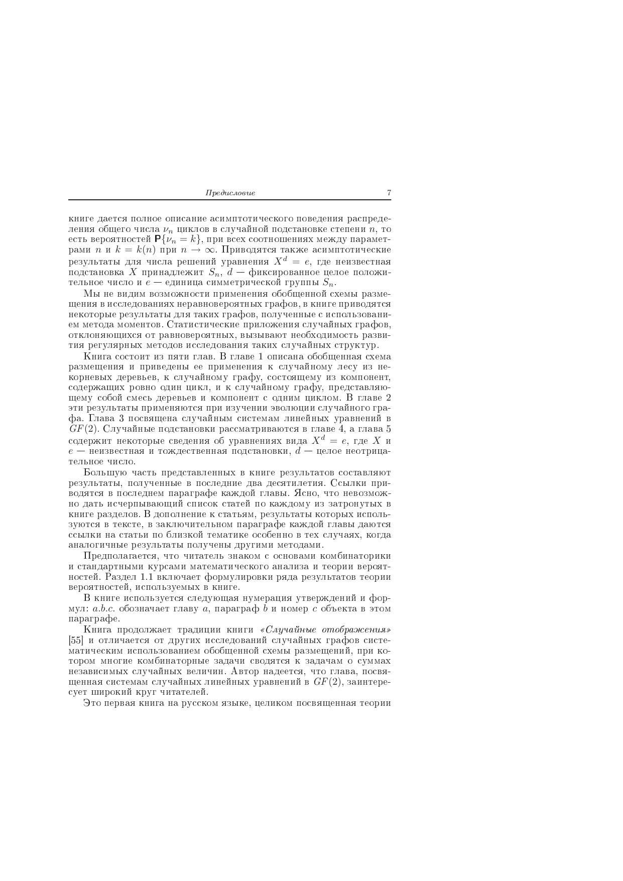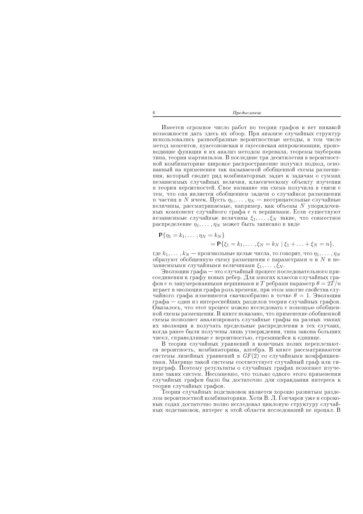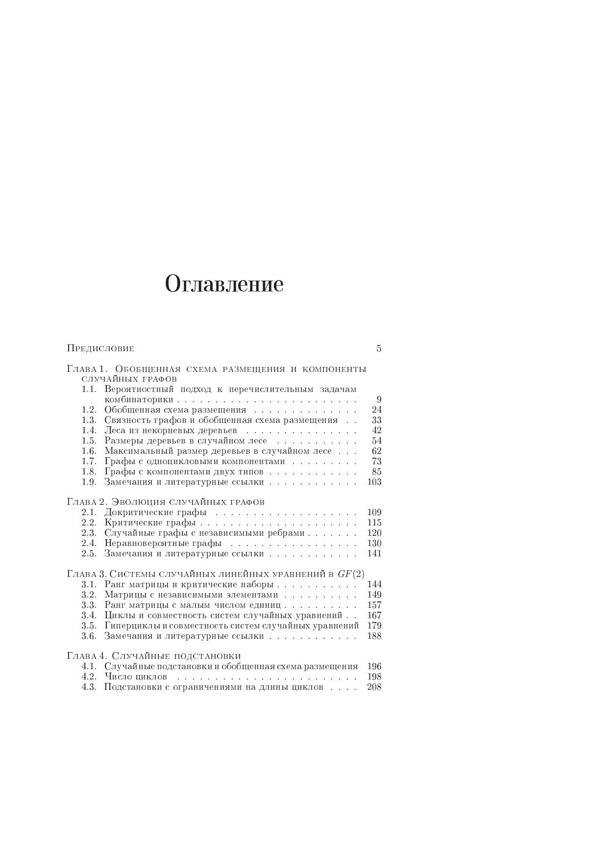 Книга посвящена случайным графам, случайным подстановкам, системам случайных линейных уравнений в конечных полях и уравнениям, содержащим неизвестную подстановку. Изложение отличается систематическим использованием обобщенной схемы размещения, при котором многие комбинаторные задачи сводятся к задачам о суммах независимых случайных величин. Для специалистов в области вероятностной комбинаторики и ее применений, инженеров и студентов старших курсов вузов.