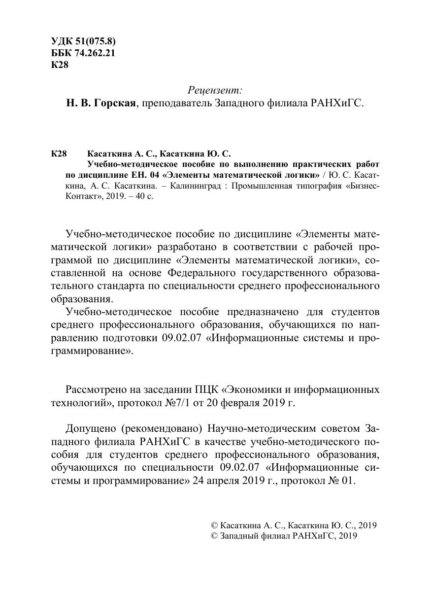 Учебно-методическое пособие по дисциплине «Элементы мате-матической логики» разработано в соответствии с рабочей про-граммой по дисциплине «Элементы математической логики», со-ставленной на основе Федерального государственного образова-тельного стандарта по специальности среднего профессионального образования. Учебно-методическое пособие предназначено для студентов среднего профессионального образования, обучающихся по нап-равлению подготовки 09.02.07 «Информационные системы и про-граммирование».