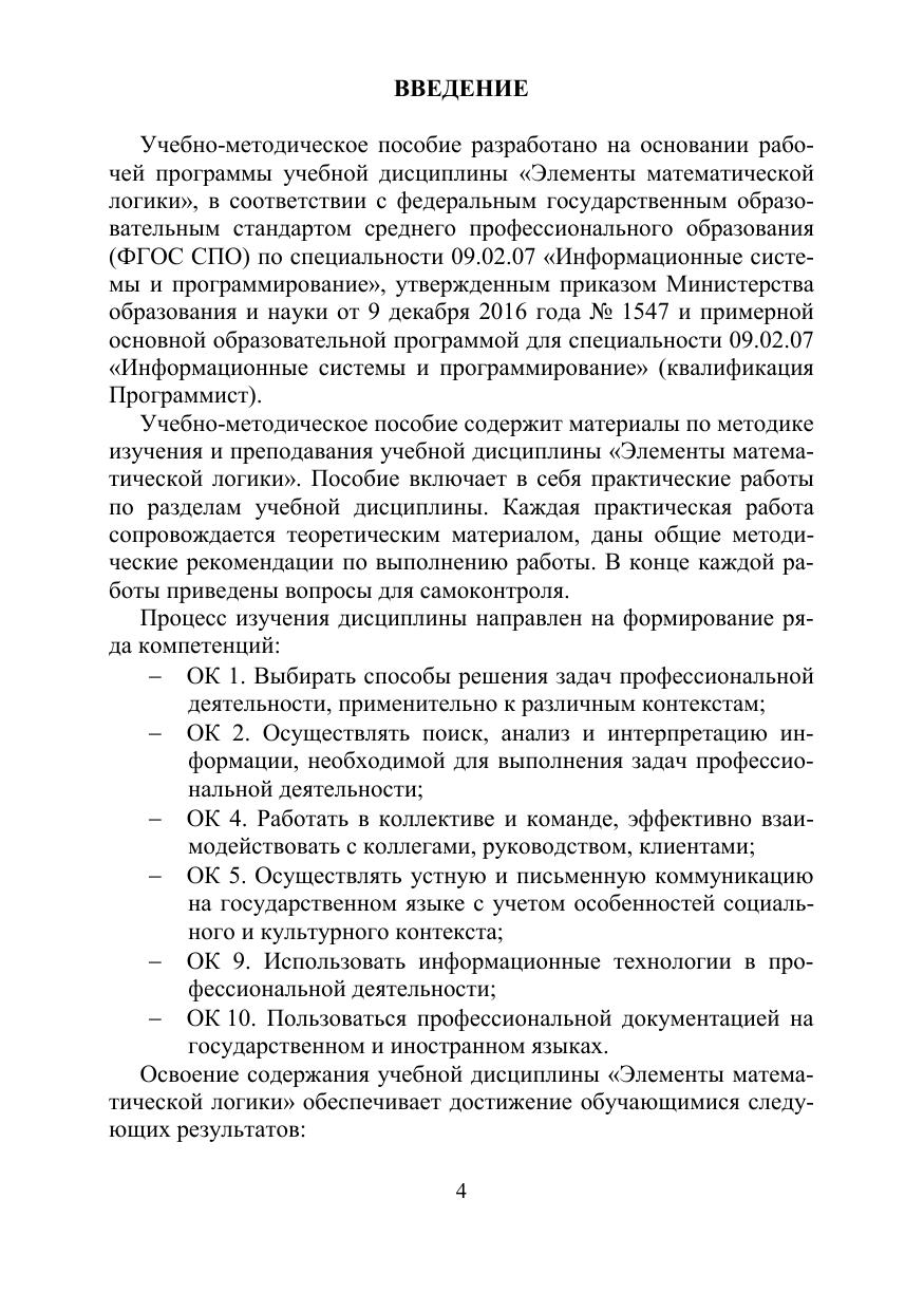 Учебно-методическое пособие по дисциплине «Элементы мате-матической логики» разработано в соответствии с рабочей про-граммой по дисциплине «Элементы математической логики», со-ставленной на основе Федерального государственного образова-тельного стандарта по специальности среднего профессионального образования. Учебно-методическое пособие предназначено для студентов среднего профессионального образования, обучающихся по нап-равлению подготовки 09.02.07 «Информационные системы и про-граммирование».