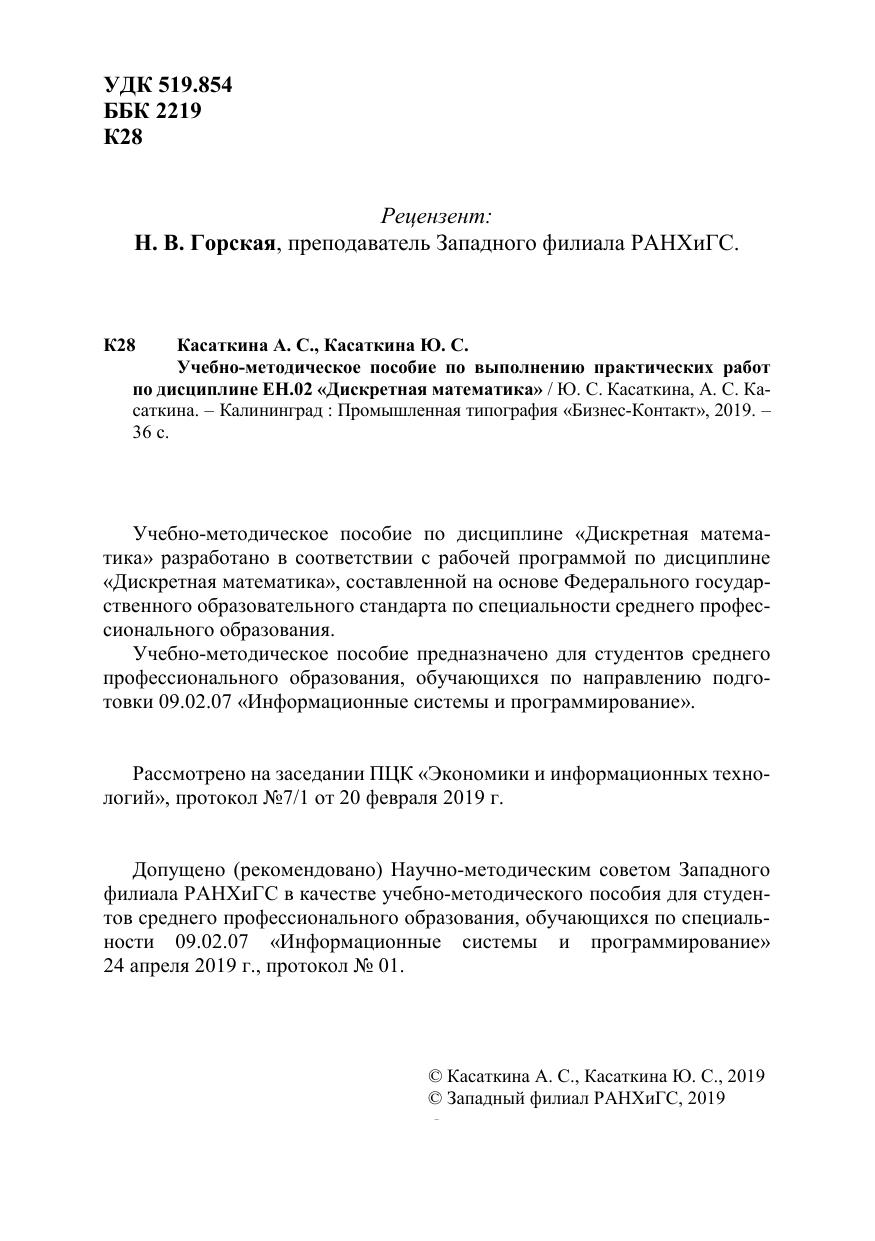 Учебно-методическое пособие по дисциплине «Дискретная матема-тика» разработано в соответствии с рабочей программой по дисциплине «Дискретная математика», составленной на основе Федерального государ-ственного образовательного стандарта по специальности среднего профес-сионального образования. Учебно-методическое пособие предназначено для студентов среднего профессионального образования, обучающихся по направлению подго-товки 09.02.07 «Информационные системы и программирование».