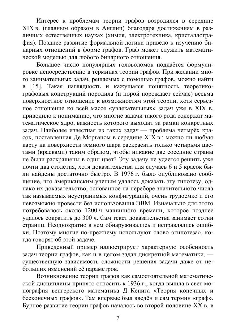 Учебное пособие состоит из трех частей. В первой части рассматриваются элементы классической теории графов, включая задачи обхода и раскраски графов, свойства планарных графов и способы задания графов. Во второй части изучаются основы конструктивной теории графов, приводится классификация множества всех графов, строятся конструктивные описания эйлеровых, гамильтоновых и планарных графов. В третьей части рассматривается использование конструктивной теории графов в задачах экономного кодирования и оптимального размещения информации о графах. Пособие предназначено для студентов классических и педагогических университетов, обучающихся по программам подготовки по математике и информатике. Оно может быть использовано преподавателями и студентами при изучении таких дисциплин, как «Дискретная математика» и «Теоретические основы информатики».