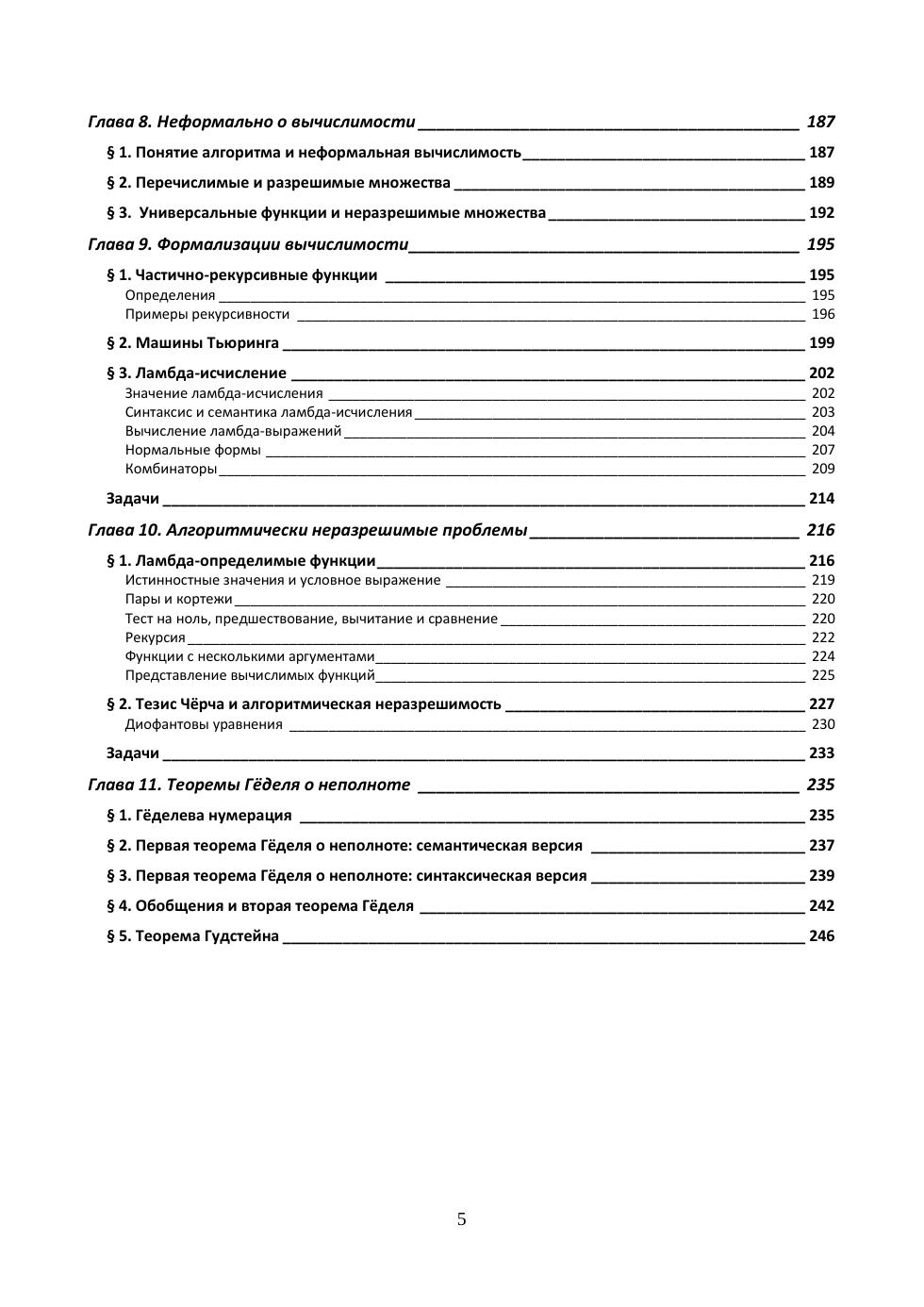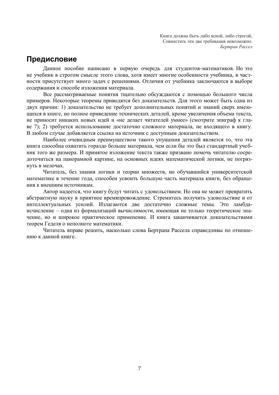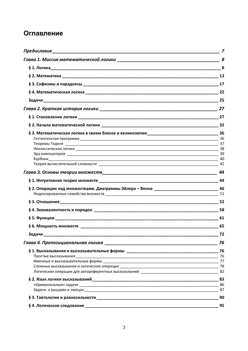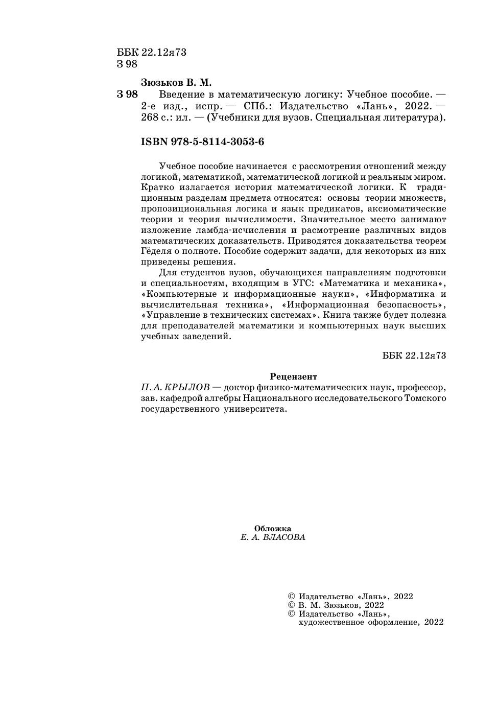 Учебное пособие начинается с рассмотрения отношений между логикой, математикой, математической логикой и реальным миром. Кратко излагается история математической логики. К традиционным разделам предмета относятся: основы теории множеств, пропозициональная логика и язык предикатов, аксиоматические теории и теория вычислимости. Значительное место занимают изложение ламбда-исчисления и расмотрение различных видов математических доказательств. Приводятся доказательства теорем Гёделя о полноте. Пособие содержит задачи, для некоторых из них приведены решения. Для студентов вузов, обучающихся направлениям подготовки и специальностям, входящим в УГС: «Математика и механика», «Компьютерные и информационные науки», «Информатика и вычислительная техника», «Информационная безопасность», «Управление в технических системах». Книга также будет полезна для преподавателей математики и компьютерных наук высших учебных заведений.