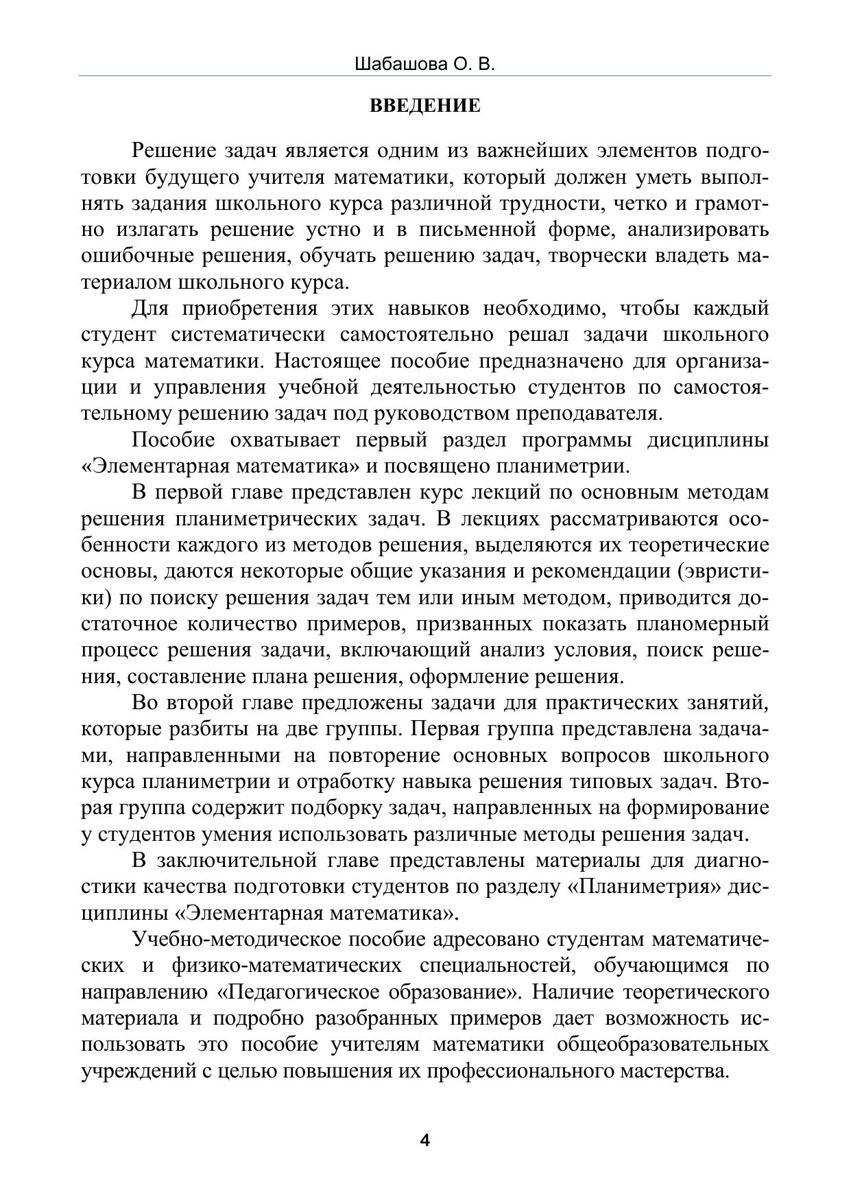 Решение планиметрических задач является одним из слабых мест в профессиональной подготовке будущего учителя математики. Цель настоящего пособия – оказать помощь студентам в развитии умения решать задачи школьного курса геометрии. Наличие теоретического материала, раскрывающего разнообразие методов решения планиметрических задач, и большого числа разобранных примеров даст возможность использовать пособие не только студентам, но и учителям.