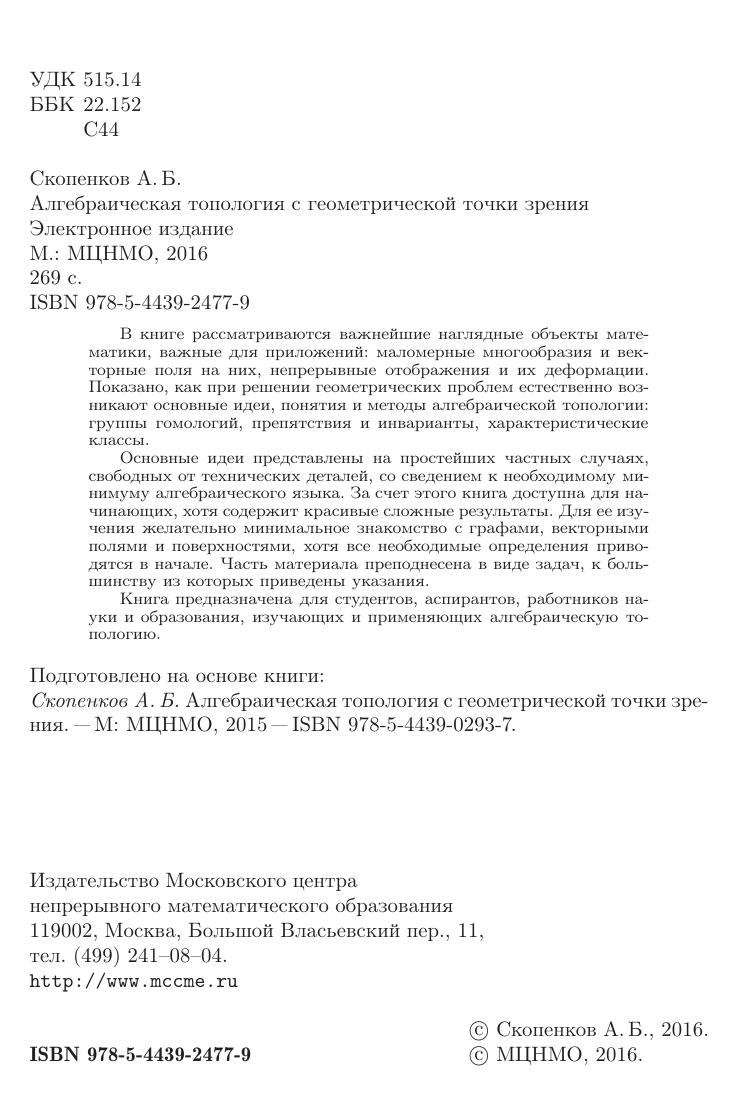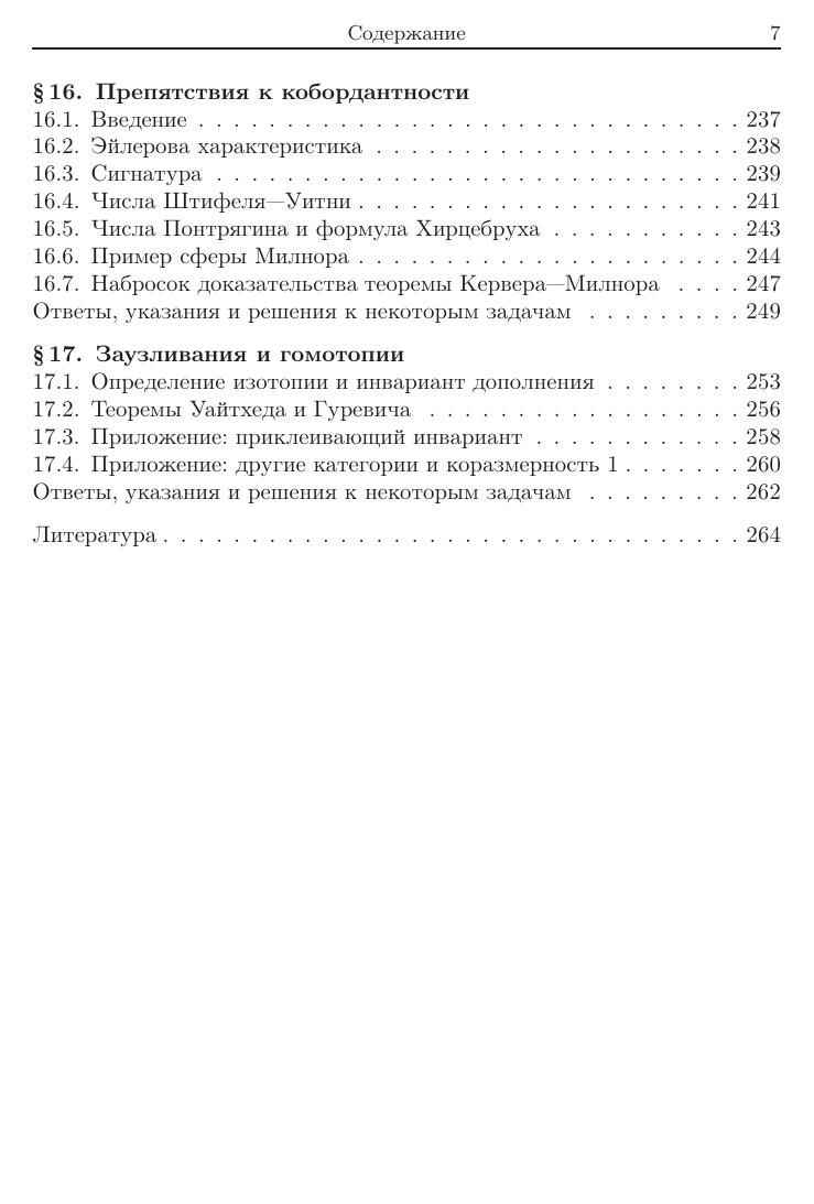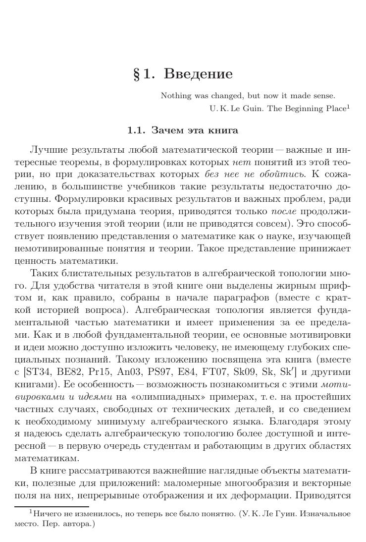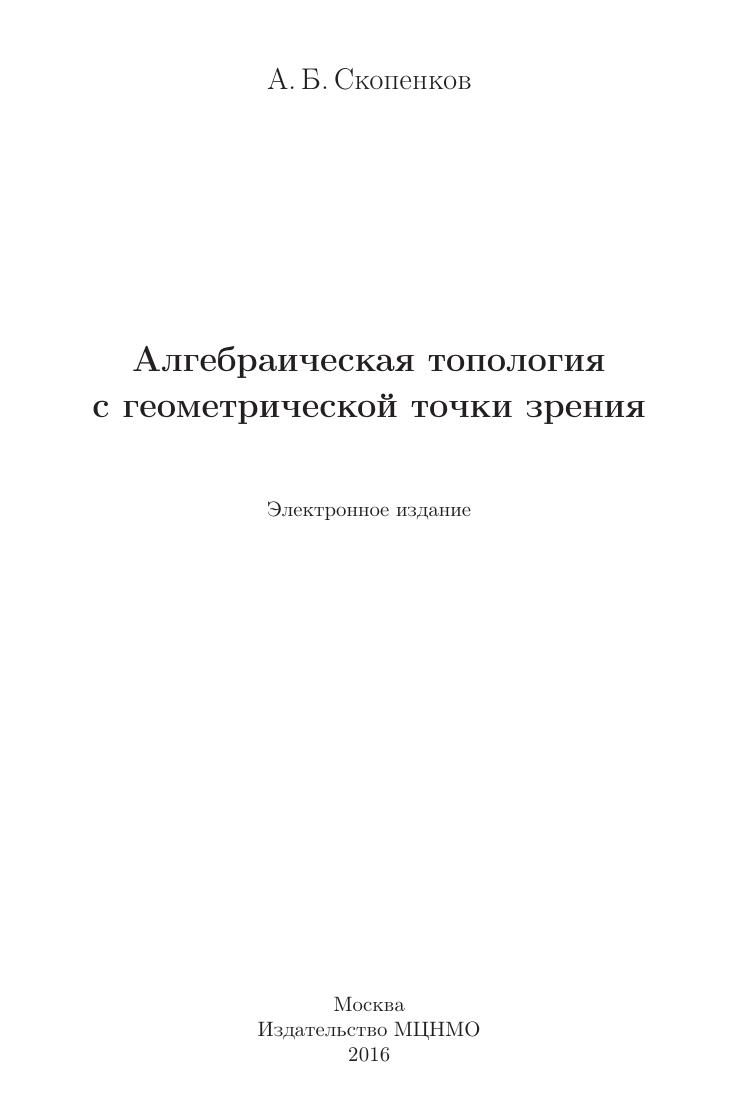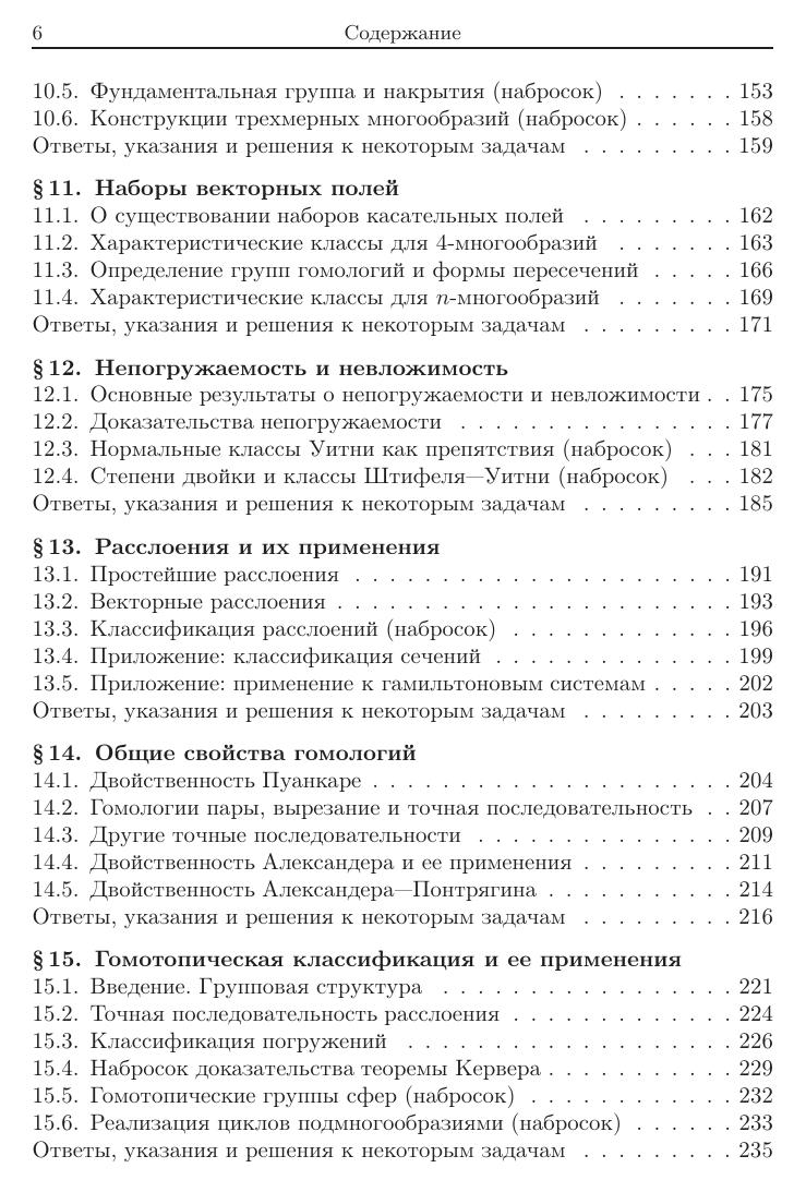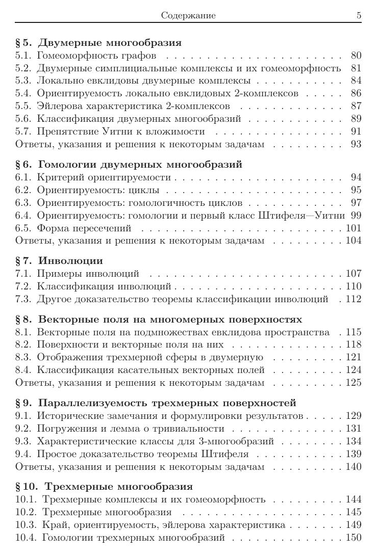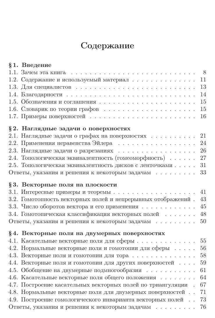 В книге рассматриваются важнейшие наглядные объекты математики, важные для приложений: маломерные многообразия и векторные поля на них, непрерывные отображения и их деформации. Показано, как при решении геометрических проблем естественно возникают основные идеи, понятия и методы алгебраической топологии: группы гомологий, препятствия и инварианты, характеристические классы. Основные идеи представлены на простейших частных случаях, свободных от технических деталей, со сведением к необходимому минимуму алгебраического языка. За счет этого книга доступна для начинающих, хотя содержит красивые сложные результаты. Для ее изучения желательно минимальное знакомство с графами, векторными полями и поверхностями, хотя все необходимые определения приводятся в начале. Часть материала преподнесена в виде задач, к большинству из которых приведены указания. Книга предназначена для студентов, аспирантов, работников науки и образования, изучающих и применяющих алгебраическую топологию.