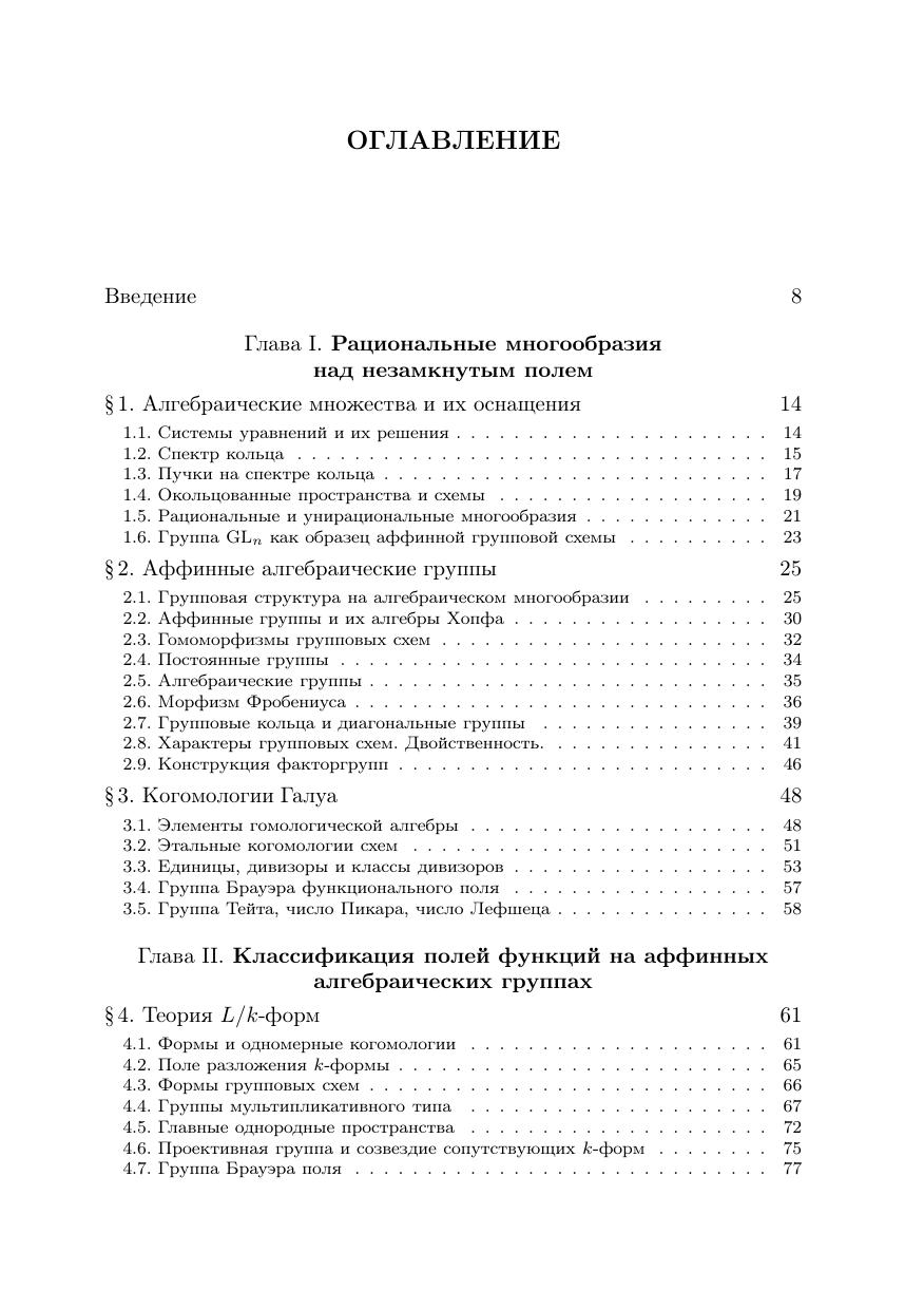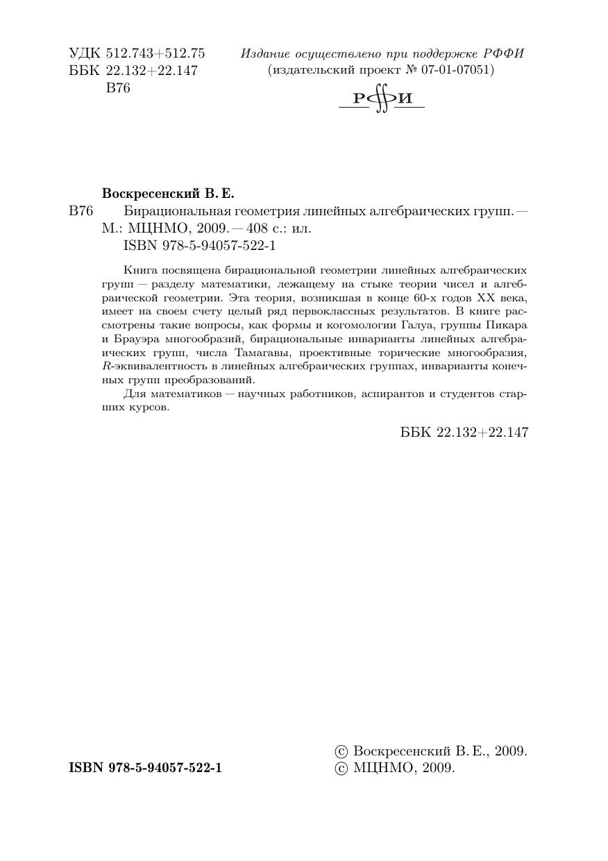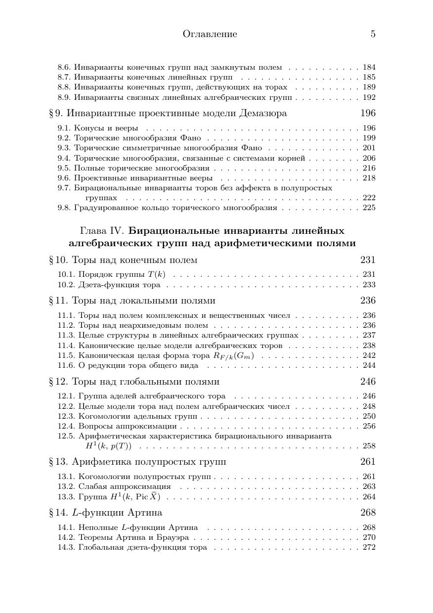 Книга посвящена бирациональной геометрии линейных алгебраических групп — разделу математики, лежащему на стыке теории чисел и алгебраической геометрии. Эта теория, возникшая в конце 60-х годов XX века, имеет на своем счету целый ряд первоклассных результатов. В книге рассмотрены такие вопросы, как формы и когомологии Галуа, группы Пикара и Брауэра многообразий, бирациональные инварианты линейных алгебраических групп, числа Тамагавы, проективные торические многообразия, R-эквивалентность в линейных алгебраических группах, инварианты конечных групп преобразований.Для математиков — научных работников, аспирантов и студентов старших курсов.