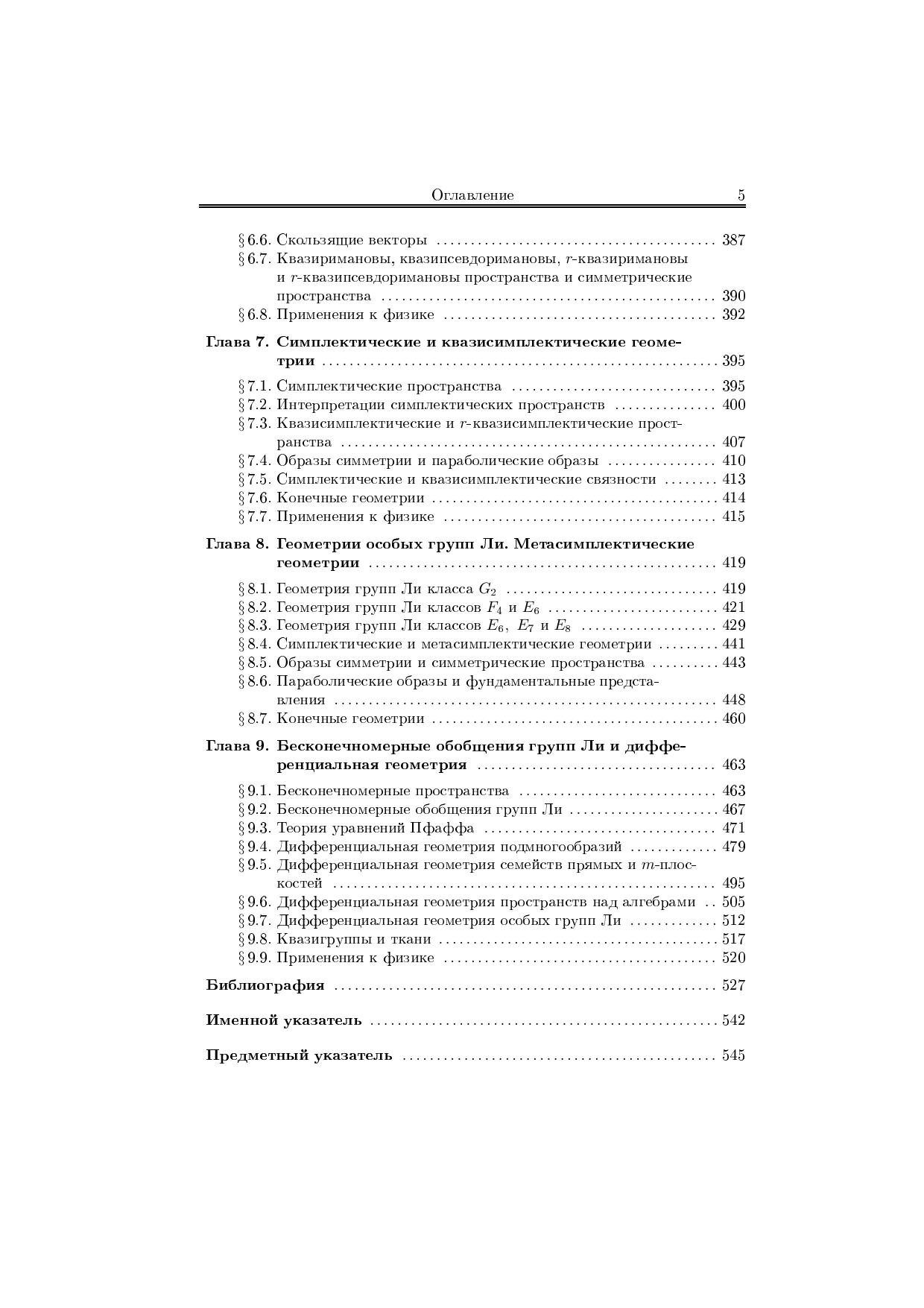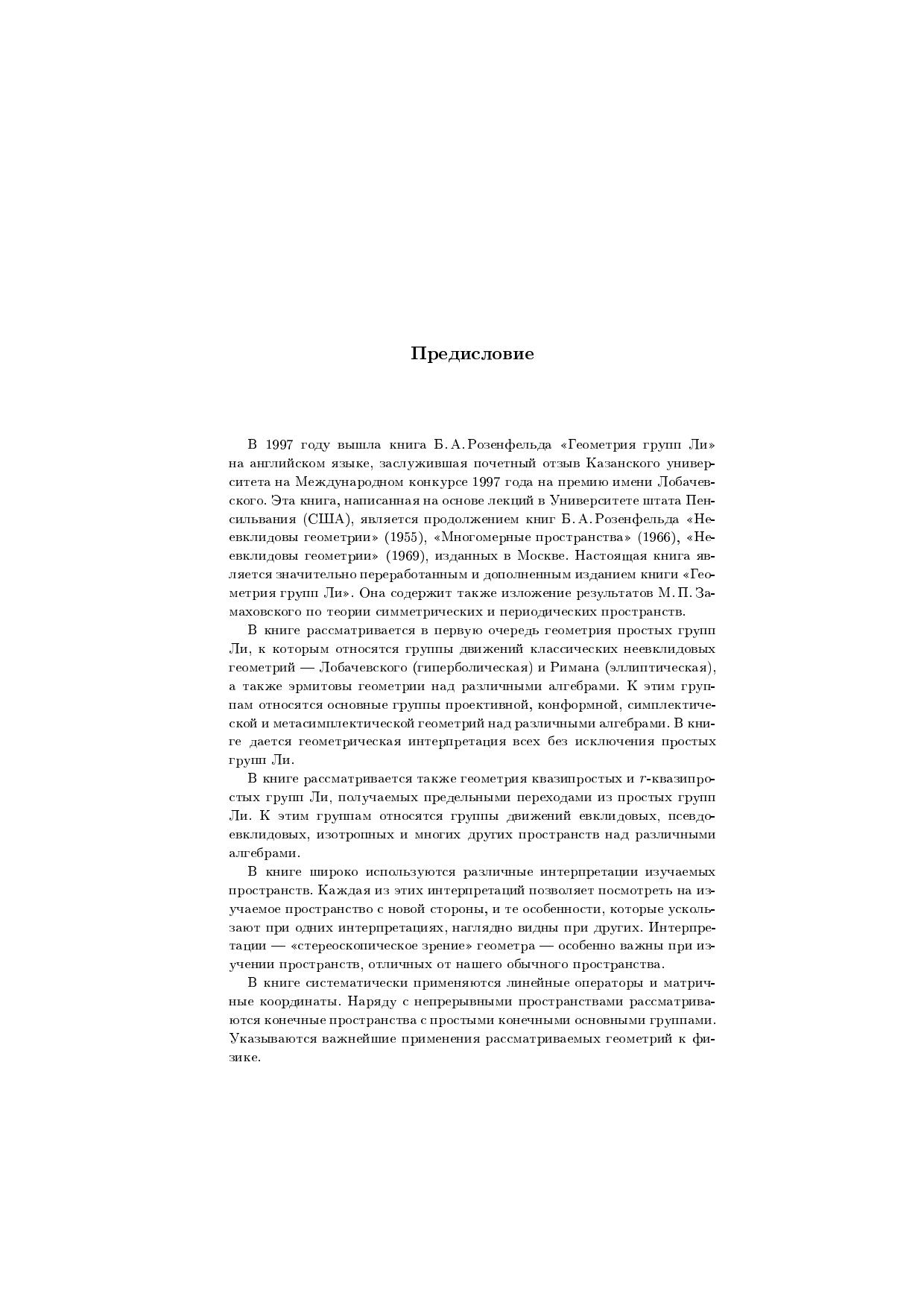 В книге рассматривается геометрическая интерпретация всех простых групп Ли в виде групп движений классических неевклидовых геометрий Лобачевского и Римана, основных групп проективных, конформных, симплектических и метасимплектических геометрий над алгебрами. В книге рассматривается также геометрическая интерпретация групп Ли, получаемых предельными переходами из простых групп Ли. К таким группам относятся группы движений евклидовых, псевдоевклидовых, изотропных и многих других геометрий над алгебрами. Наряду с непрерывными пространствами рассматриваются конечные пространства, основными группами которых являются конечные группы типа Ли. В книге указываются важнейшие применения рассматриваемых геометрий к физике.Книга рассчитана на научных работников, аспирантов и студентов, специализирующихся по неевклидовым геометриям.