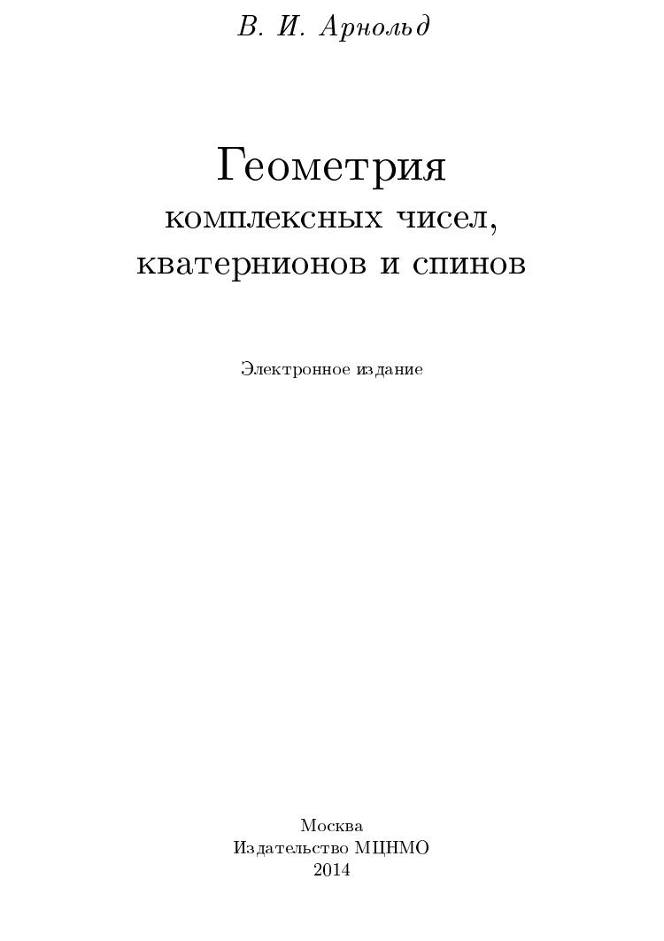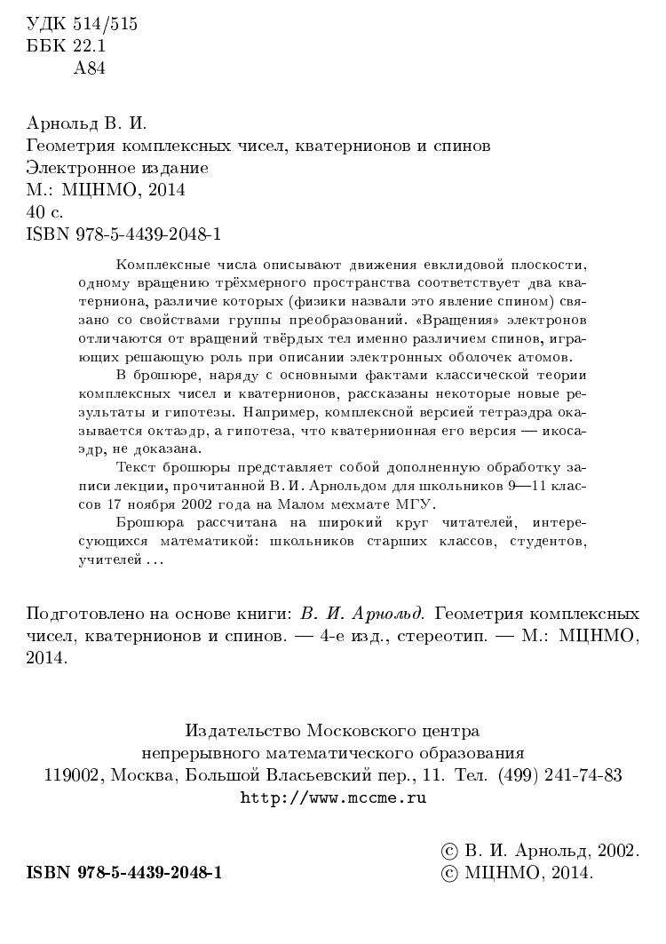 Комплексные числа описывают движения евклидовой плоскости, одному вращению трёхмерного пространства соответствует два кватерниона, различие которых (физики назвали это явление спином) связано со свойствами группы преобразований. «Вращения» электронов отличаются от вращений твёрдых тел именно различием спинов, играющих решающую роль при описании электронных оболочек атомов. В брошюре, наряду с основными фактами классической теории комплексных чисел и кватернионов, рассказаны некоторые новые результаты и гипотезы. Например, комплексной версией тетраэдра оказывается октаэдр, а гипотеза, что кватернионная его версия — икосаэдр, не доказана. Текст брошюры представляет собой дополненную обработку записи лекции, прочитанной В. И. Арнольдом для школьников 9–11 классов 17 ноября 2002 года на Малом мехмате МГУ. Брошюра рассчитана на широкий круг читателей, интересующихся математикой: школьников старших классов, студентов, учителей.