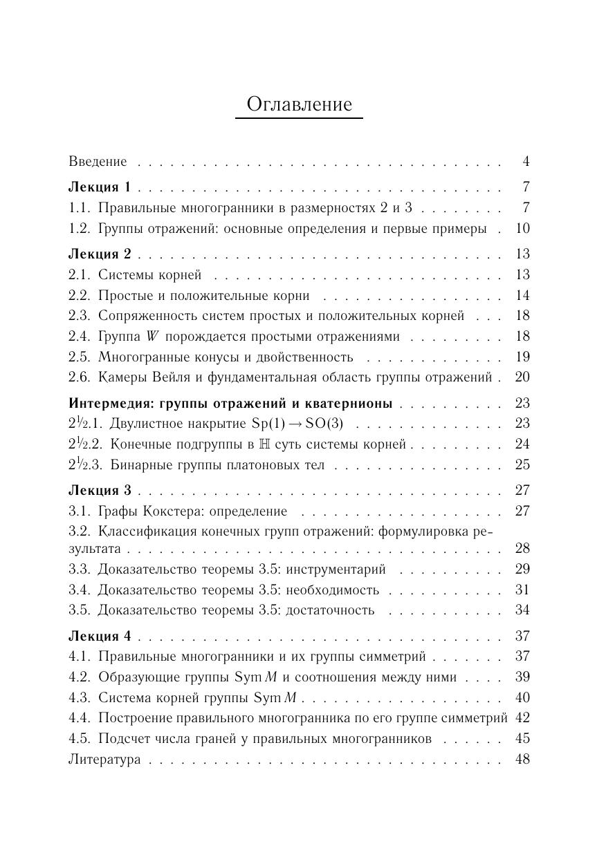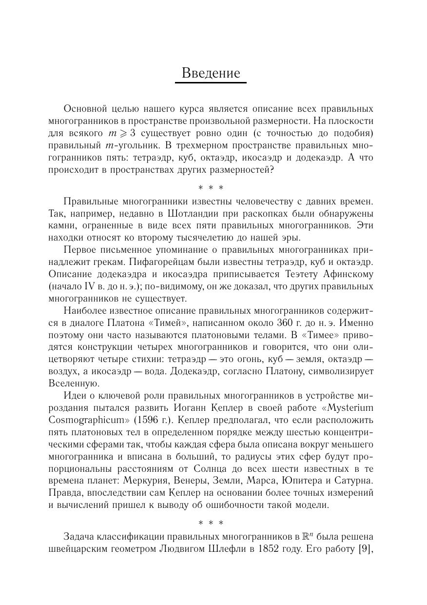 Брошюра написана по материалам цикла лекций, прочитанных автором участникам Летней школы «Современная математика» в Дубне 20–26 июля 2008 г. В ней излагается классификация правильных многогранников в евклидовом пространстве произвольной размерности. Попутно читатель знакомится с такими важными алгебраическими понятиями, как группы отражений и системы корней.Материал, изложенный в брошюре, иллюстрирует связь геометрии, теории групп и комбинаторики. Брошюра адресована студентам младших курсов.