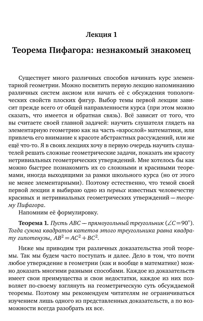 Книга содержитзаписи лекцийпо элементарной геометрии,прочитанных автором на математическом факультете МПГУ им.Ленина. В лекциях излагаются классические результаты элементарной геометриина плоскости, начинаяот теорем Пифагора,синусов и косинусов, и заканчивая важнейшими достижениями элементарной геометрии XIX— ХХ веков, теоремами Понселе, Морлея, Фейербаха и другими. Изложение ведется на традиционном школьном «синтетическом» языке, большое внимание уделяется разбору примеров применения изложенных результатов при решении различных задач, от школьных до олимпиадных. Книга предназначена для студентов педагогических специальностей, изучающих курс элементарной геометрии, школьников и учителей старших классов, а также для любителей геометрии.