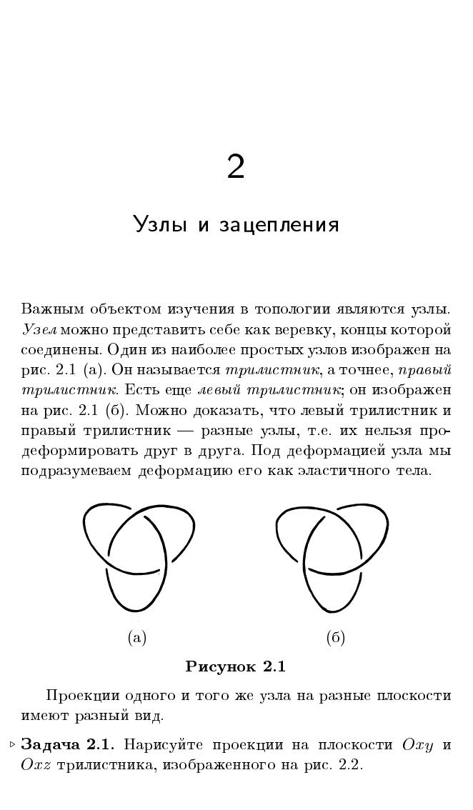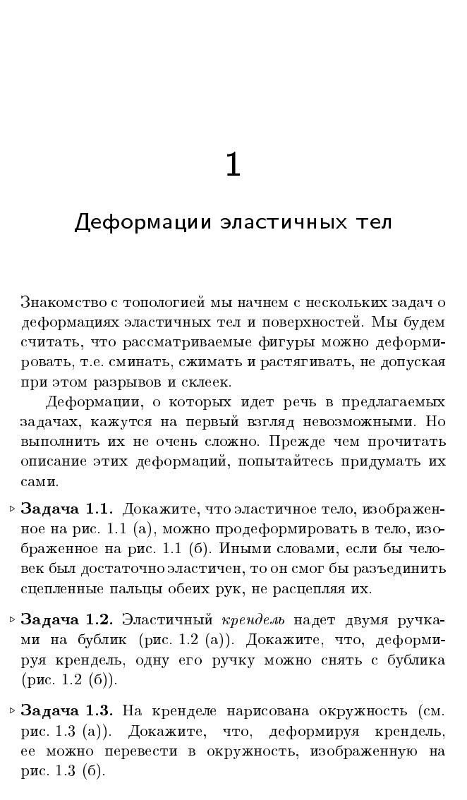 Книга представляет собой вводный курс топологии. Основные понятия сначала описываются на интуитивно понятном уровне, а затем постепенно уточняются и становятся вполне строгими. Это позволяет сразу же заняться содержательными топологическими задачами. Книга снабжена многочисленными иллюстрациями, которые нередко более важны для ее понимания, чем текст. Каждая глава содержит задачи, обдумывание которых поможет лучше усвоить излагаемый материал.Книга будет интересна всем, кто способен воспринимать изящество и элегантность геометрических конструкций и теорем. Для школьников, преподавателей математики, руководителей кружков, студентов младших курсов математических специальностей.
