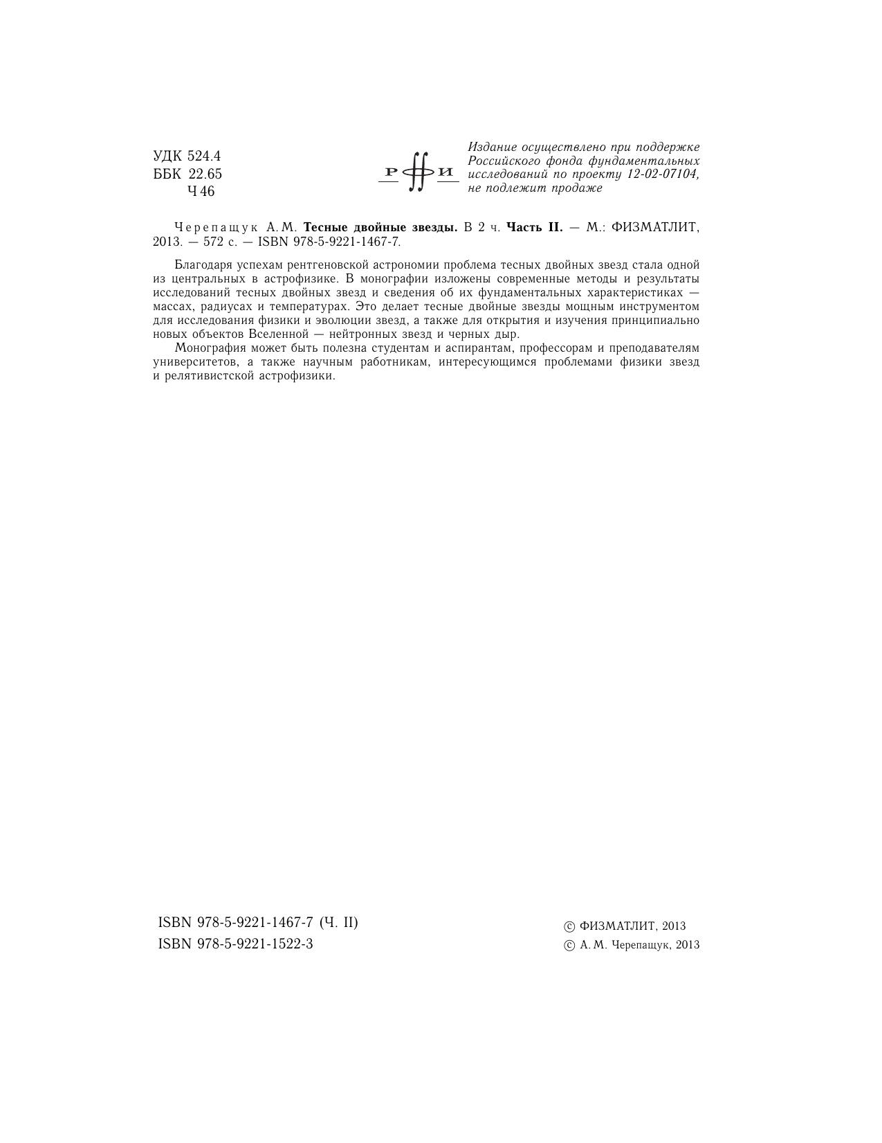 Благодаря успехам рентгеновской астрономии проблема тесных двойных звезд стала одной из центральных в астрофизике. В монографии изложены современные методы и результаты исследований тесных двойных звезд и сведения об их фундаментальных характеристиках — массах, радиусах и температурах. Это делает тесные двойные звезды мощным инструментом для исследования физики и эволюции звезд, а также для открытия и изучения принципиально новых объектов Вселенной — нейтронных звезд и черных дыр.