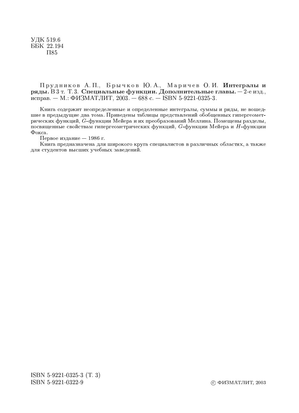 Книга содержит неопределенные и определенные интегралы, суммы и ряды, не вошедшие в предыдущие два тома. Приведены таблицы представлений обобщенных гипергеометрических функций, G-функций Мейера и их преобразований Меллина. Помещенны разделы, посвященные свойствам гипергеометрических функций, G-функций Мейера и Н-функций Фокса.Книга предназначена для широкого круга специалистов в различных областях знаний, а также для студентов вузов.