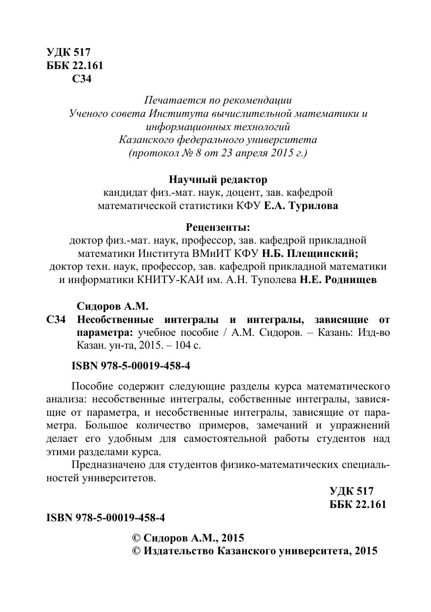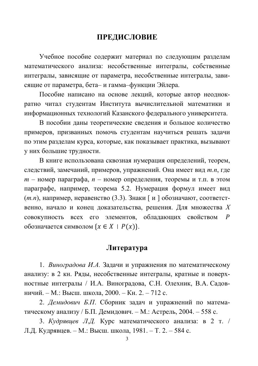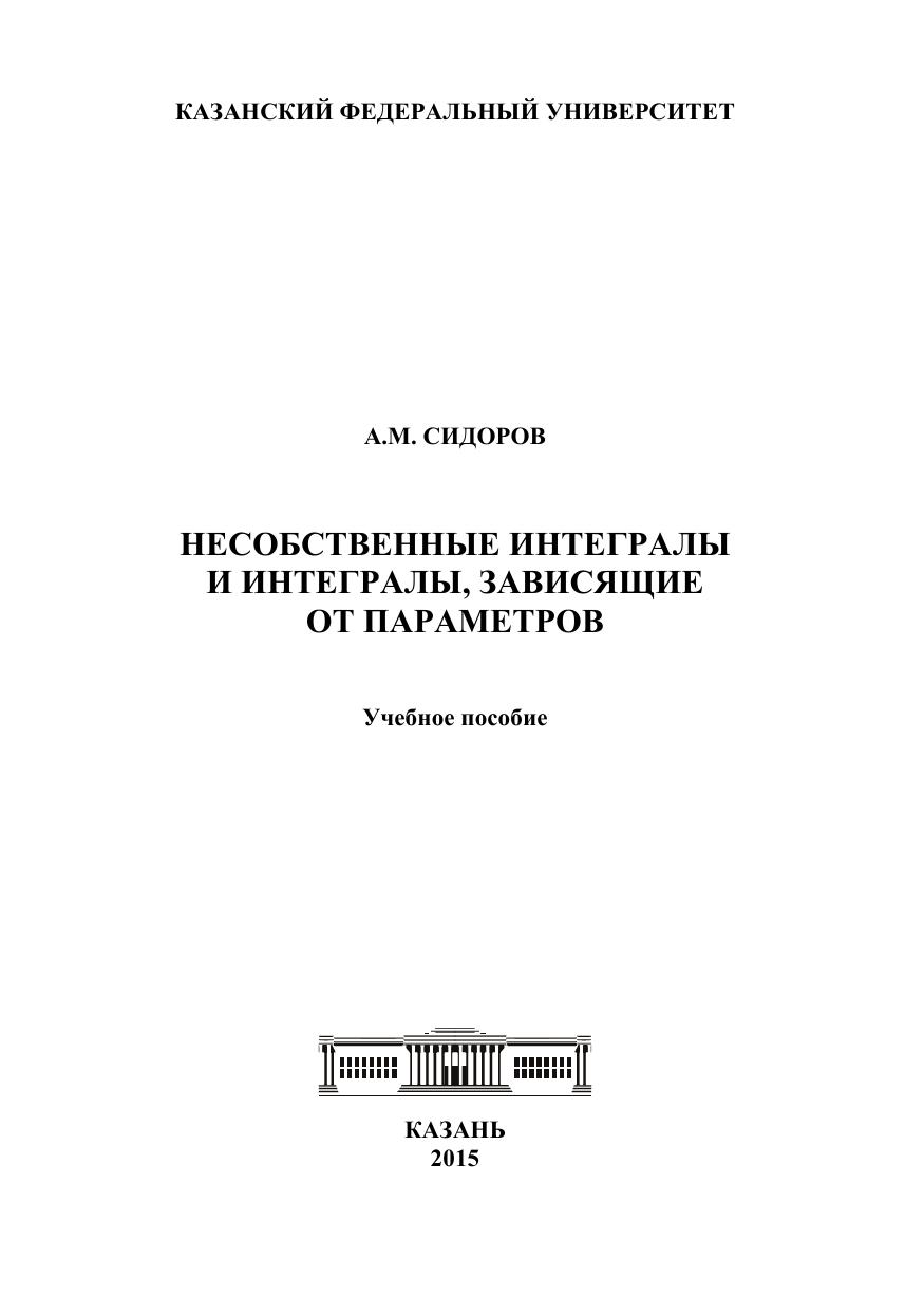 Пособие содержит следующие разделы курса математического анализа: несобственные интегралы, собственные интегралы, зависящие от параметра, и несобственные интегралы, зависящие от параметра. Большое количество примеров, замечаний и упражнений делает его удобным для самостоятельной работы студентов над этими разделами курса. Предназначено для студентов физико-математических специальностей университетов.