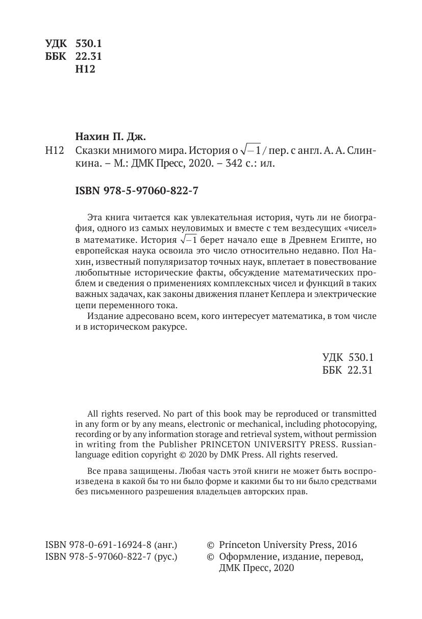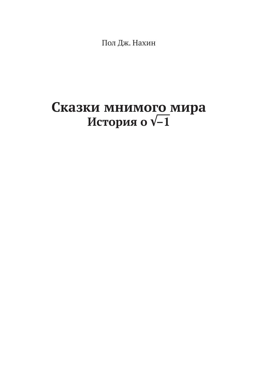 Эта книга читается как увлекательная история, чуть ли не биография, одного из самых неуловимых и вместе с тем вездесущих «чисел» в математике. История i берет начало еще в Древнем Египте, но европейская наука освоила это число относительно недавно. Пол Нахин, известный популяризатор точных наук, вплетает в повествование любопытные исторические факты, обсуждение математических проблем и сведения о применениях комплексных чисел и функций в таких важных задачах, как законы движения планет Кеплера и электрические цепи переменного тока.