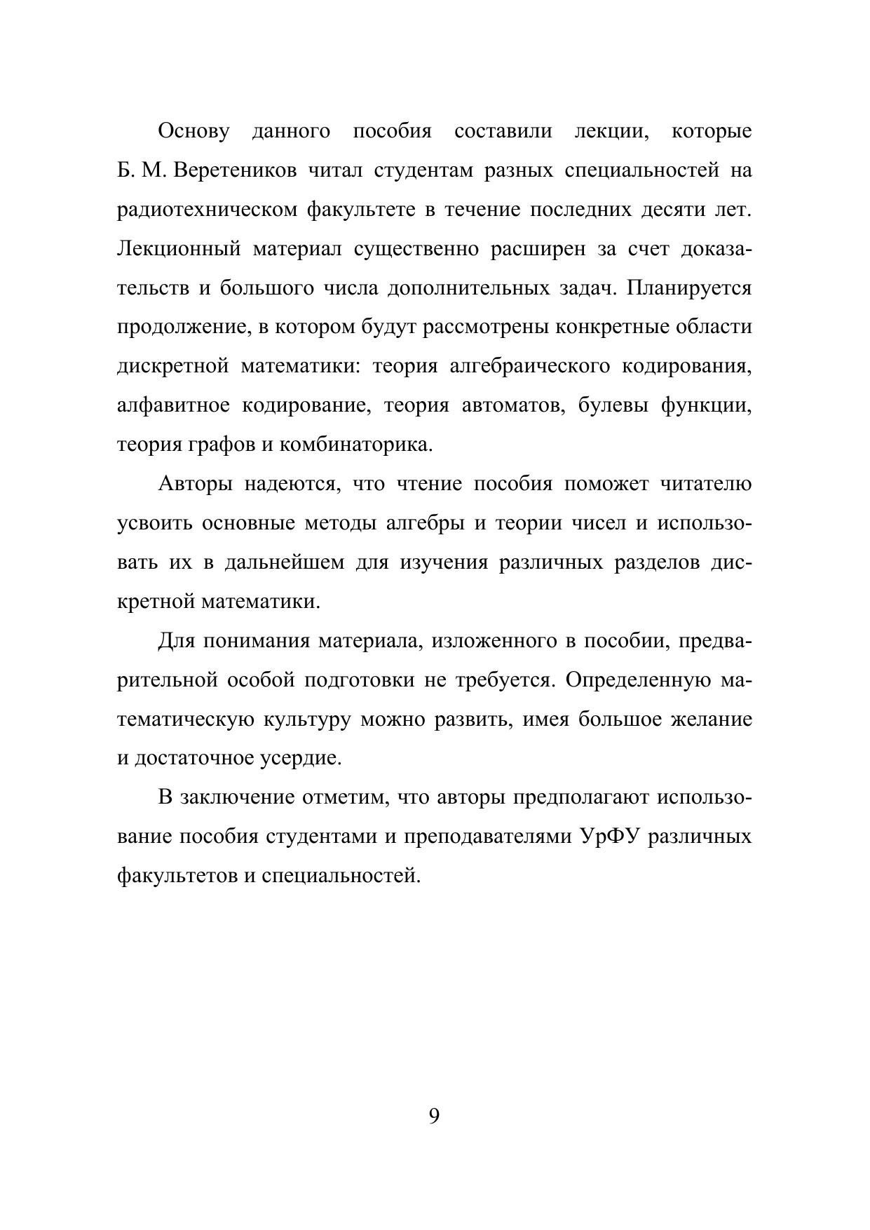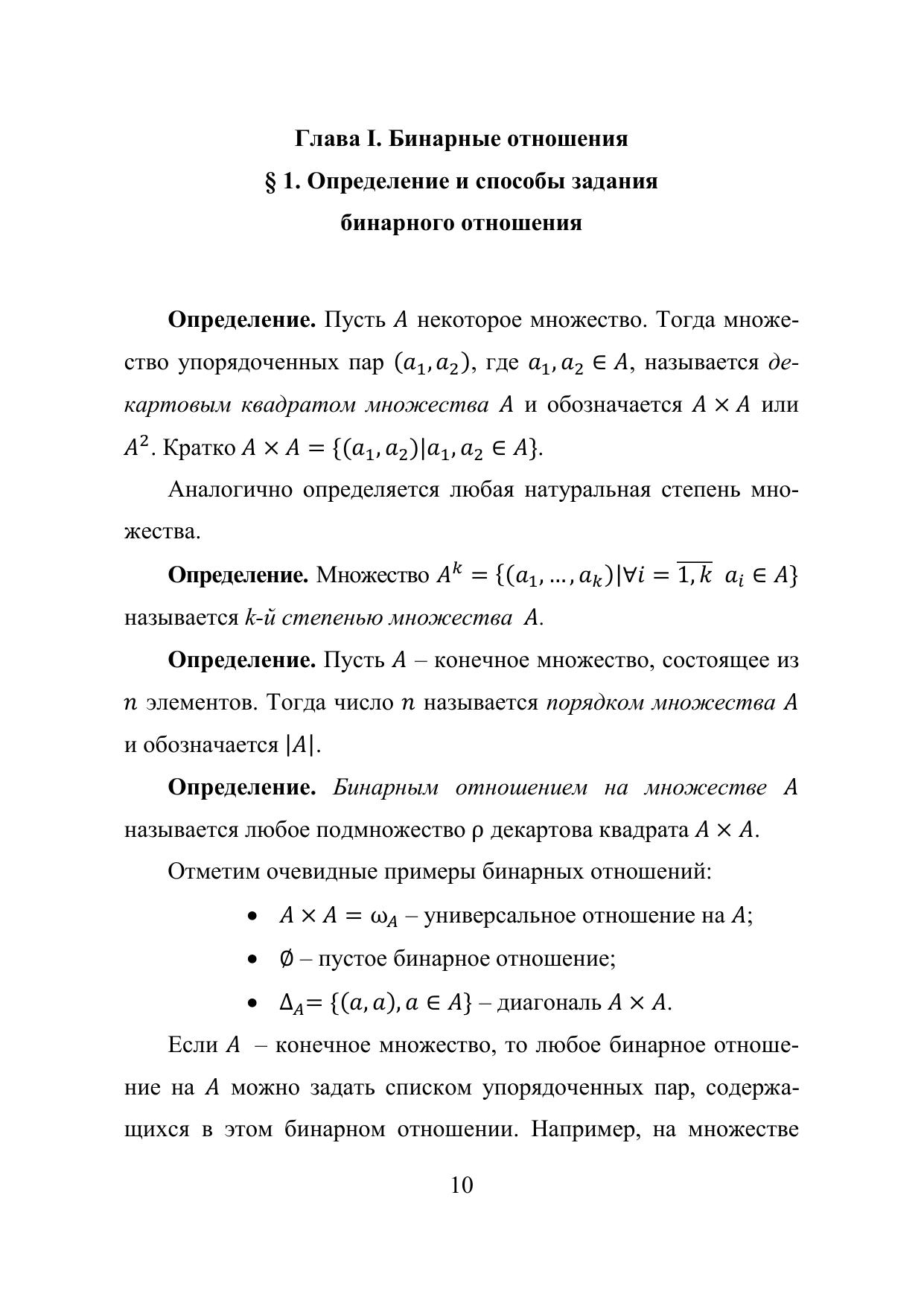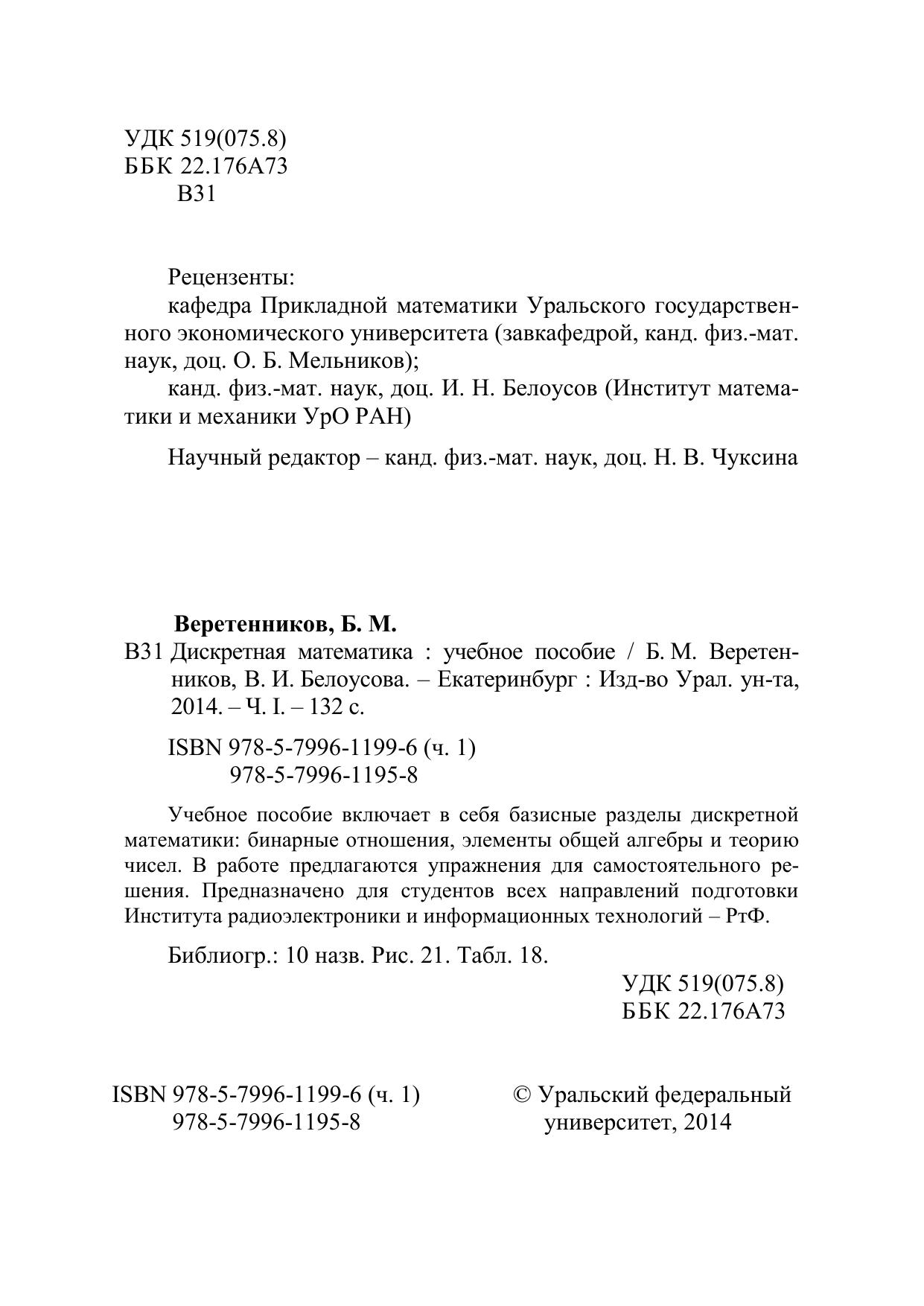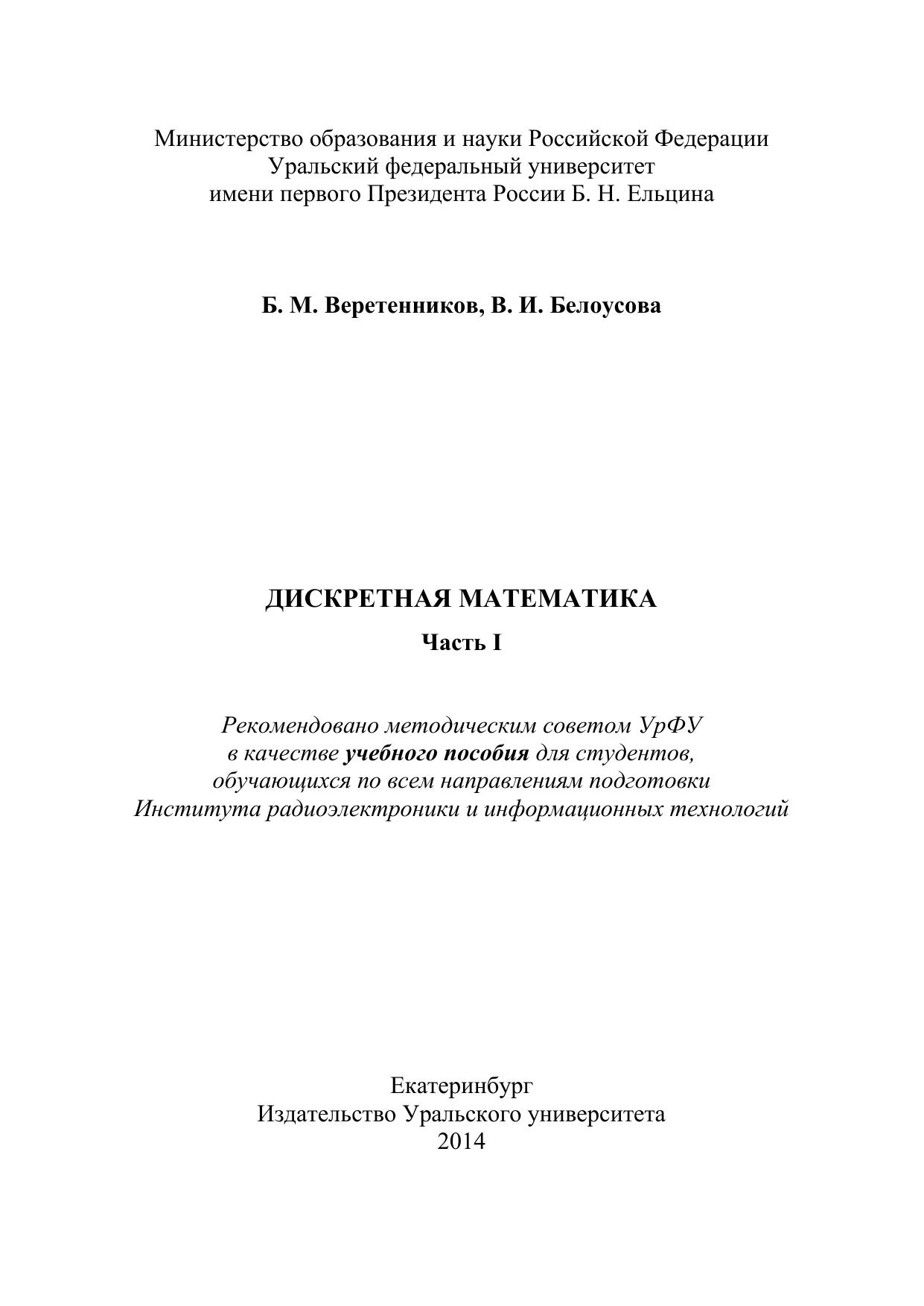 Учебное пособие включает в себя базисные разделы дискретной математики: бинарные отношения, элементы общей алгебры и теорию чисел. В работе предлагаются упражнения для самостоятельного решения. Предназначено для студентов всех направлений подготовки Института радиоэлектроники и информационных технологий – РтФ.