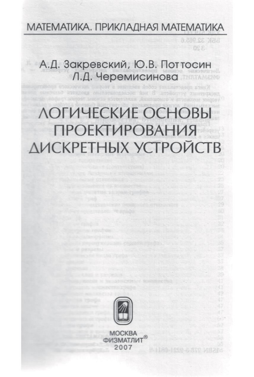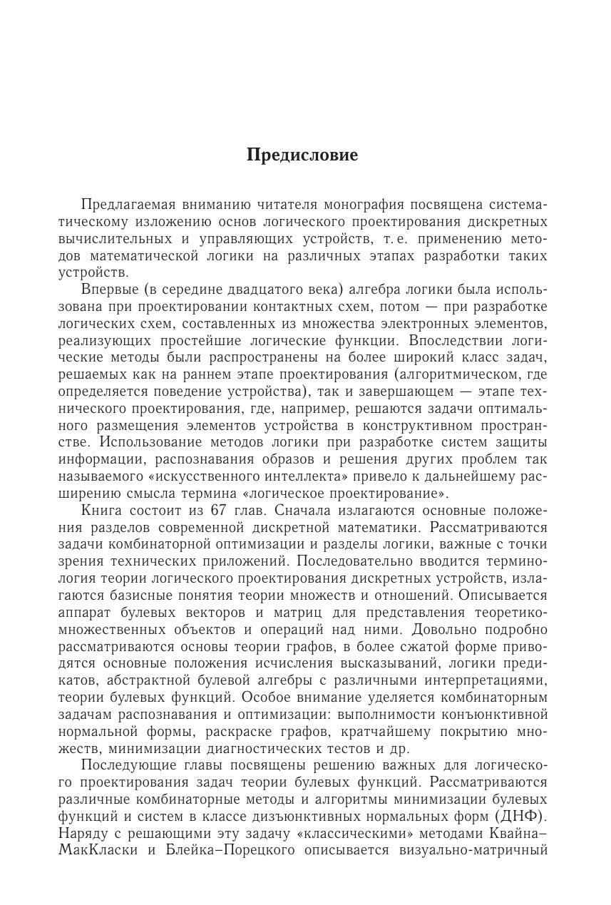 Книга представляет собой введение в теорию логического проектирования дискретных устройств. В ней последовательно вводятся базисные понятия теории множеств и отношений, излагаются основы теории графов, исчисления высказываний, логики предикатов, абстрактной булевой алгебры с различными интерпретациями. Особое внимание уделяется задачам комбинаторной оптимизации и разделам логики, важным с точки зрения технических приложений. Предназначается для специалистов в области проектирования дискретных устройств и может быть полезна для студентов и аспирантов, специализирующихся в данном направлении.