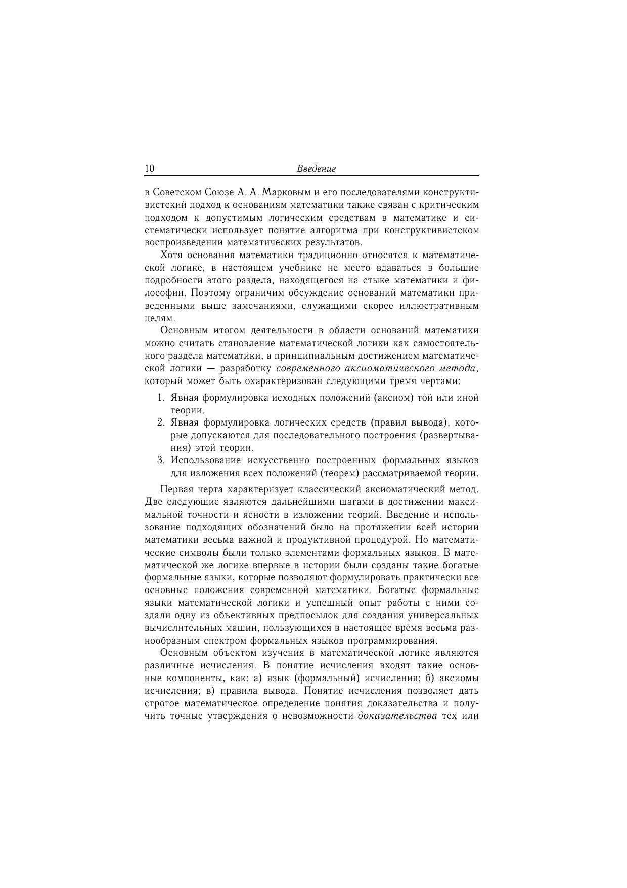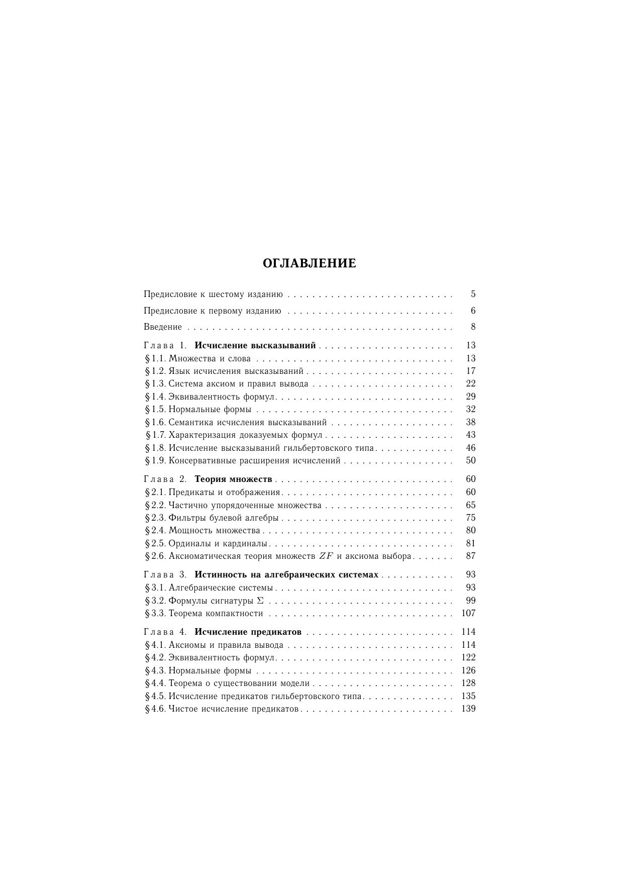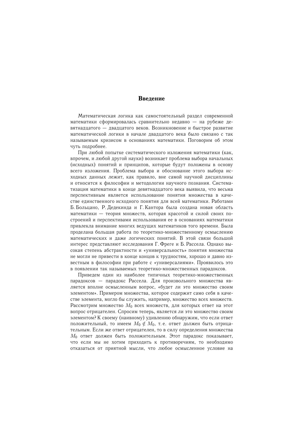 В книге изложены основные классические исчисления математической логики: исчисление высказываний и исчисление предикатов имеется краткое изложение основных понятий теории множеств и теории алгоритмов. Ряд разделов книги — теория моделей и теория доказательств — изложены более подробно, чем это предусмотрено программой. Для студентов математических специальностей вузов. Может служить пособием для специальных курсов.