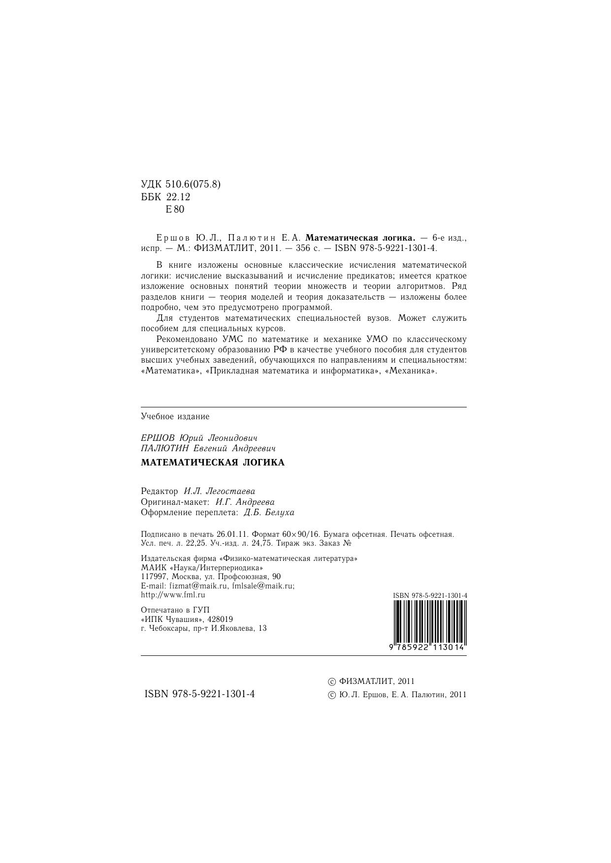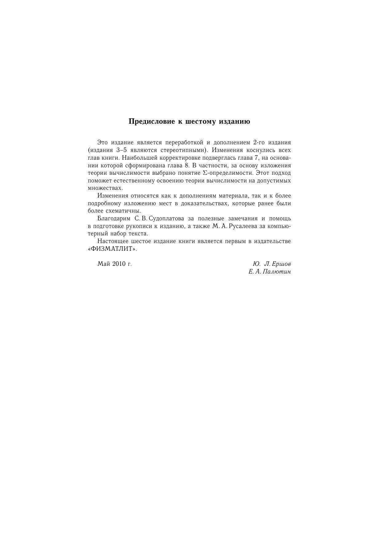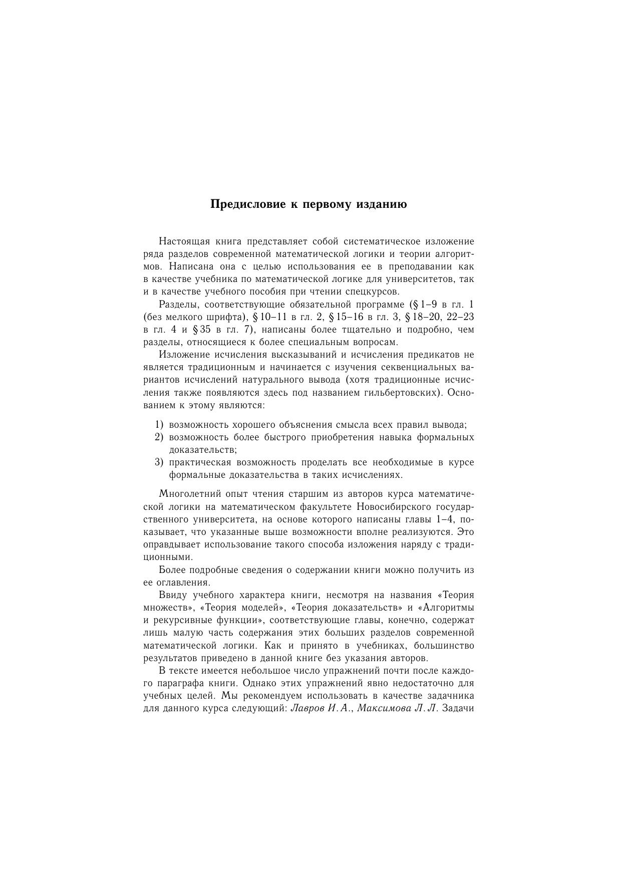 В книге изложены основные классические исчисления математической логики: исчисление высказываний и исчисление предикатов имеется краткое изложение основных понятий теории множеств и теории алгоритмов. Ряд разделов книги — теория моделей и теория доказательств — изложены более подробно, чем это предусмотрено программой. Для студентов математических специальностей вузов. Может служить пособием для специальных курсов.