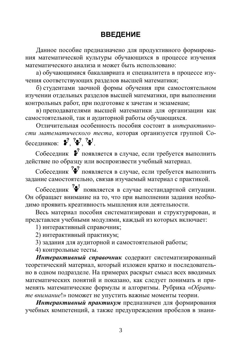 Данная книга представляет собой интерактивное учебное пособие, в котором кратко и последовательно изложен курс математического анализа. Каждый раздел содержит теоретические сведения, интерактивный практикум, задания для аудиторного и самостоятельного решения и систему контрольных тестов. Соответствует современным требованиям Федерального государственного образовательного стандарта среднего профессионального образования и профессиональным квалификационным требованиям. Пособие предназначено для студентов средних профессиональных учреждений.
