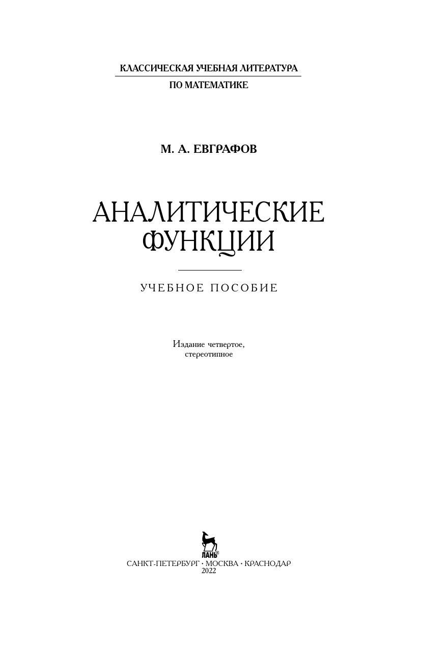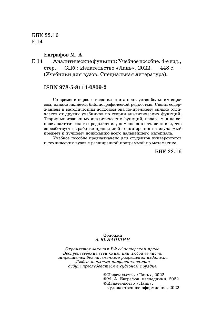 Со времени первого издания книга пользуется большим спросом, однако является библиографической редкостью. Своим содержанием и методическим подходом она по-прежнему сильно отличается от других учебников по теории аналитических функций. Теория многозначных аналитических функций, излагаемая на основе аналитического продолжения, помещена в начале книги, что способствует выработке правильной точки зрения на изучаемый предмет и лучшему пониманию всего дальнейшего материала. Учебное пособие предназначено для студентов университетов и технических вузов с расширенной программой по математике.