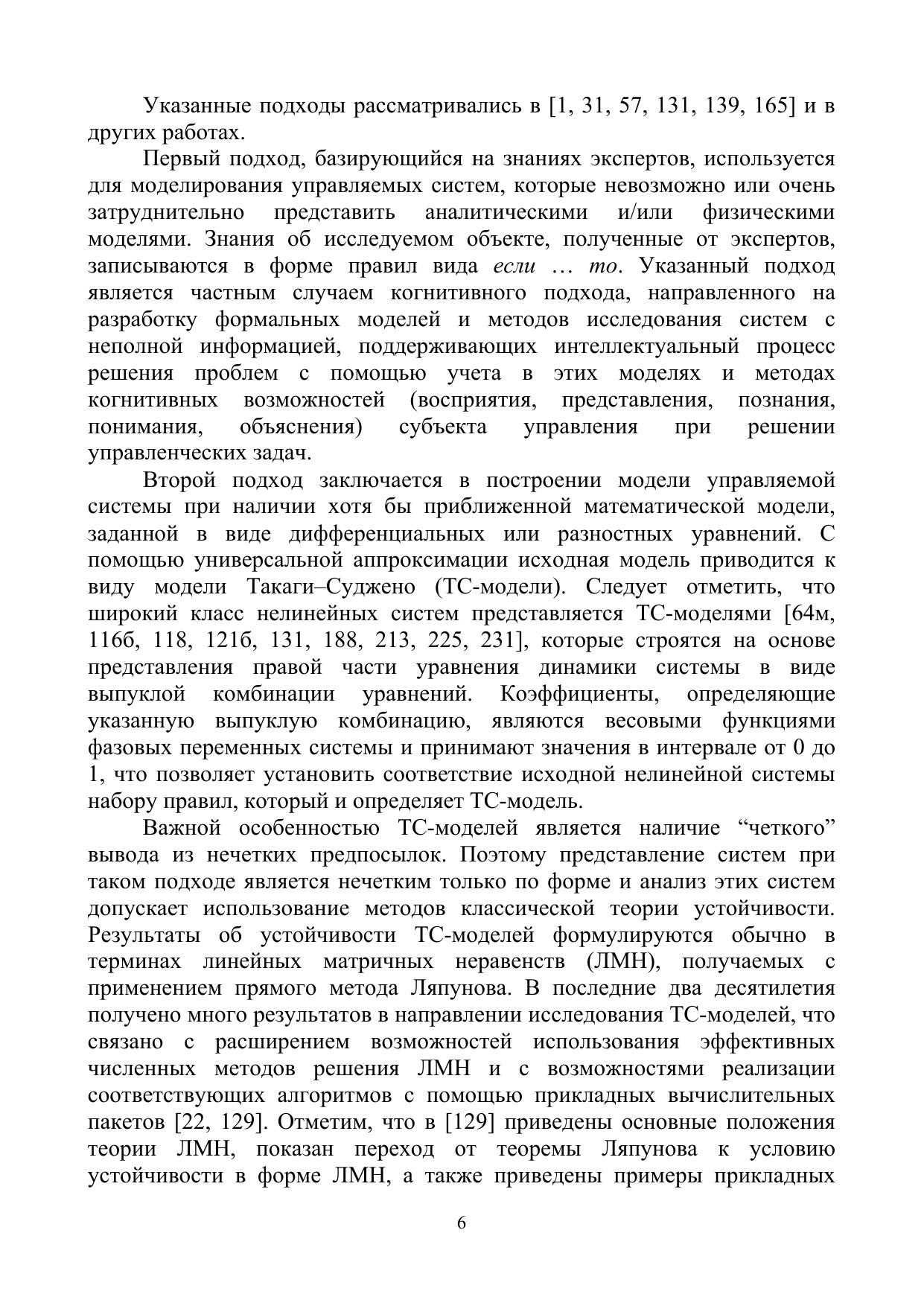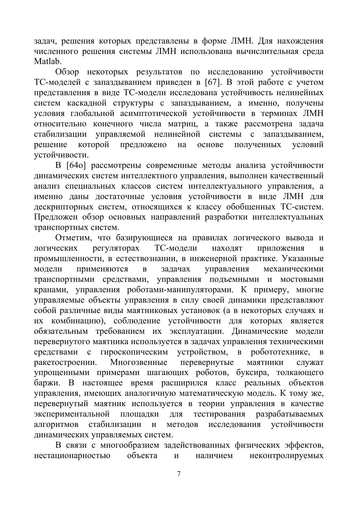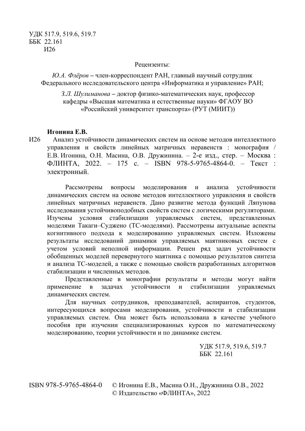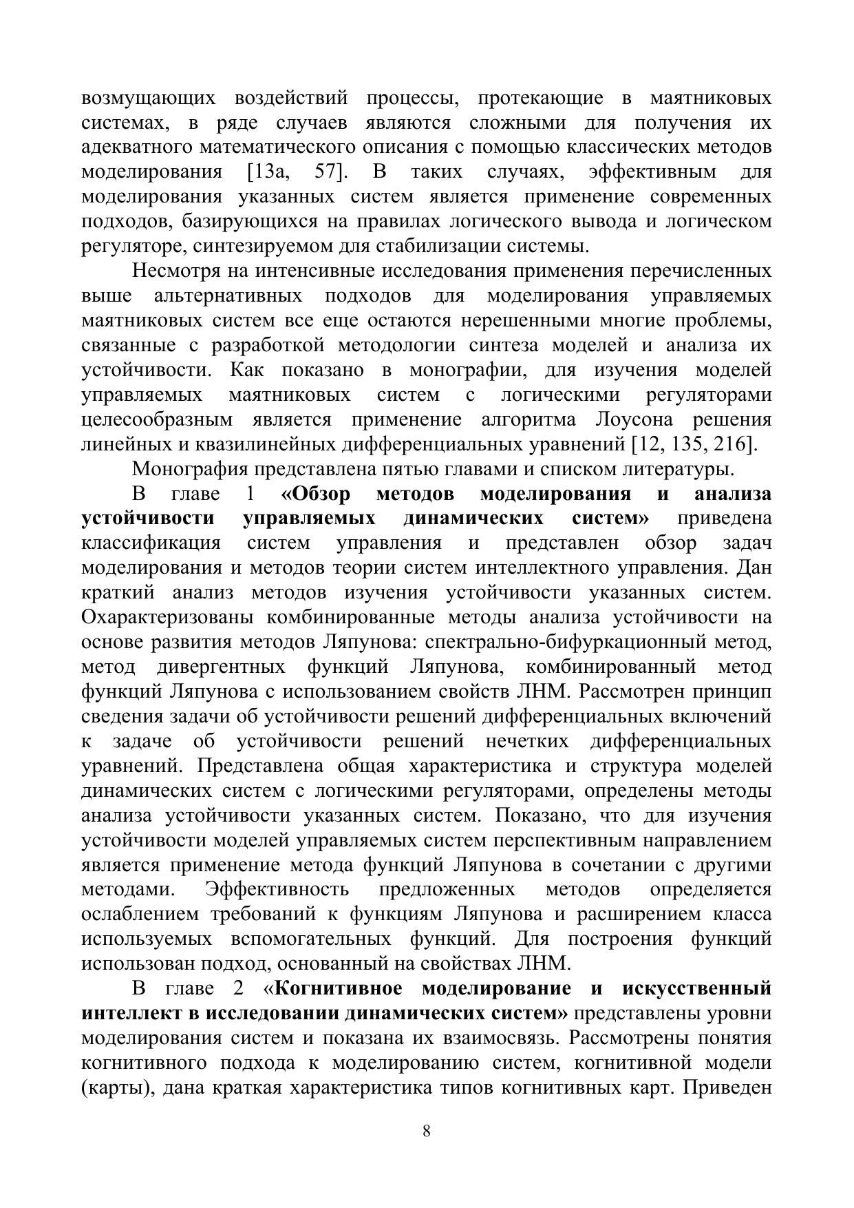 Рассмотрены вопросы моделирования и анализа устойчивости динамических систем на основе методов интеллектного управления и свойств линейных матричных неравенств. Дано развитие метода функций Ляпунова исследования устойчивоподобных свойств систем с логическими регуляторами. Изучены условия стабилизации управляемых систем, представленных моделями Такаги–Суджено (ТС-моделями). Рассмотрены актуальные аспекты когнитивного подхода к моделированию управляемых систем. Изложены результаты исследований динамики управляемых маятниковых систем с учетом условий неполной информации. Решен ряд задач устойчивости обобщенных моделей перевернутого маятника с помощью результатов синтеза и анализа ТС-моделей, а также с помощью свойств разработанных алгоритмов стабилизации и численных методов.