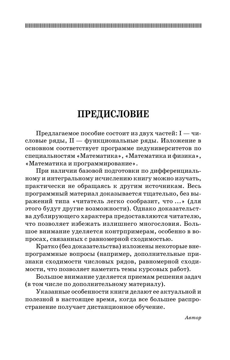 В учебном пособии дан необходимый теоретический материал по числовым и функциональным рядам. Кратко изложены дополнительные внепрограммные вопросы (например, дополнительные признаки сходимости числовых рядов, равномерной сходимости), что позволяет наметить темы курсовых работ. Большое внимание уделяется приемам решения задач. Указанные особенности книги делают ее актуальной и полезной в настоящее время, когда все большее распространение получает дистанционное обучение. Адресовано студентам специальностей «Математика», «Математика и физика», «Математика и программирование» педагогических университетов и соответствует государственным стандартам по этим специальностям, а также бакалаврам по направлению подготовки «Педагогическое образование» профиля «Математическое образование».