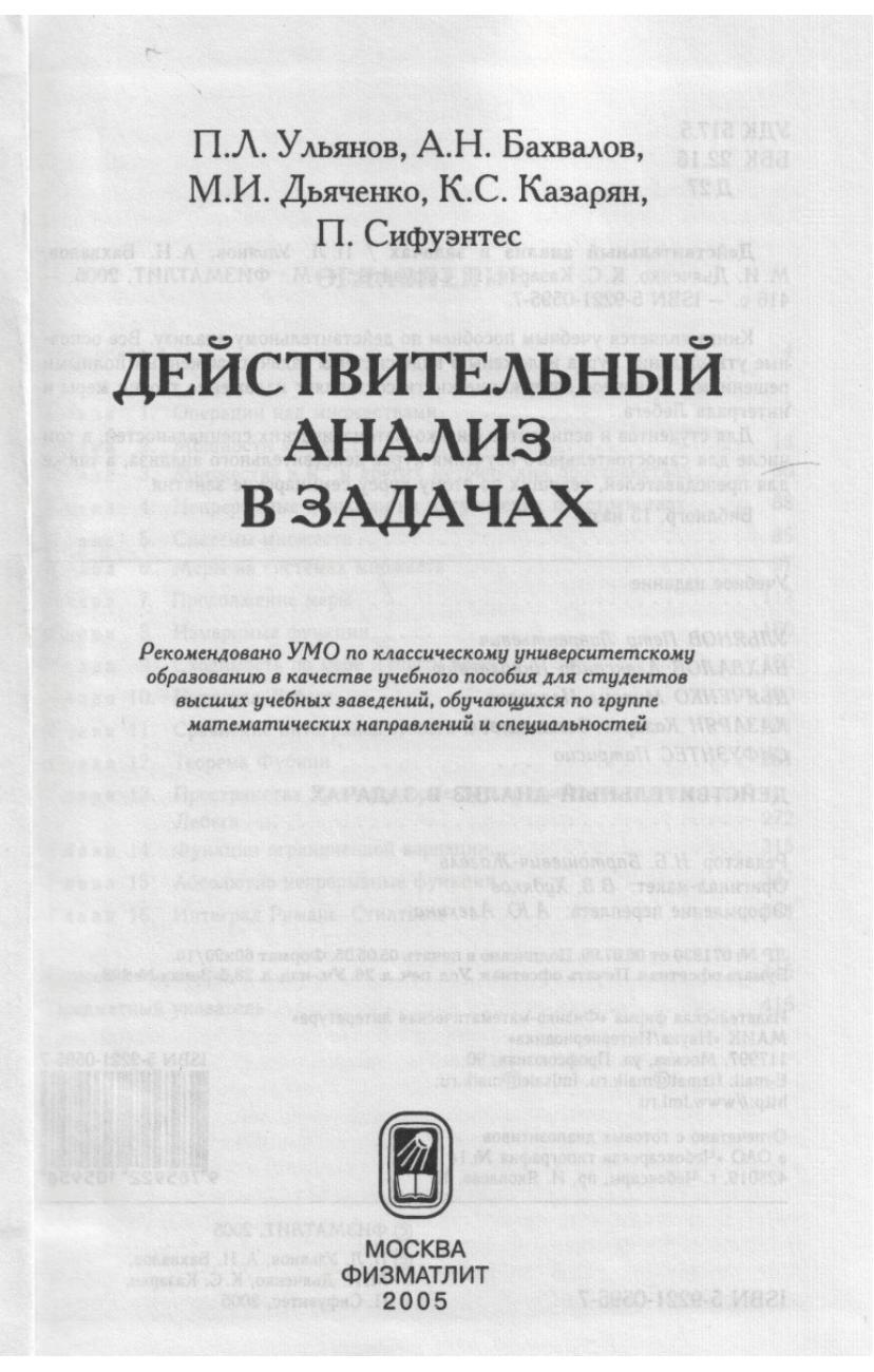 Книга является учебным пособием по действительному анализу. Все основные утверждения курса изложены в виде системы задач, снабженных полными решениями. Основное содержание книги составляет изложение теории меры и интеграла Лебега. Для студентов и аспирантов физико-математических специальностей, в том числе для самостоятельного изучения курса действительного анализа, а также для преподавателей, ведущих по этому курсу семинарские занятия.