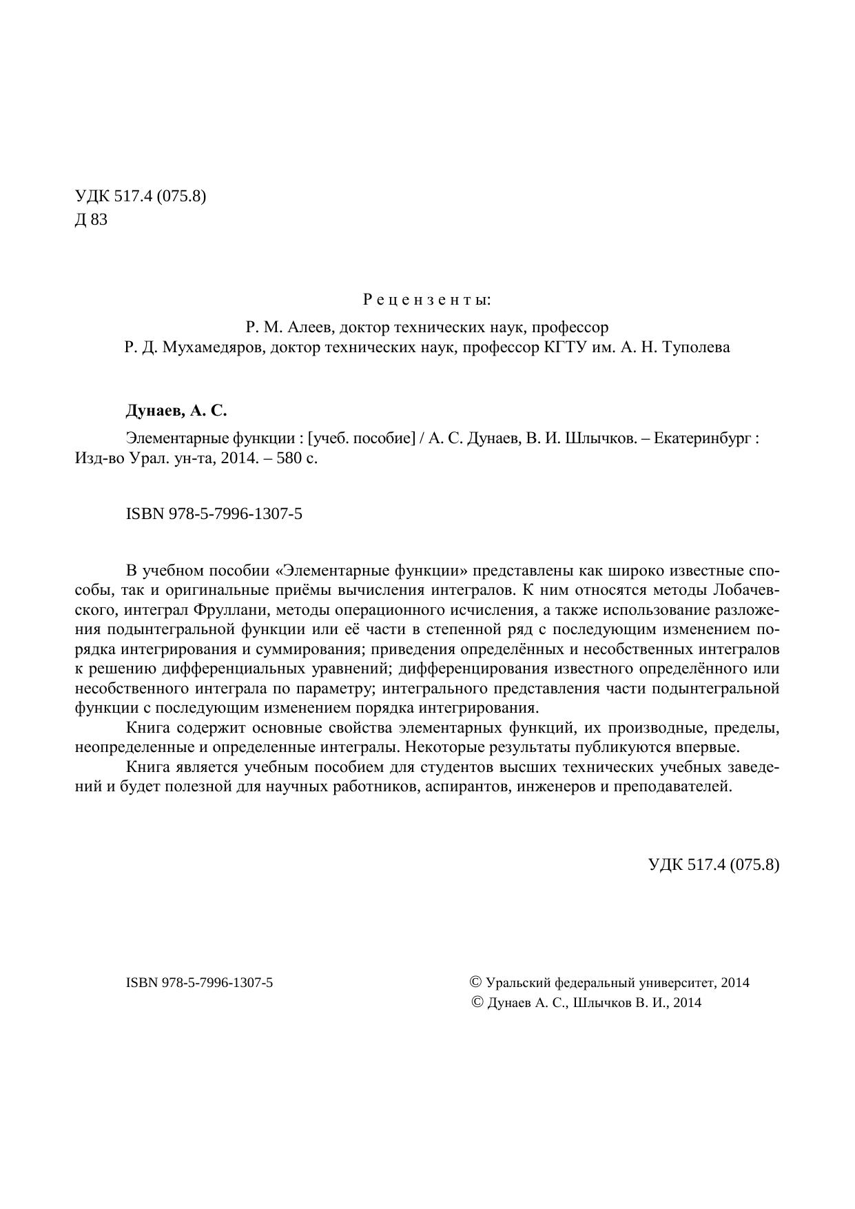 В учебном пособии «Элементарные функции» представлены как широко известные способы, так и оригинальные приёмы вычисления интегралов. К ним относятся методы Лобачевского, интеграл Фруллани, методы операционного исчисления, а также использование разложения подынтегральной функции или её части в степенной ряд с последующим изменением порядка интегрирования и суммирования; приведения определённых и несобственных интегралов к решению дифференциальных уравнений; дифференцирования известного определённого или несобственного интеграла по параметру; интегрального представления части подынтегральной функции с последующим изменением порядка интегрирования. Книга содержит основные свойства элементарных функций, их производные, пределы, неопределенные и определенные интегралы. Некоторые результаты публикуются впервые. Книга является учебным пособием для студентов высших технических учебных заведений и будет полезной для научных работников, аспирантов, инженеров и преподавателей.