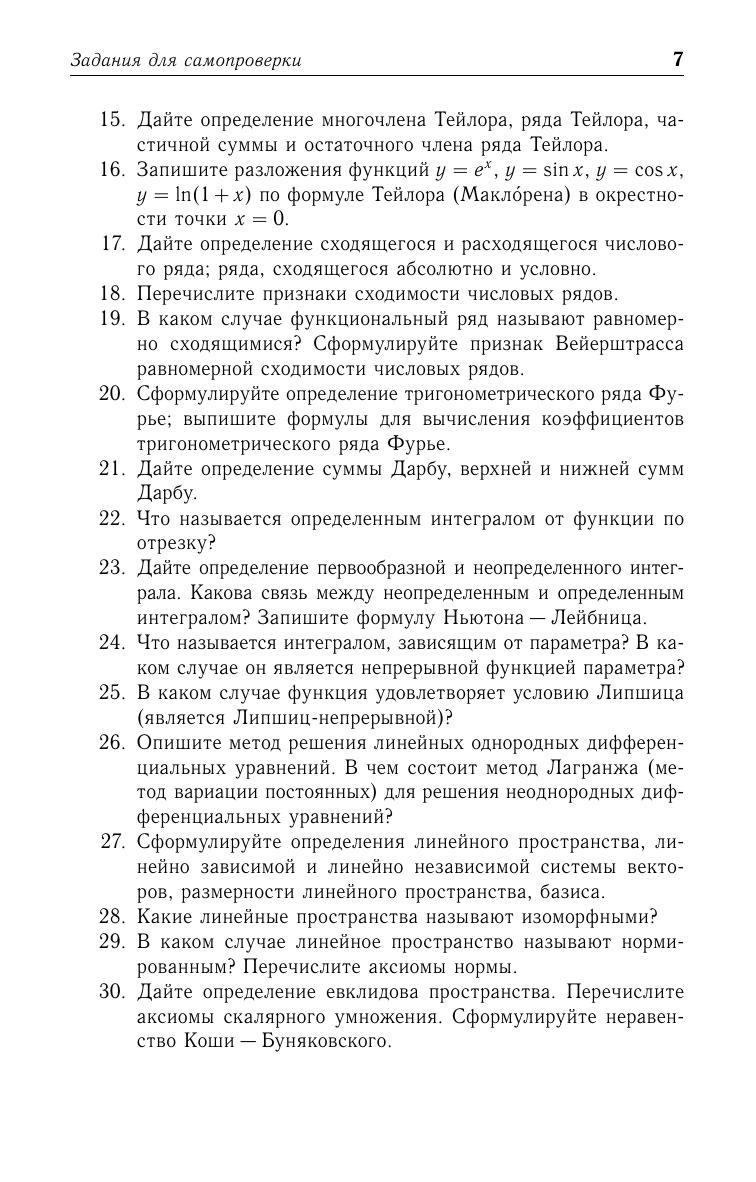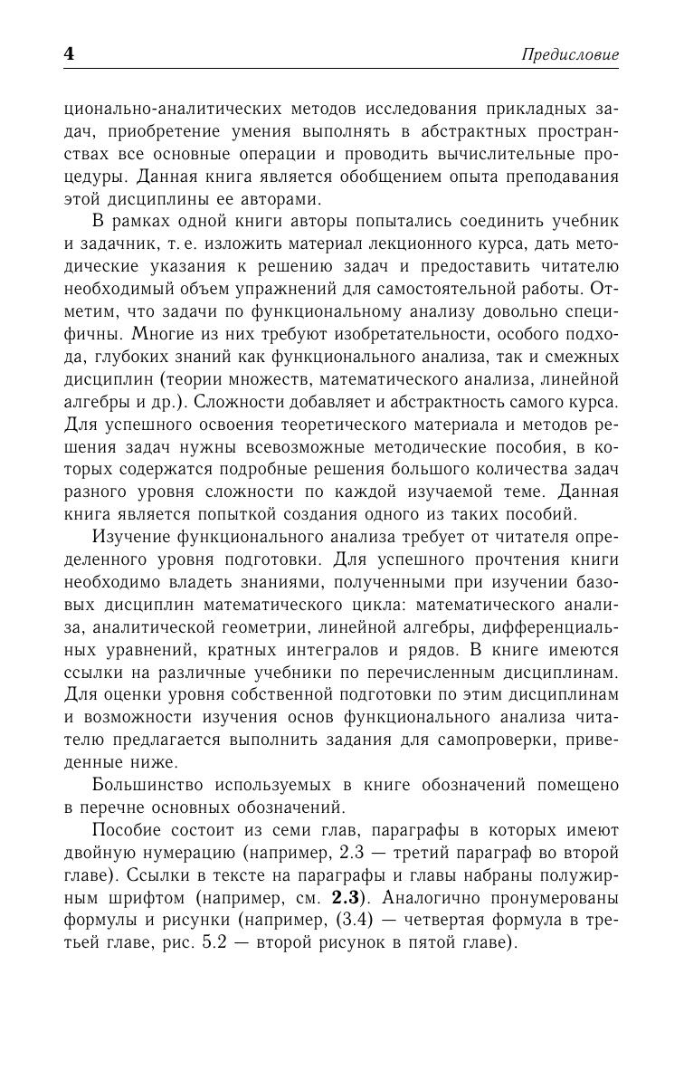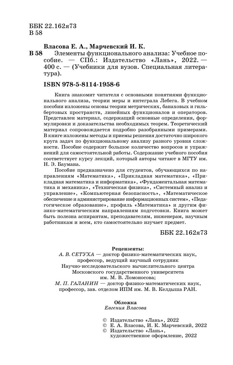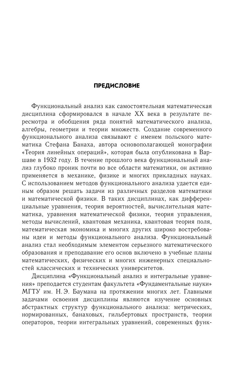 Книга знакомит читателя с основными понятиями функционального анализа, теории меры и интеграла Лебега. В учебном пособии изложены основы теории метрических, банаховых и гильбертовых пространств, линейных функционалов и операторов. Представлен материал, содержащий основные определения, формулировки и доказательства необходимых теорем. Теоретический материал сопровождается подробно разобранными примерами. В книге изложены методы и приемы решения достаточно широкого круга задач по функциональному анализу разного уровня слож-ности. Пособие содержит большое количество вопросов и упражнений для самостоятельной работы. Содержание учебного пособия соответствует курсу лекций, который авторы читают в МГТУ им. Н. Э. Баумана. Пособие предназначено для студентов, обучающихся по направлениям «Математика», «Прикладная математика», «При-кладная математика и информатика», «Фундаментальная математика и механика», «Техническая физика», «Системный анализ и управление», «Компьютерная безопасность», «Математическое обеспечение и администрирование информационных систем», «Педагогическое образование», профиль «Математика» и другим физико-математическим направлениям подготовки. Книга может быть полезна аспирантам, преподавателям, инженерам, научным работникам и всем, кто самостоятельно изучает предмет.