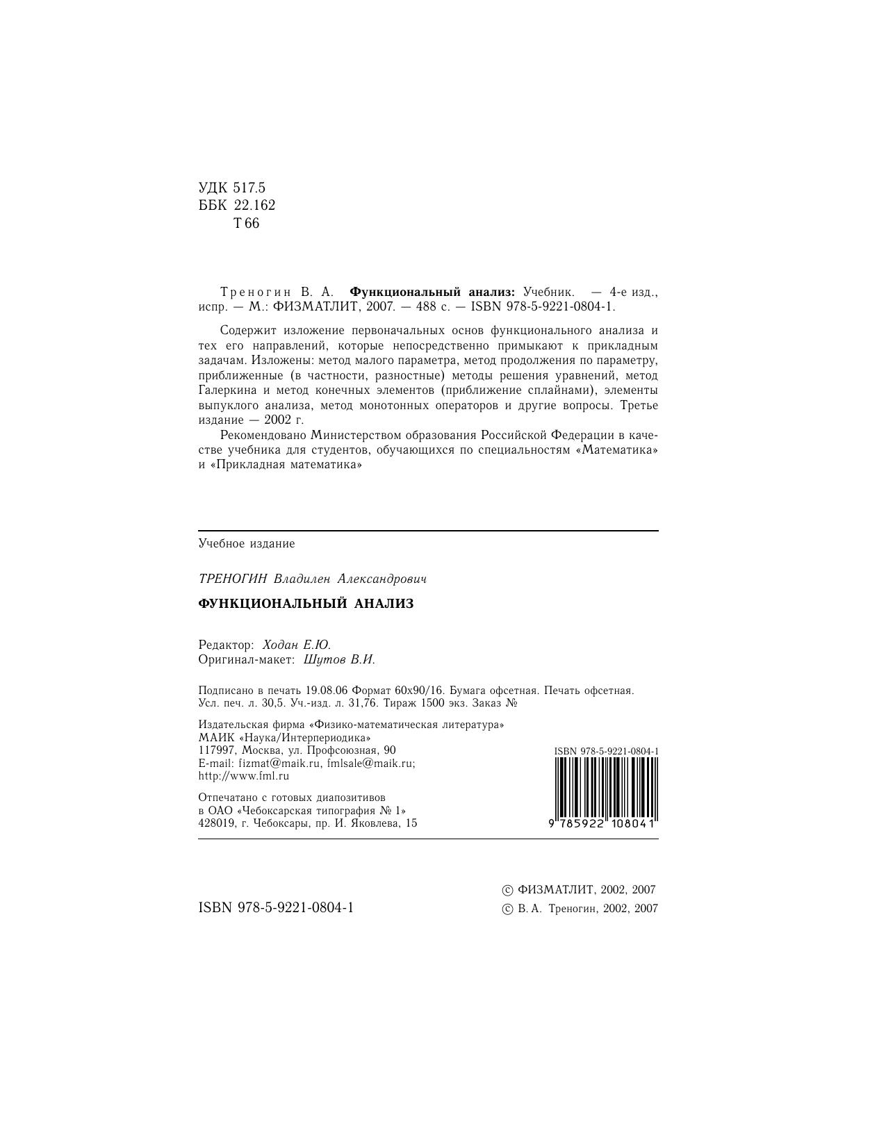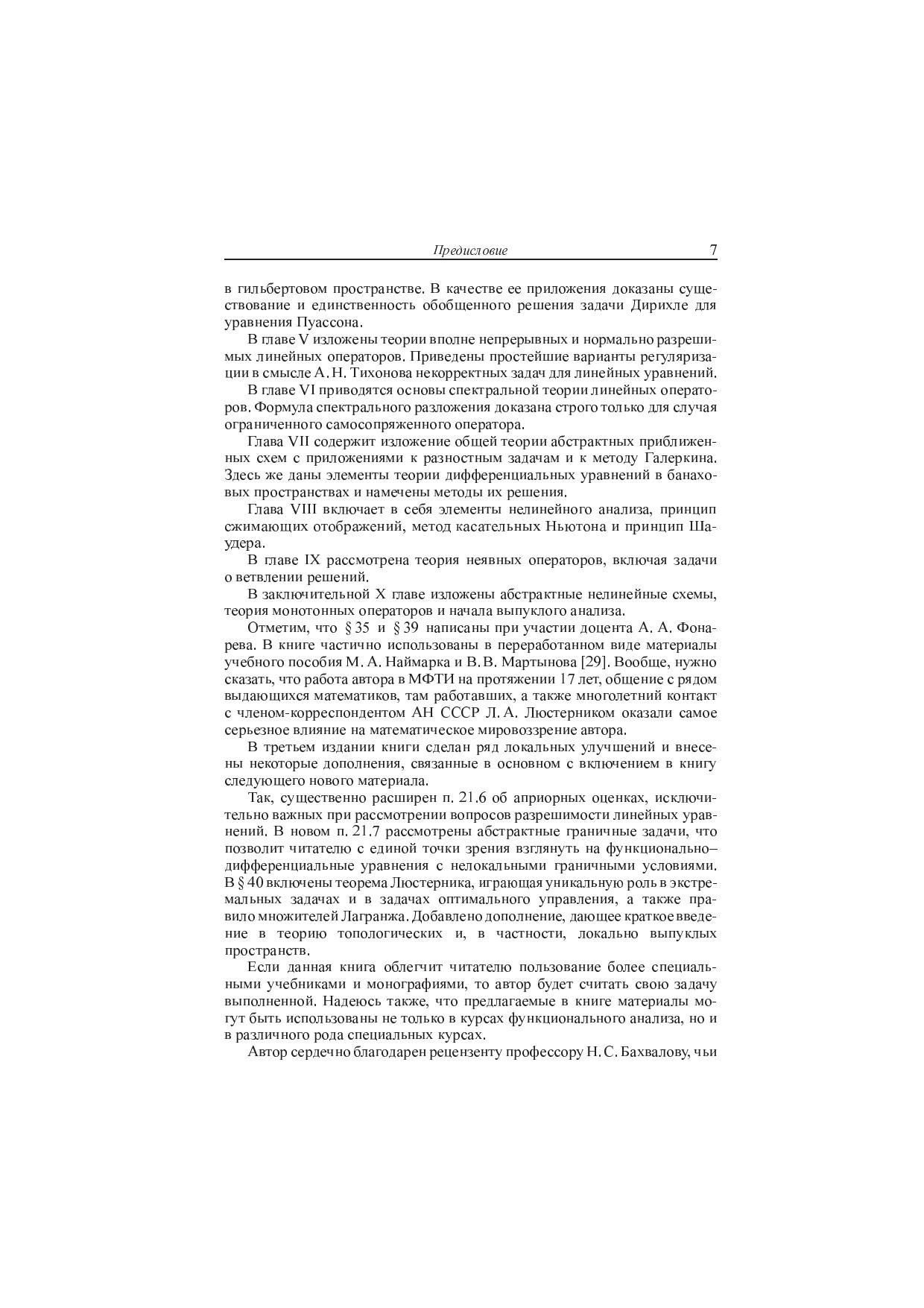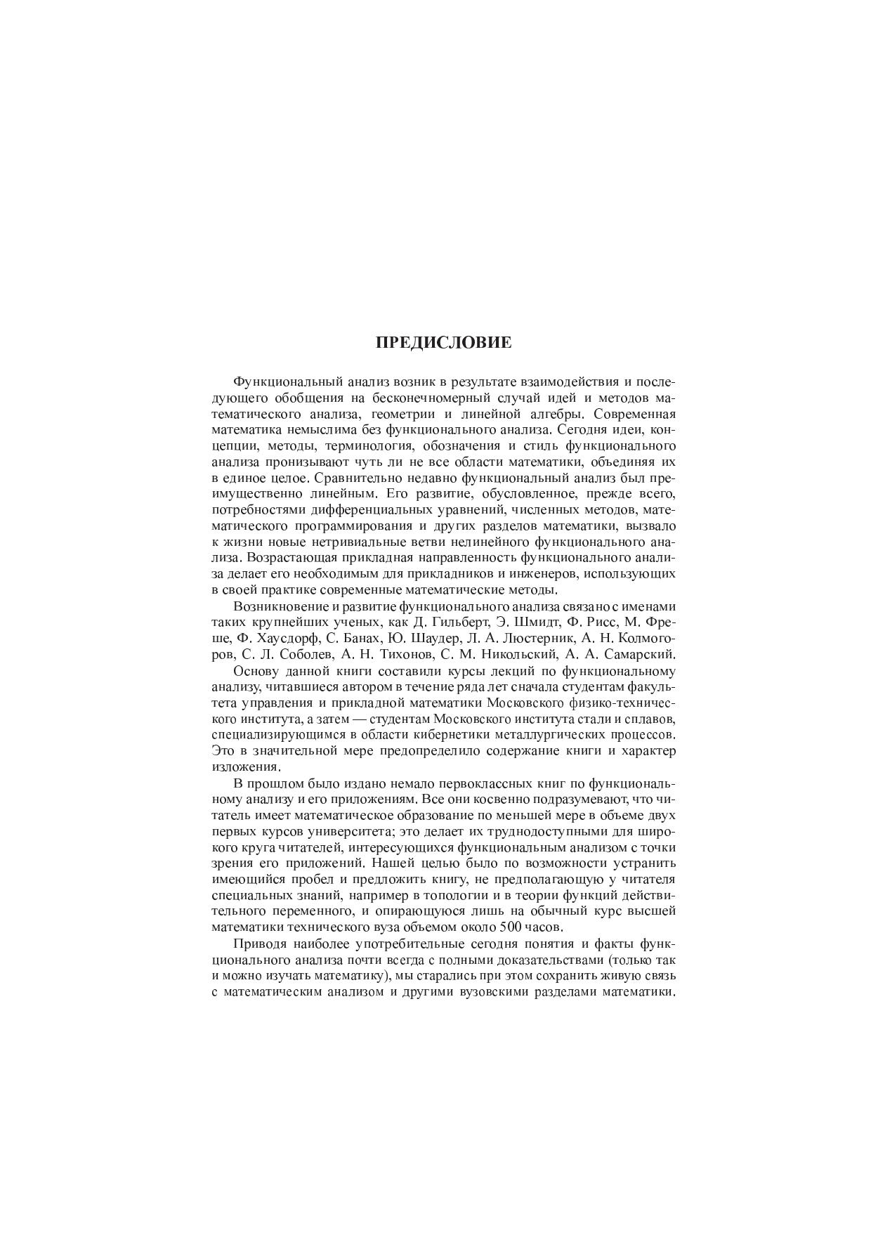 Содержит изложение первоначальных основ функционального анализа и тех его направлений, которые непосредственно примыкают к прикладным задачам. Изложены: метод малого параметра, метод продолжения по параметру, приближенные (в частности, разностные) методы решения уравнений, метод Галеркина и метод конечных элементов (приближение сплайнами), элементы выпуклого анализа, метод монотонных операторов и другие вопросы. Третье издание - 2002 г. Рекомендовано Министерством образования Российской Федерации в качестве учебника для студентов, обучающихся по специальностям «Математика» и «Прикладная математика»